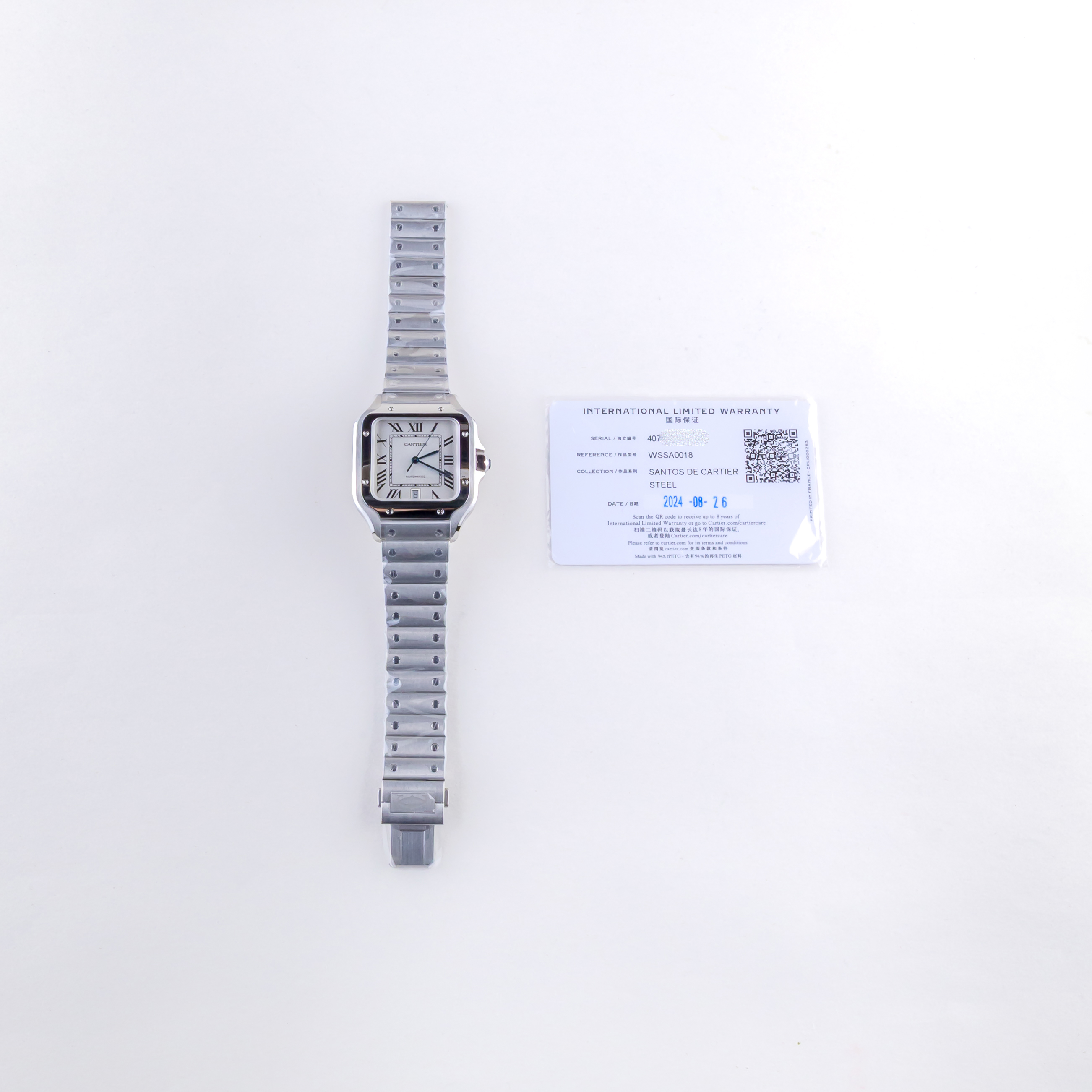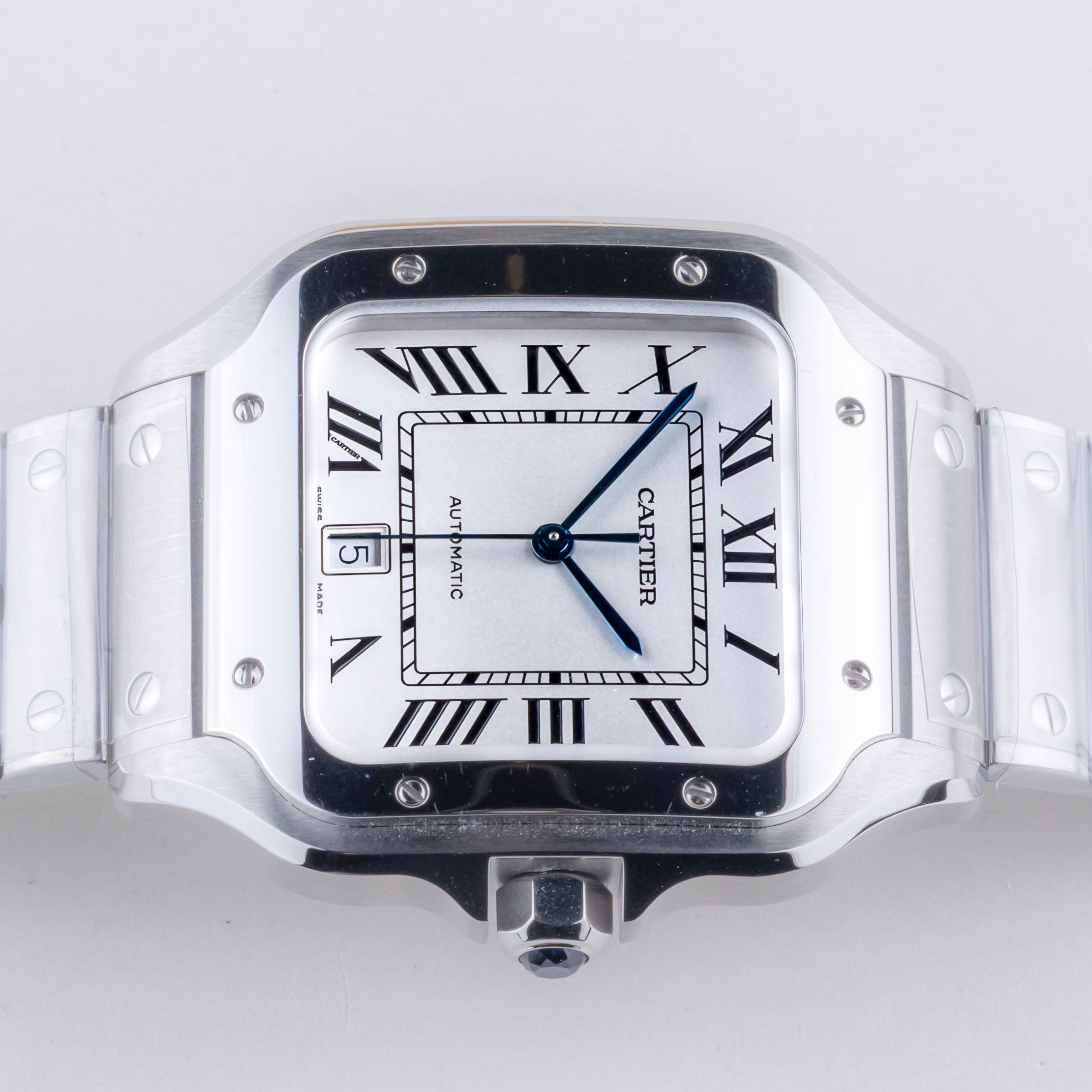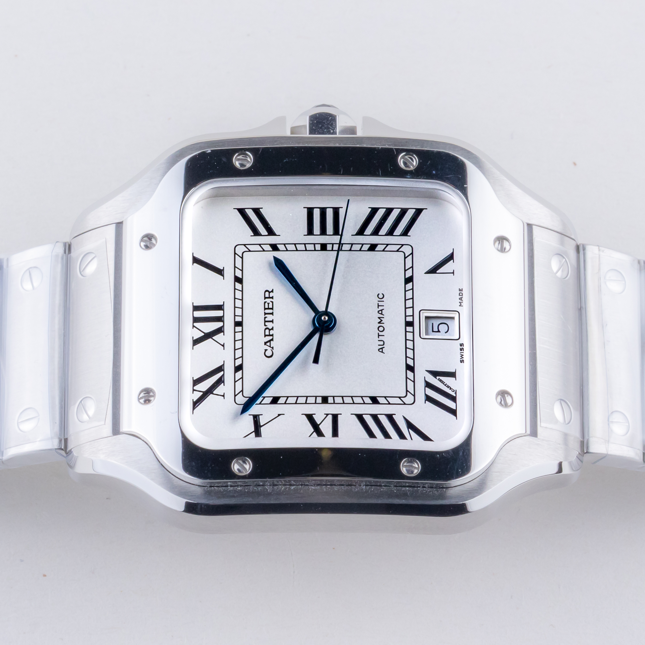 Lesen Sie mehr... >Cartier Santos groß Referenz WSSA0018 einschließlich vollständiger Satz. Die Cartier Santos hat ein 47.5 mm x 39.8 mm großes Edelstahlgehäuse (9,38 mm dick), eine glatte Edelstahllünette und ein Armband mit verdeckter Schmetterlingsschließe. Die Cartier Santos WSSA0018 hat ein silberfarbenes Opalinenzifferblatt mit den klassischen schwarzen römischen Indexen und blauen Zeigern im Cartier-Stil. Diese Cartier Santos WSSA0018 hat ein Automatikwerk mit Saphirglas auf der Oberseite. Zwischen den Kronenschützern der Uhr befindet sich die markante blaue Saphirkrone.