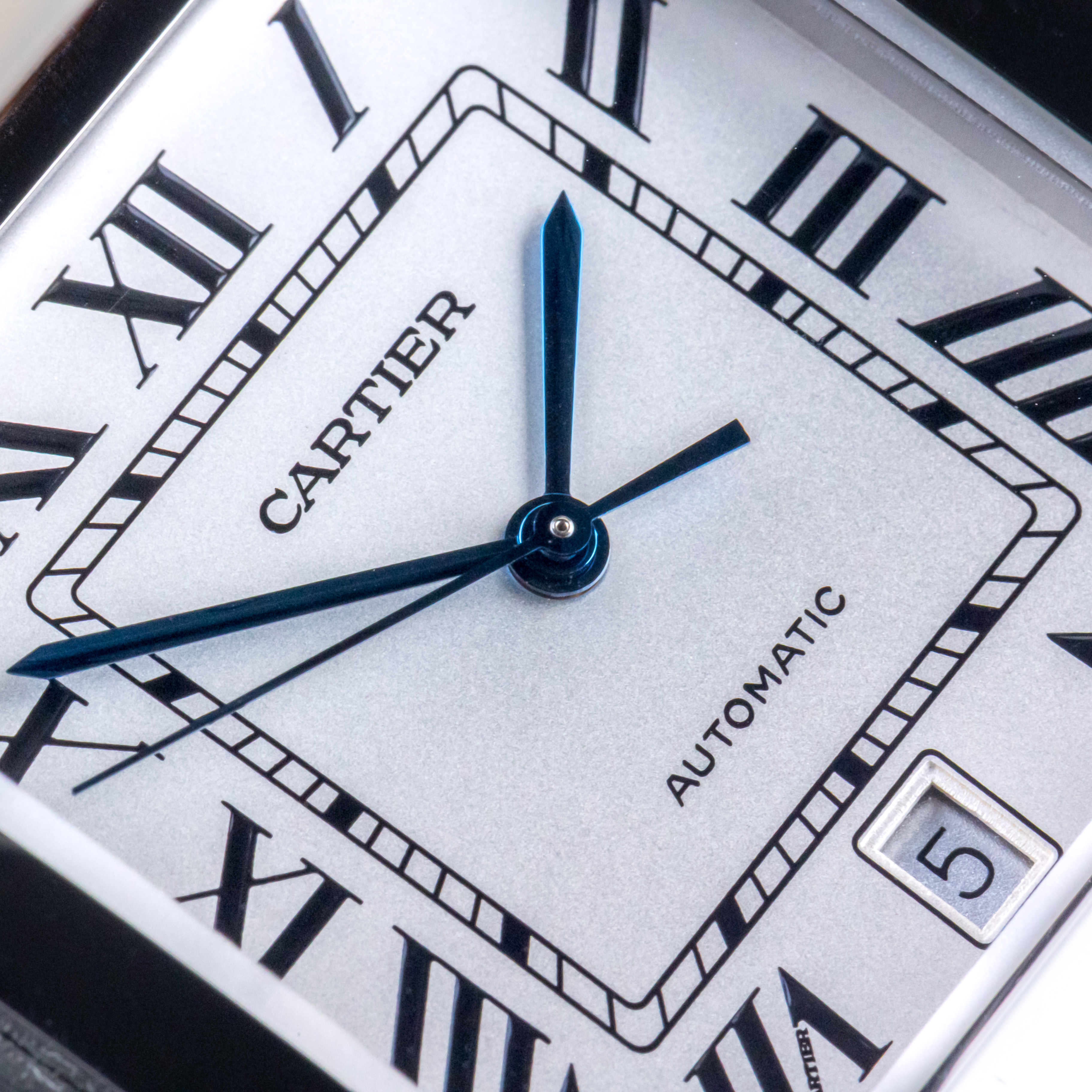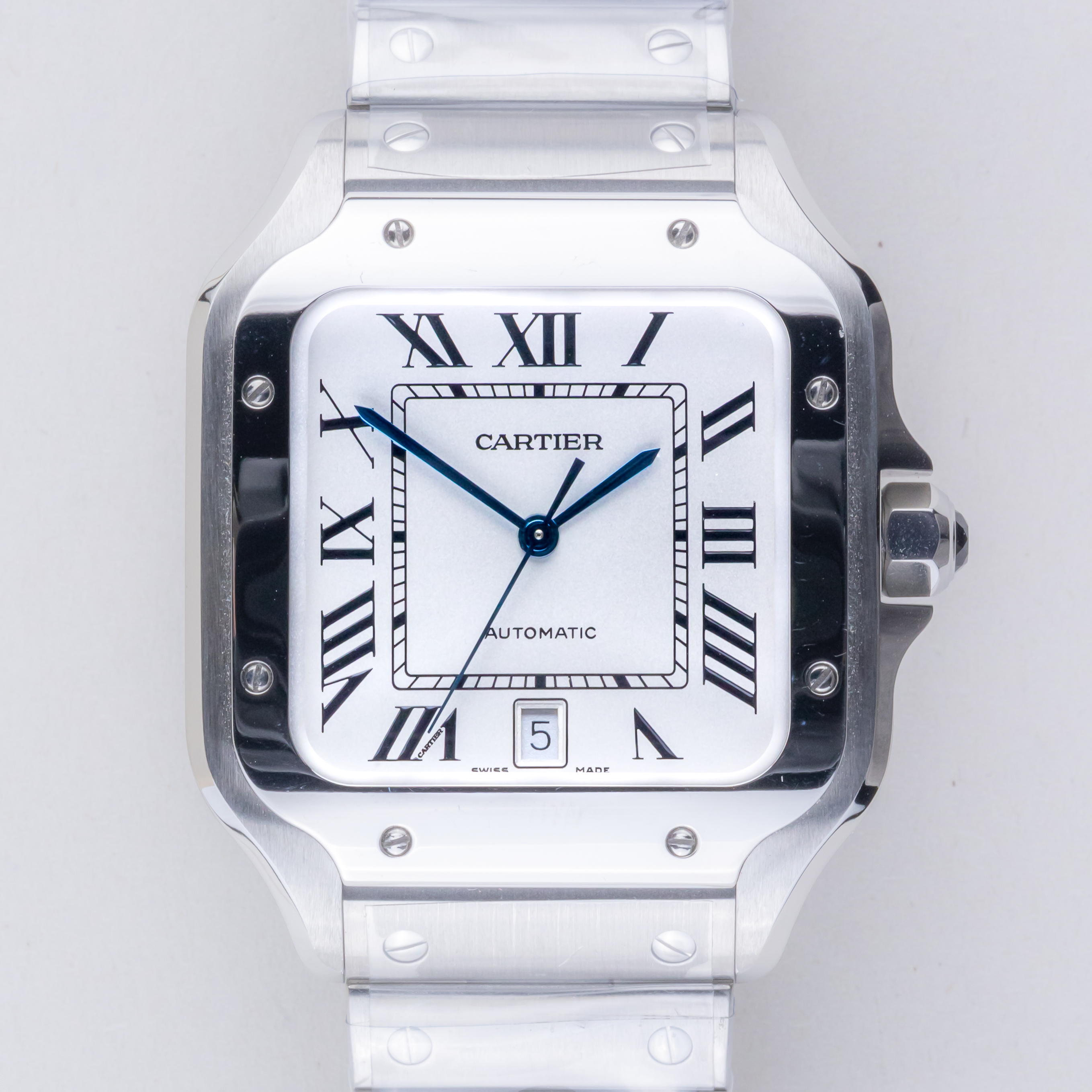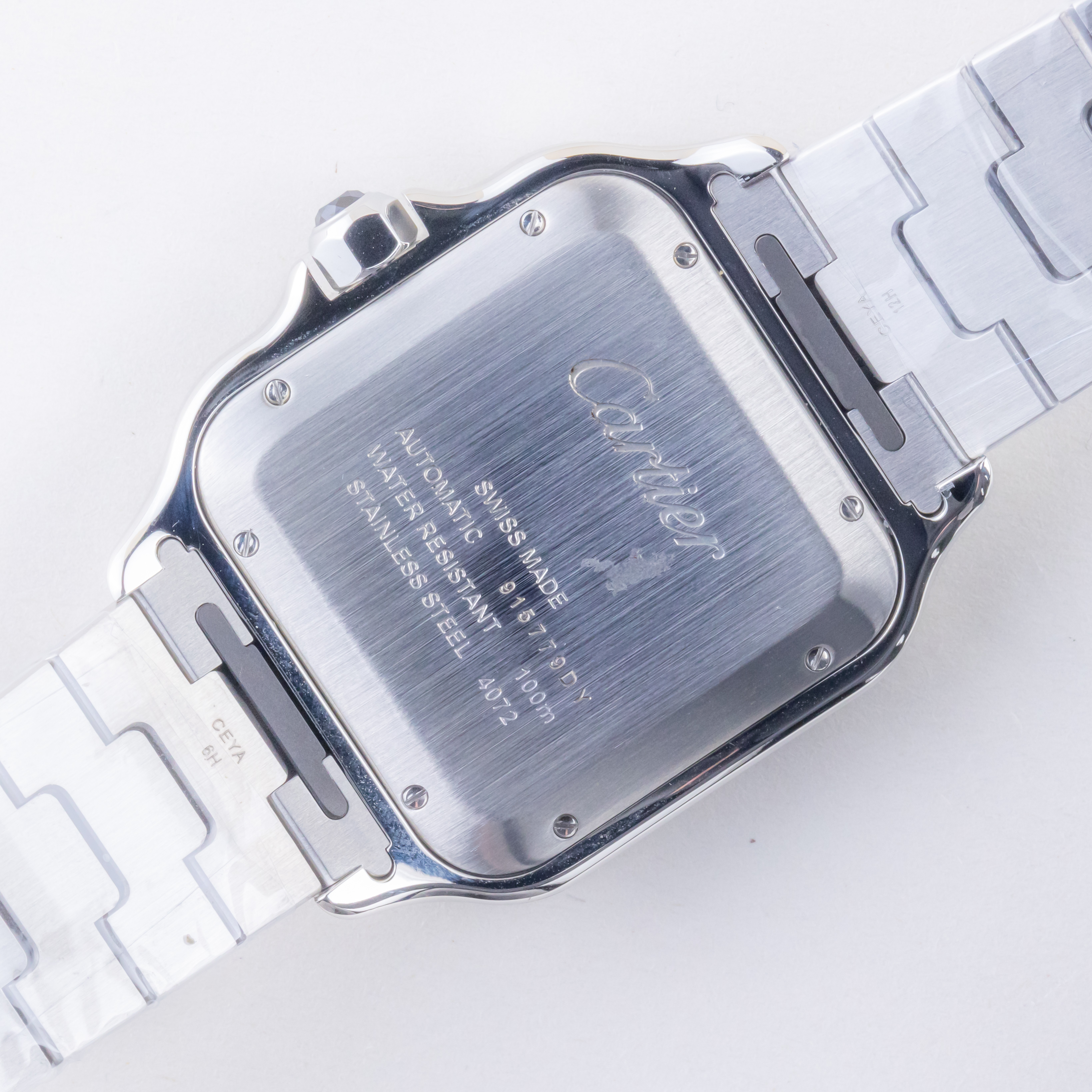 Lesen Sie mehr... >Cartier Santos groß Referenz WSSA0018 einschließlich vollständiger Satz. Die Cartier Santos hat ein 47.5 mm x 39.8 mm großes Edelstahlgehäuse (9,38 mm dick), eine glatte Edelstahllünette und ein Armband mit verdeckter Schmetterlingsschließe. Die Cartier Santos WSSA0018 hat ein silberfarbenes Opalinenzifferblatt mit den klassischen schwarzen römischen Indexen und blauen Zeigern im Cartier-Stil. Diese Cartier Santos WSSA0018 hat ein Automatikwerk mit Saphirglas auf der Oberseite. Zwischen den Kronenschützern der Uhr befindet sich die markante blaue Saphirkrone.