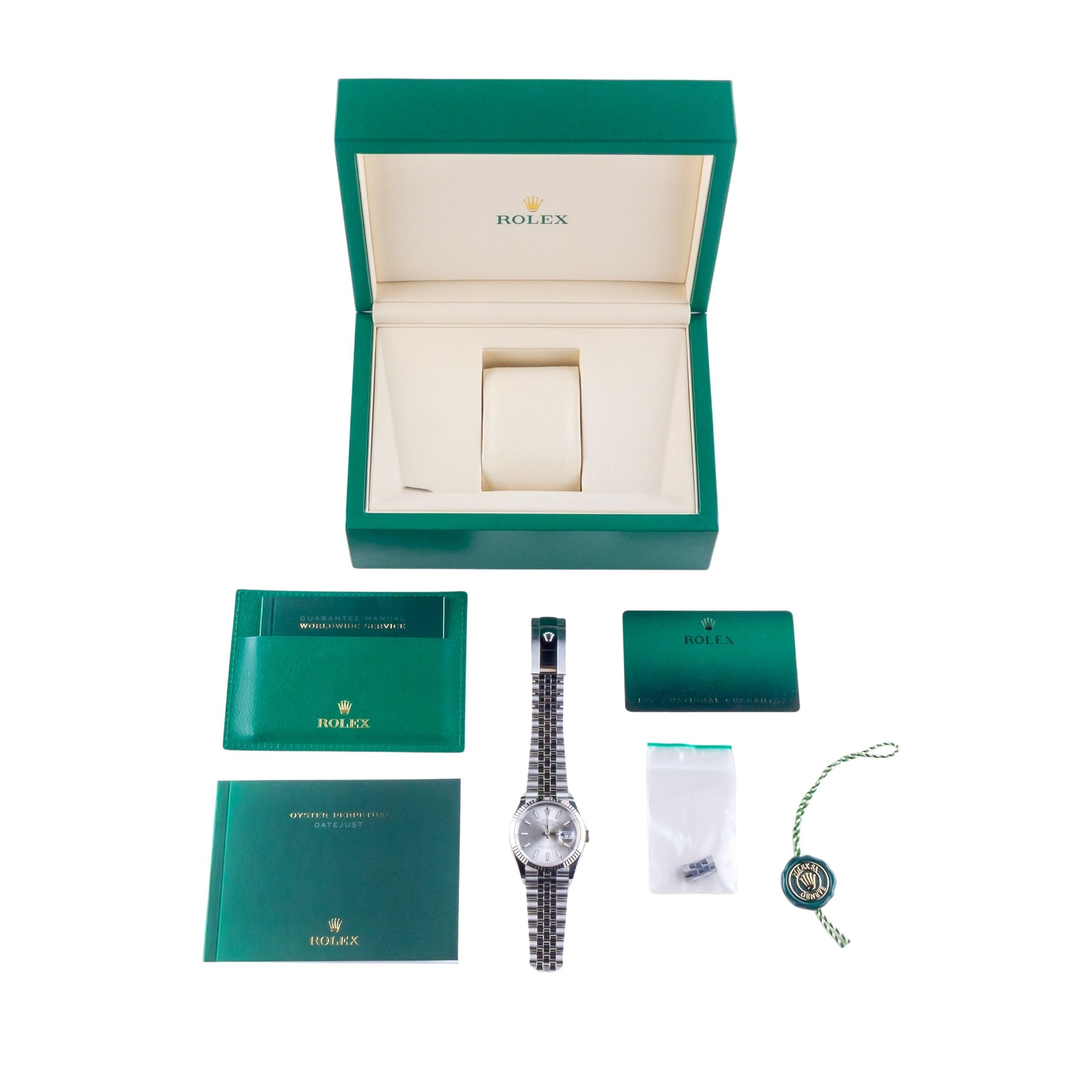 Rolex Oyster Perpetual Datejust Referenz 126234 aus dem Jahr 2025 mit komplettem Set. Die Datejust 126234 misst ein 36-mm-Edelstahlgehäuse, ein Edelstahl-Jubiläumsarmband mit Oysterclasp und eine 18k Weißgold geriffelte Lünette. Diese Datejust 126234 verfügt über ein Automatikwerk Kaliber 3235 mit Quickset Datum Funktion, Kratzfestigkeit Saphirglas und ein silbernes Zifferblatt mit Chromalight Zeiger und Markierungen.
