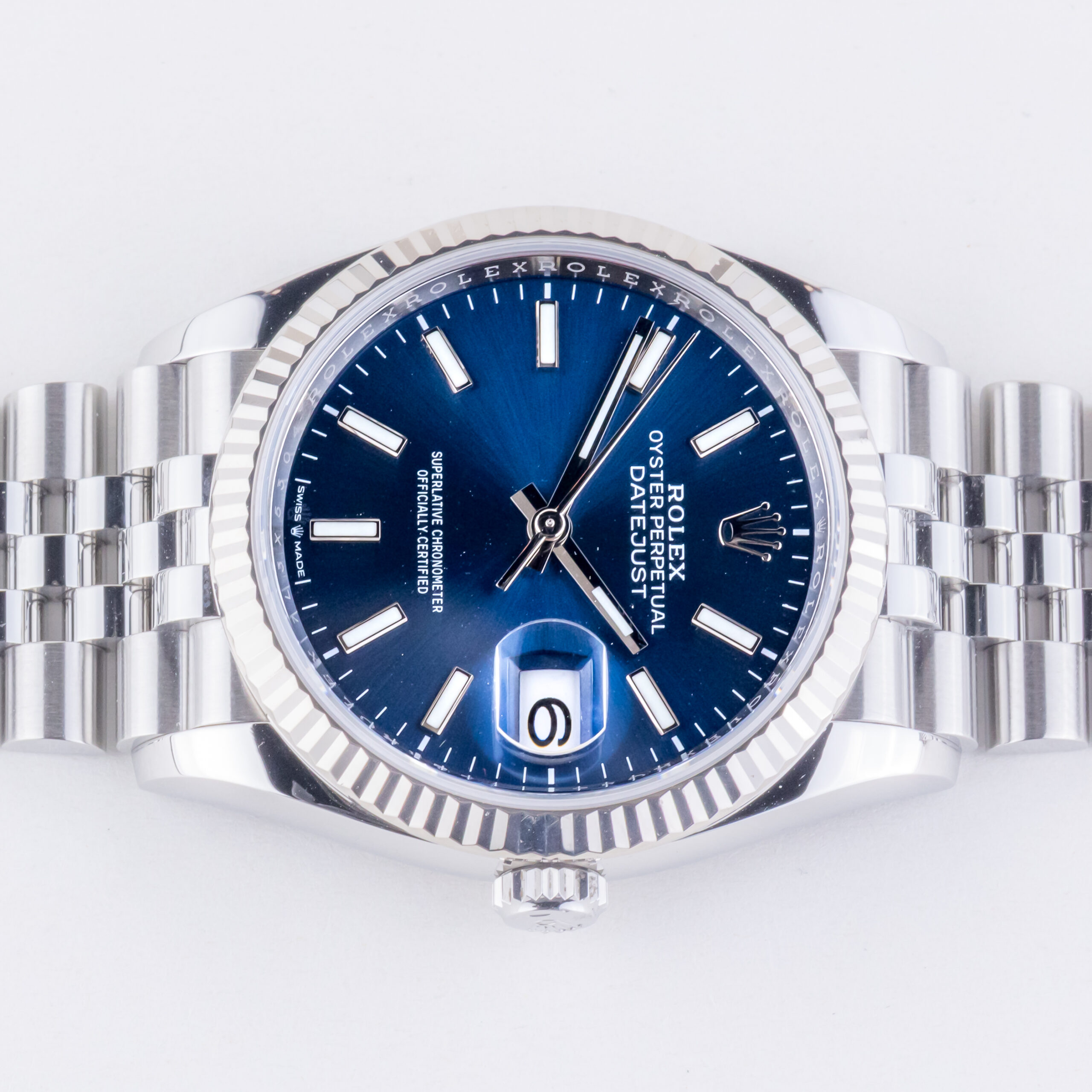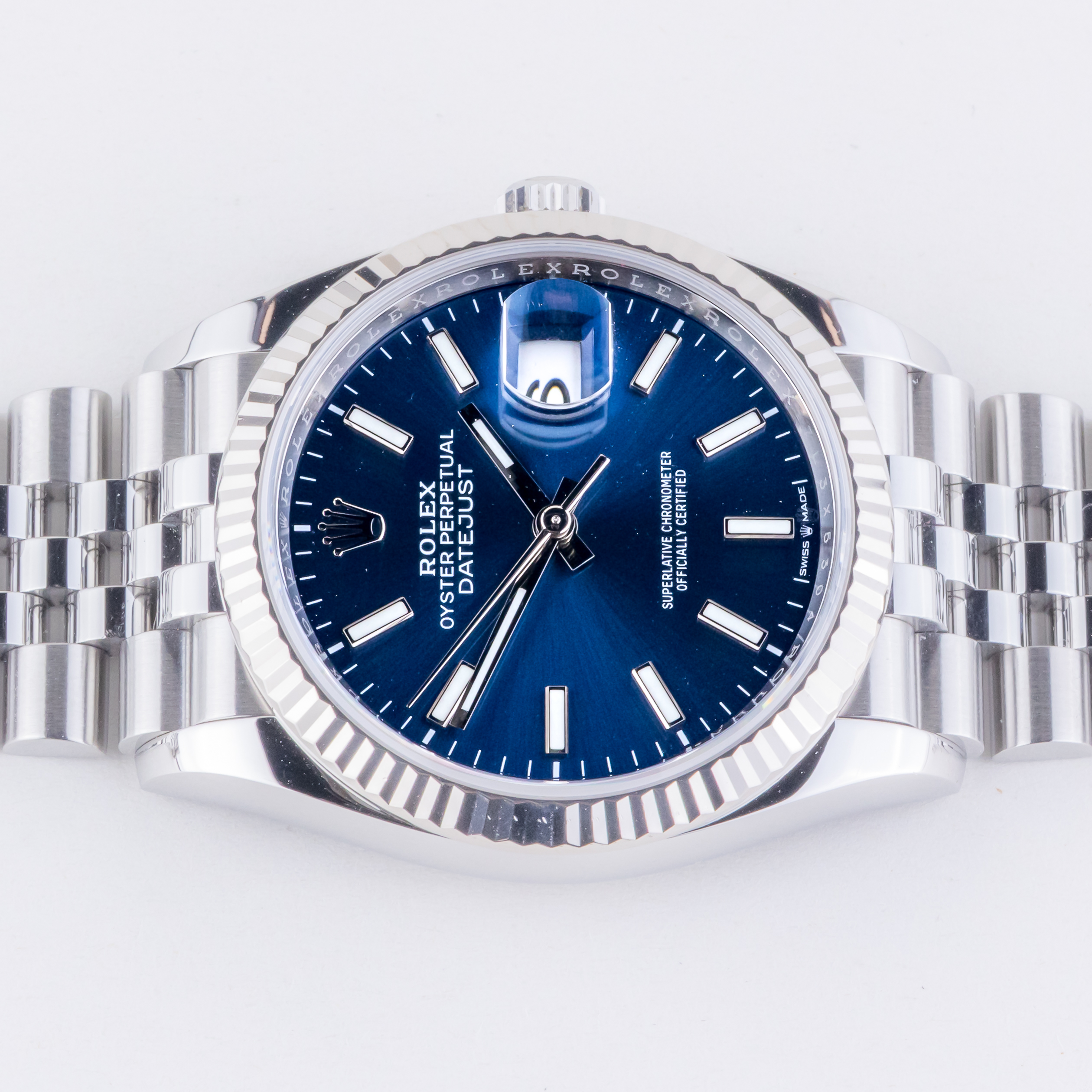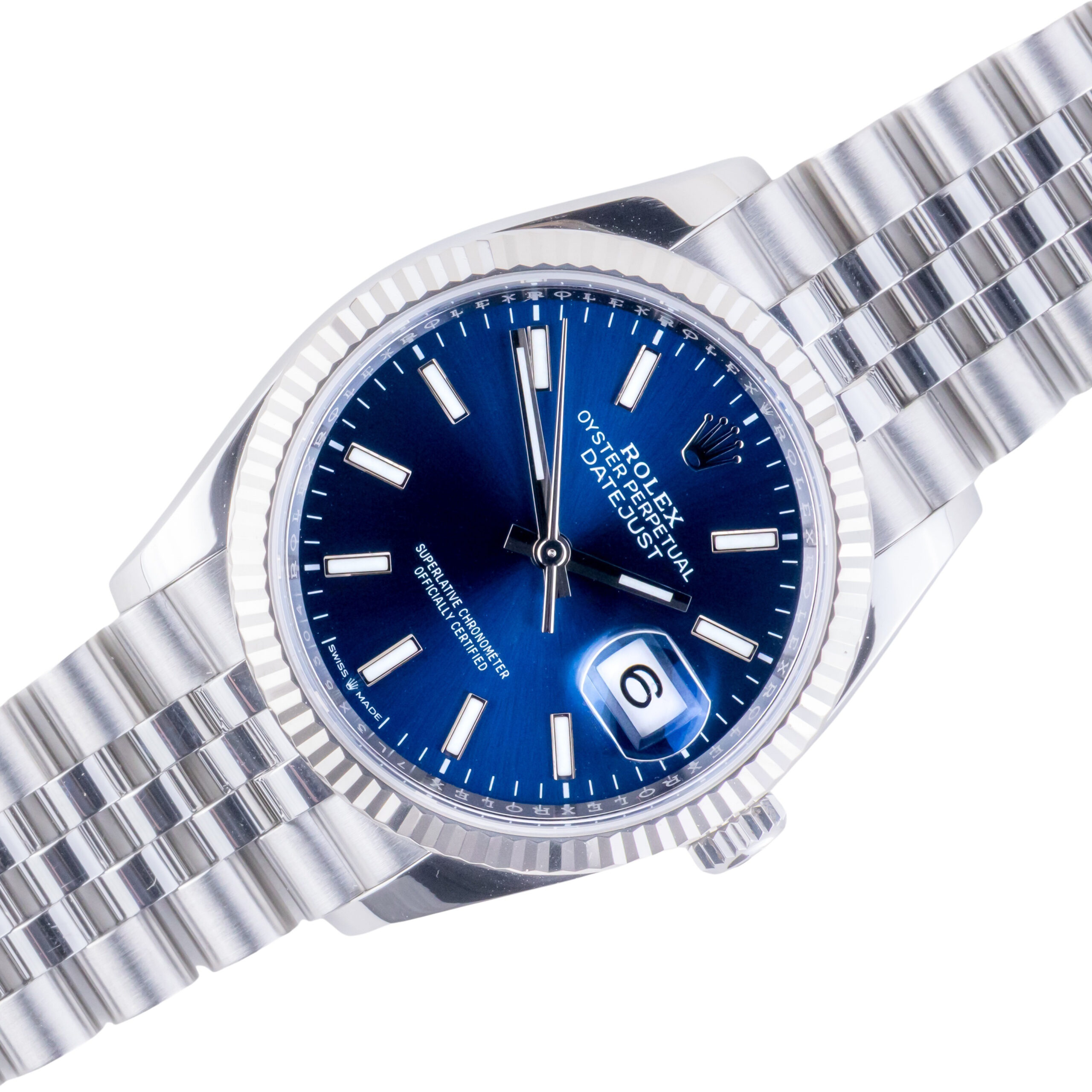 Rolex Oyster Perpetual Datejust Referenz 126234 aus dem Jahr 2021 mit komplettem Set. Die Datejust 126234 misst ein 36-mm-Edelstahlgehäuse, ein Edelstahl-Jubiläumsarmband mit Oysterclasp und eine 18k Weißgold geriffelte Lünette. Diese Datejust 126234 verfügt über ein Automatikwerk Kaliber 3235 mit Quickset Datum Funktion, Kratzfestigkeit Saphirglas und ein Zifferblatt mit blauem, Chromalight Zeiger und Markierungen.