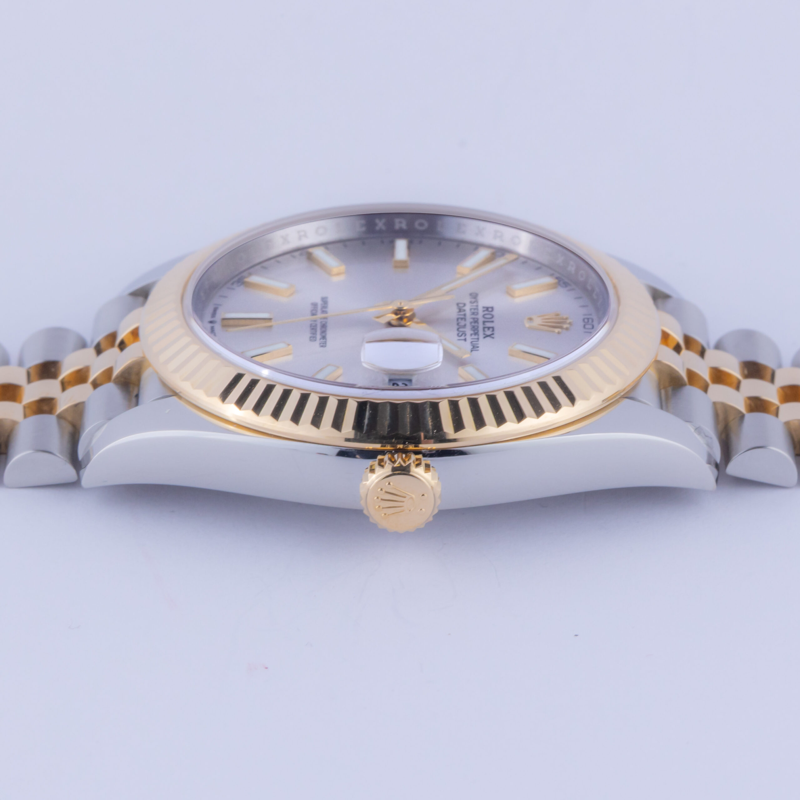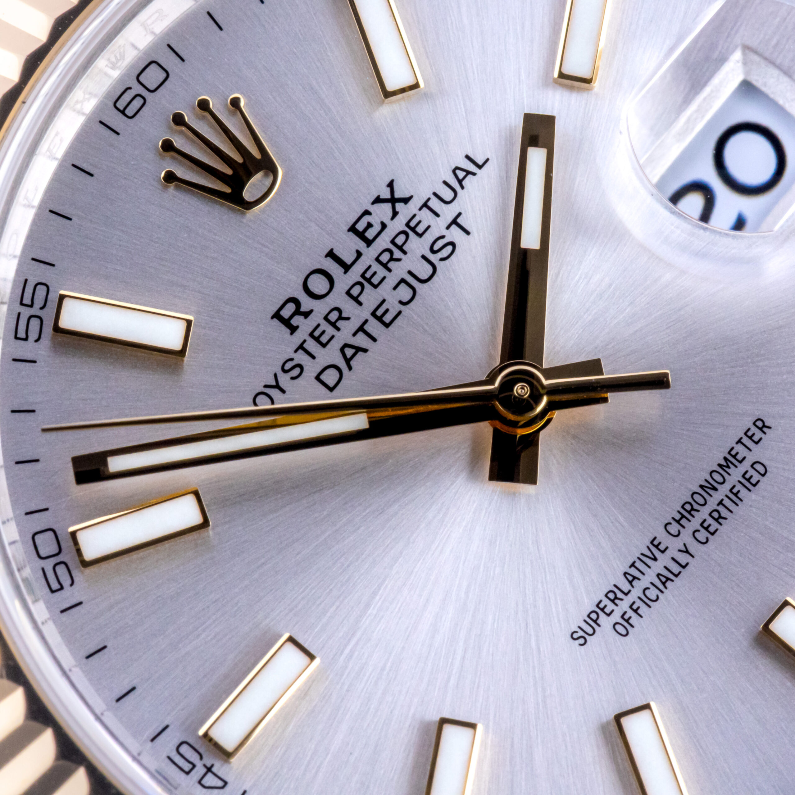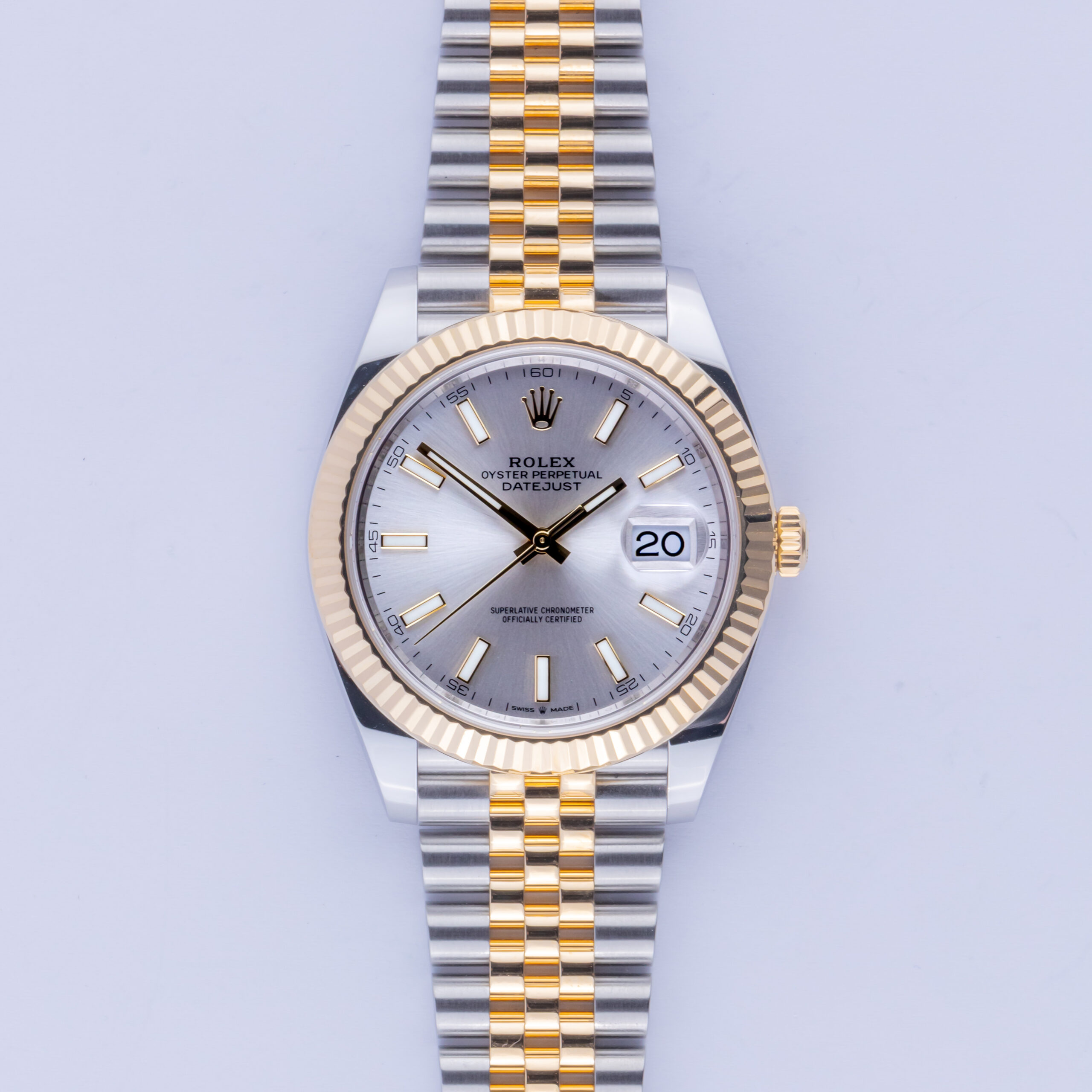 Rolex Oyster Perpetual Datejust Referenz 126333 von 2021 einschließlich voller Satz. Die Datejust 126333 misst eine 41mm Gold und Edelstahl Gehäuse, ein zweifarbiges Jubilee Armband mit Kronenverschluss und kannelierte 18k Gold Lünette. Diese Datejust 126333 verfügt über ein Automatikwerk Kaliber 3235 mit Schnellverstellung Datum Funktion, eine Kratzfestigkeit Saphirglas und ein silbernes zifferblatt.