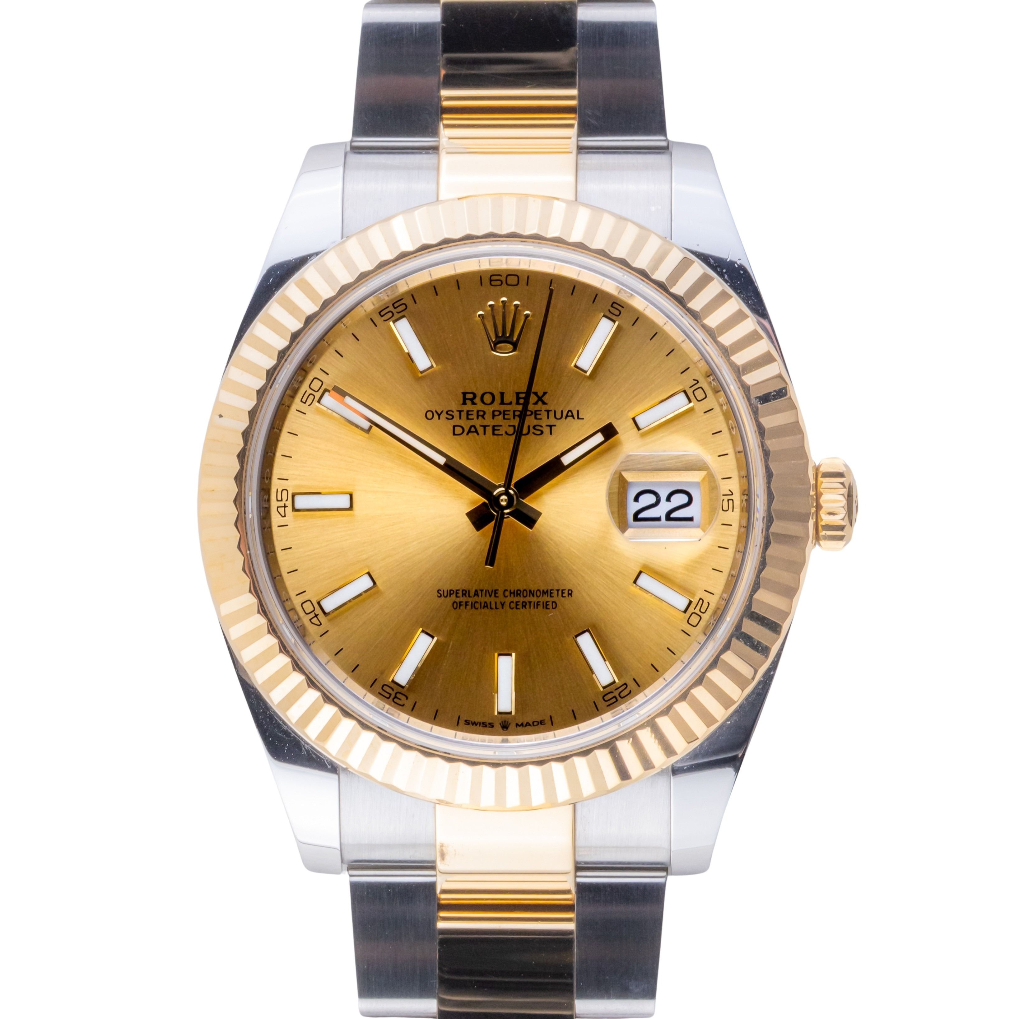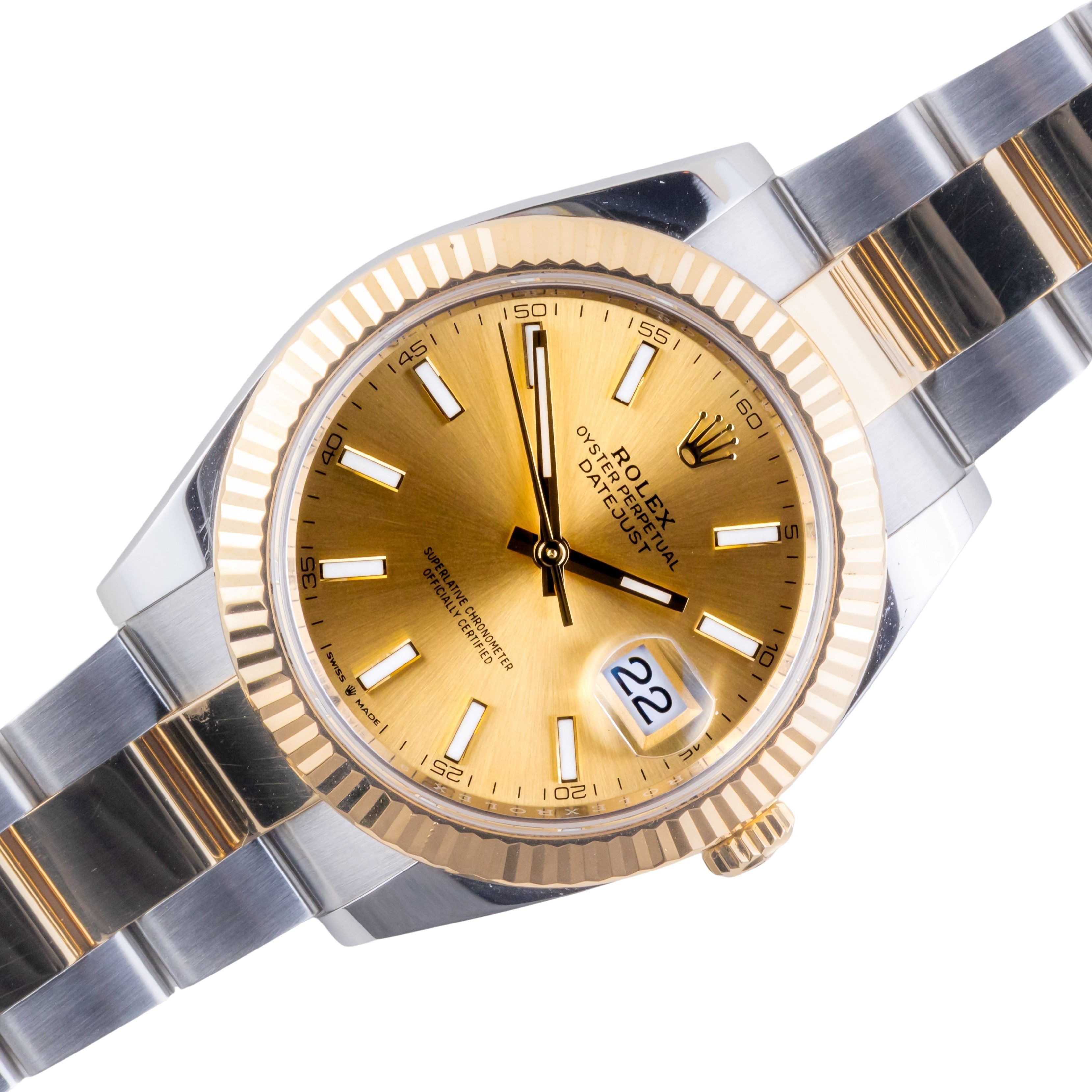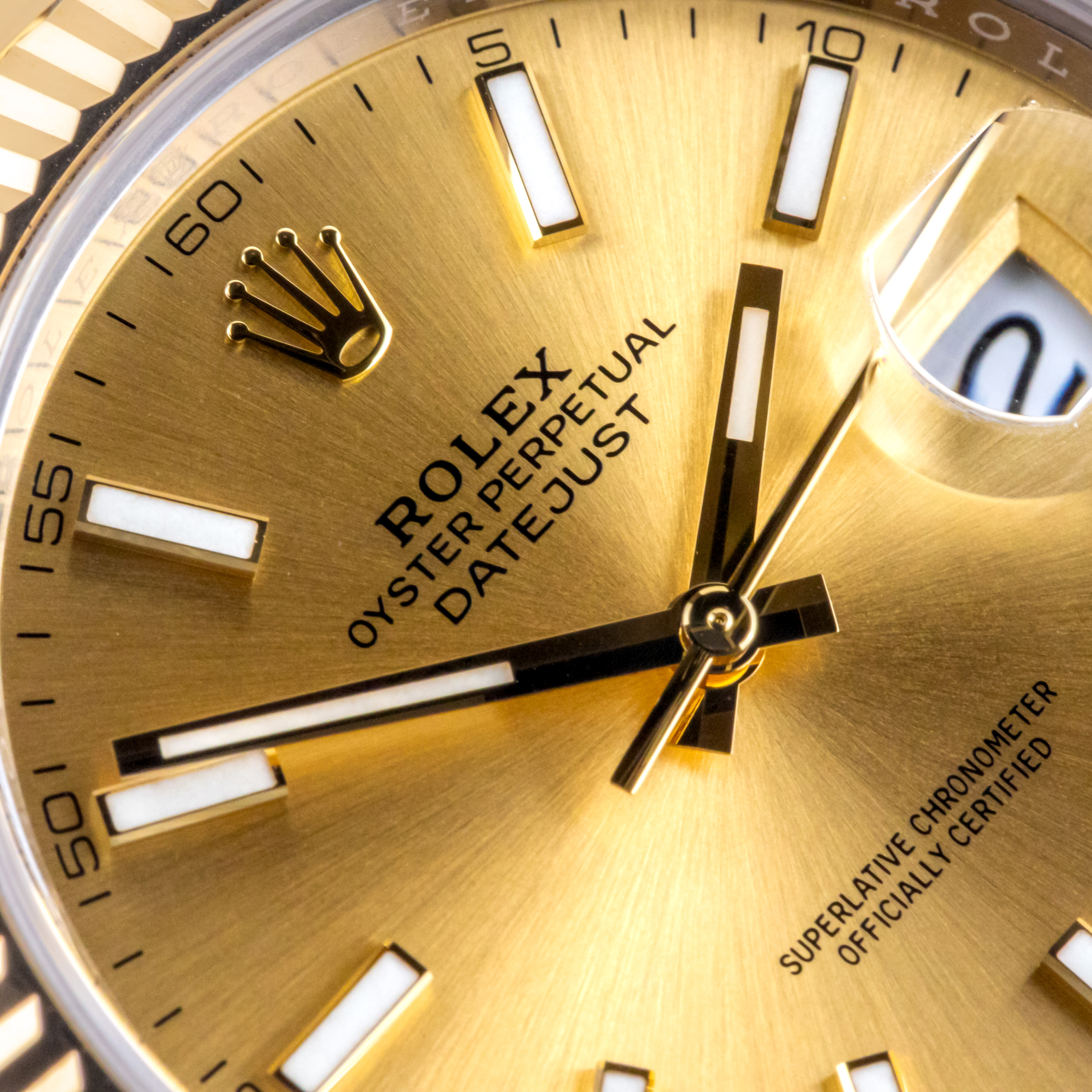 Rolex Oyster Perpetual Datejust Referenz 126333 von 2022 einschließlich voller Satz. Die Datejust 126333 misst eine 36mm Gold und Edelstahl Gehäuse, ein zweifarbiges Jubilee Armband mit Kronenverschluss und kannelierte 18k Gold Lünette. Diese Datejust 126333 verfügt über ein Automatikwerk Kaliber 3235 mit Schnellverstellung Datum Funktion, eine Kratzfestigkeit Saphirglas und ein Champagner Zifferblatt.