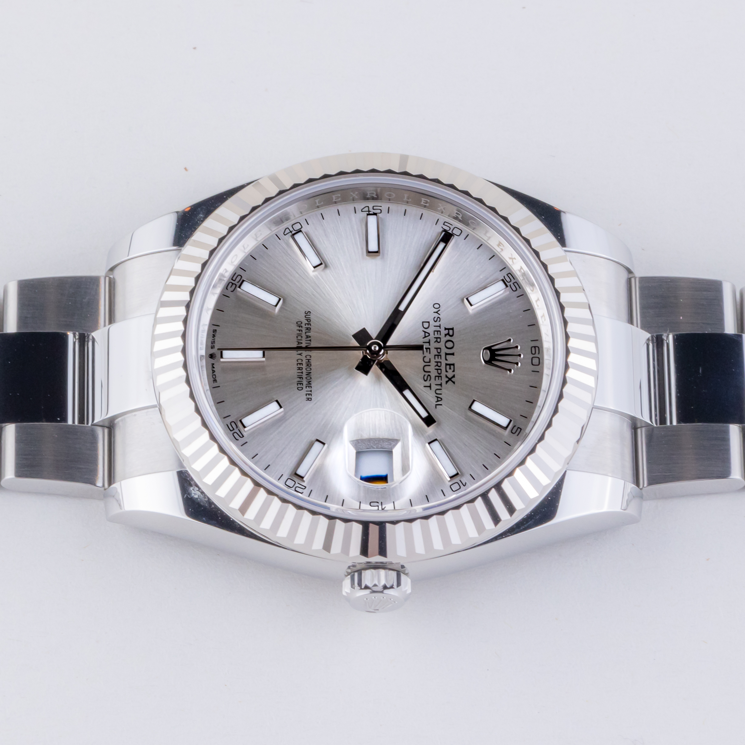 Rolex Oyster Perpetual Datejust Referenz 126334 aus dem Jahr 2025 inklusive komplettem Set. Die Datejust 126334 misst ein 41-mm-Edelstahlgehäuse, ein Edelstahl (904L) Jubilee-Armband mit Oysterclasp und eine kannelierte 18K Weißgold-Lünette. Diese Datejust 126334 verfügt über ein Automatikwerk Kaliber 3235 mit einem Quickset-Datum-Funktion, eine Kratzfestigkeit Saphirglas und Silberness-Zifferblatt.