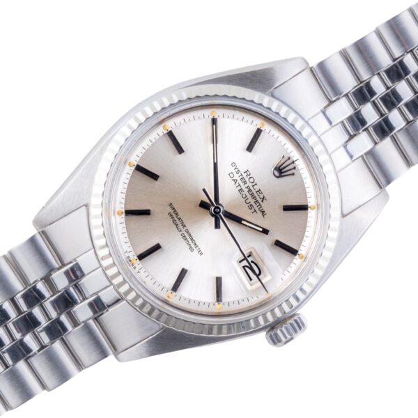 Rolex Oyster Perpetual Datejust Referenz 1601 von 1973. Die Datejust 1601 misst ein 36-mm-Edelstahlgehäuse mit einer 18-karätigen Weißgoldlünette und einem Jubiläumsarmband aus Edelstahl. Die Datejust 1601 verfügt über ein Automatikwerk Kaliber 1570, ein wasserdichtes Plexiglas und ein silbernes Zifferblatt mit Tritiumzeigern.