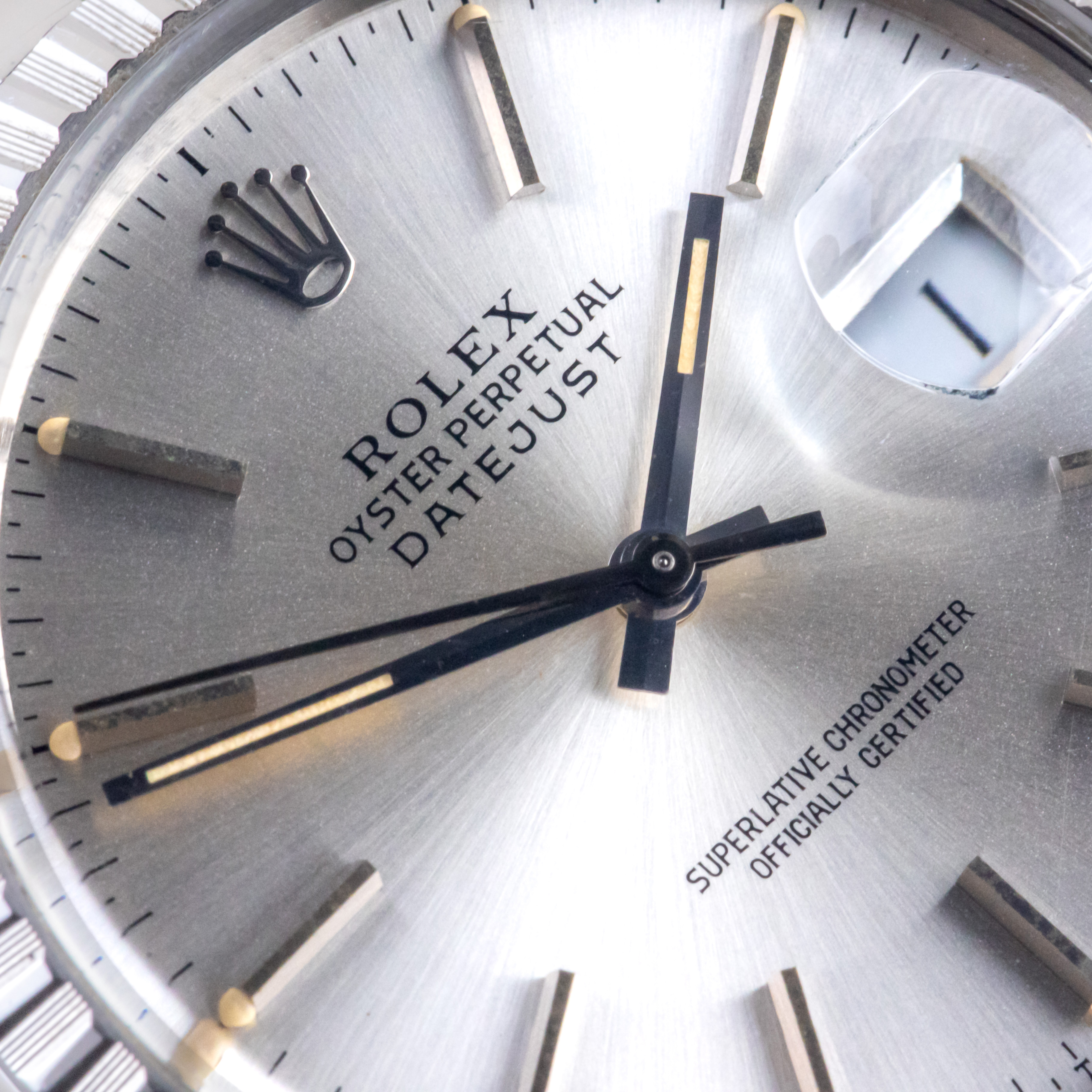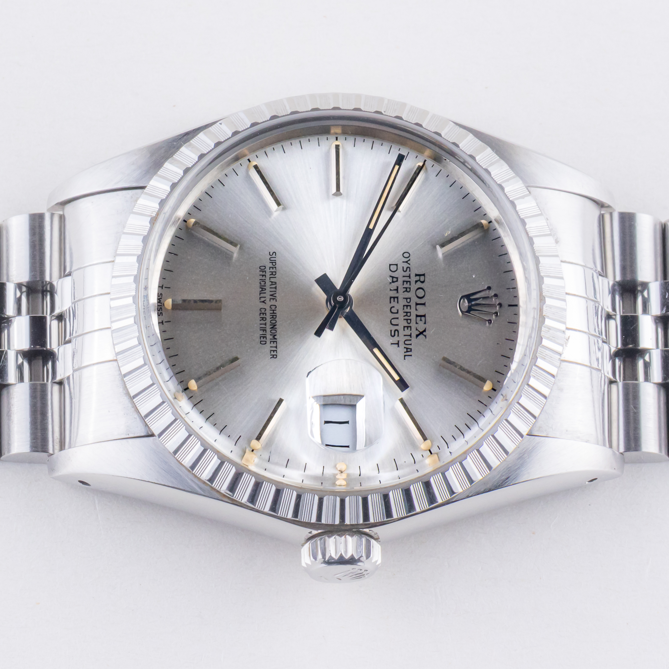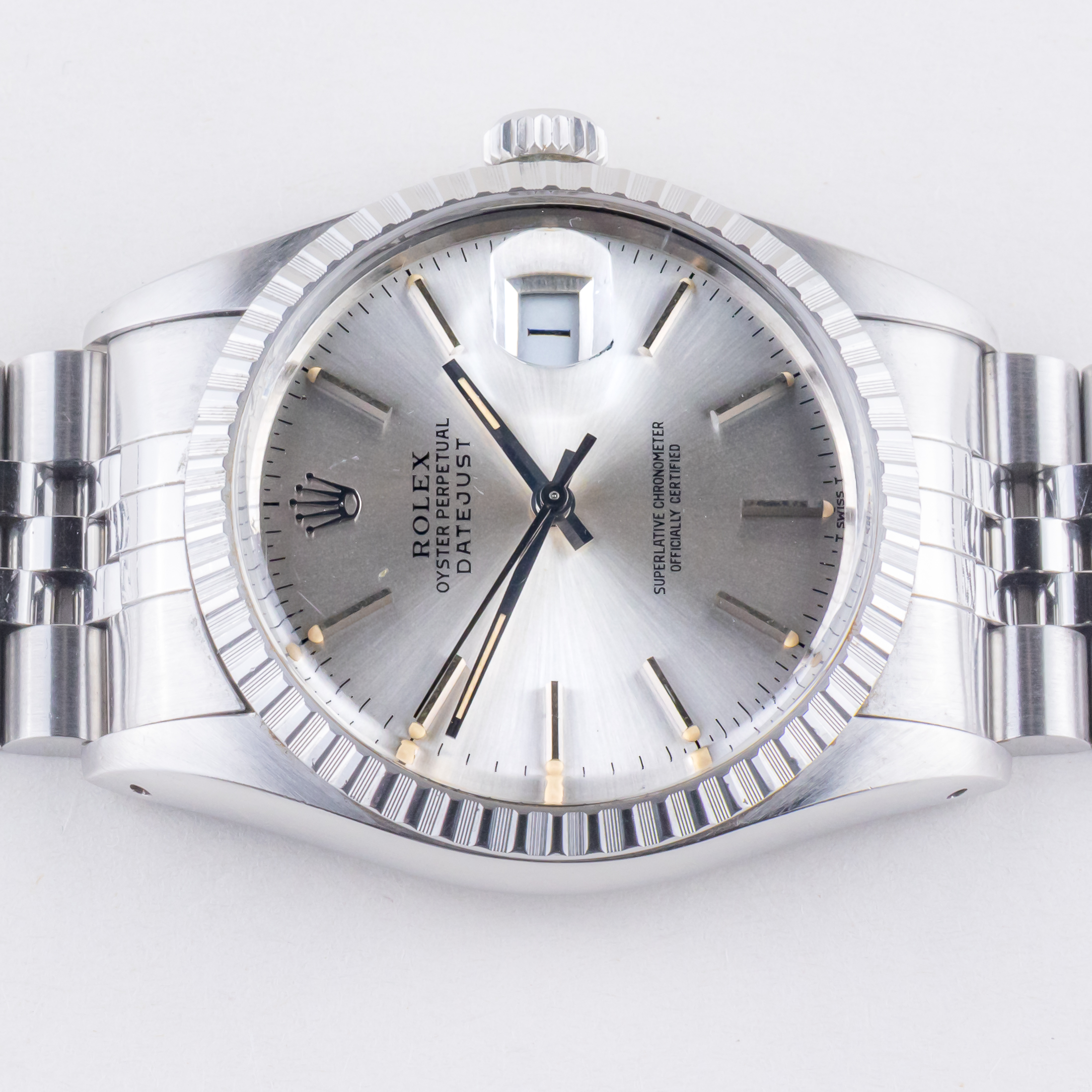 Rolex Oyster Perpetual Datejust Referenz 16030 aus dem Jahr 1985 mit komplettem Set. Die Datejust 16030 verfügt über ein 36-mm-Edelstahlgehäuse, ein Edelstahl-Jubiläumsarmband mit Faltschließe und eine gedrehte Lünette aus Edelstahl. Die Datejust 16030 verfügt über ein Automatikwerk Kaliber 3035 mit Schnellverstellung des Datums, Plexiglas und ein silberness Zifferblatt. Die Uhr kommt mit den originalen Rolex-Garantiepapieren, der originalen Box und den Bedienungsanleitungen.