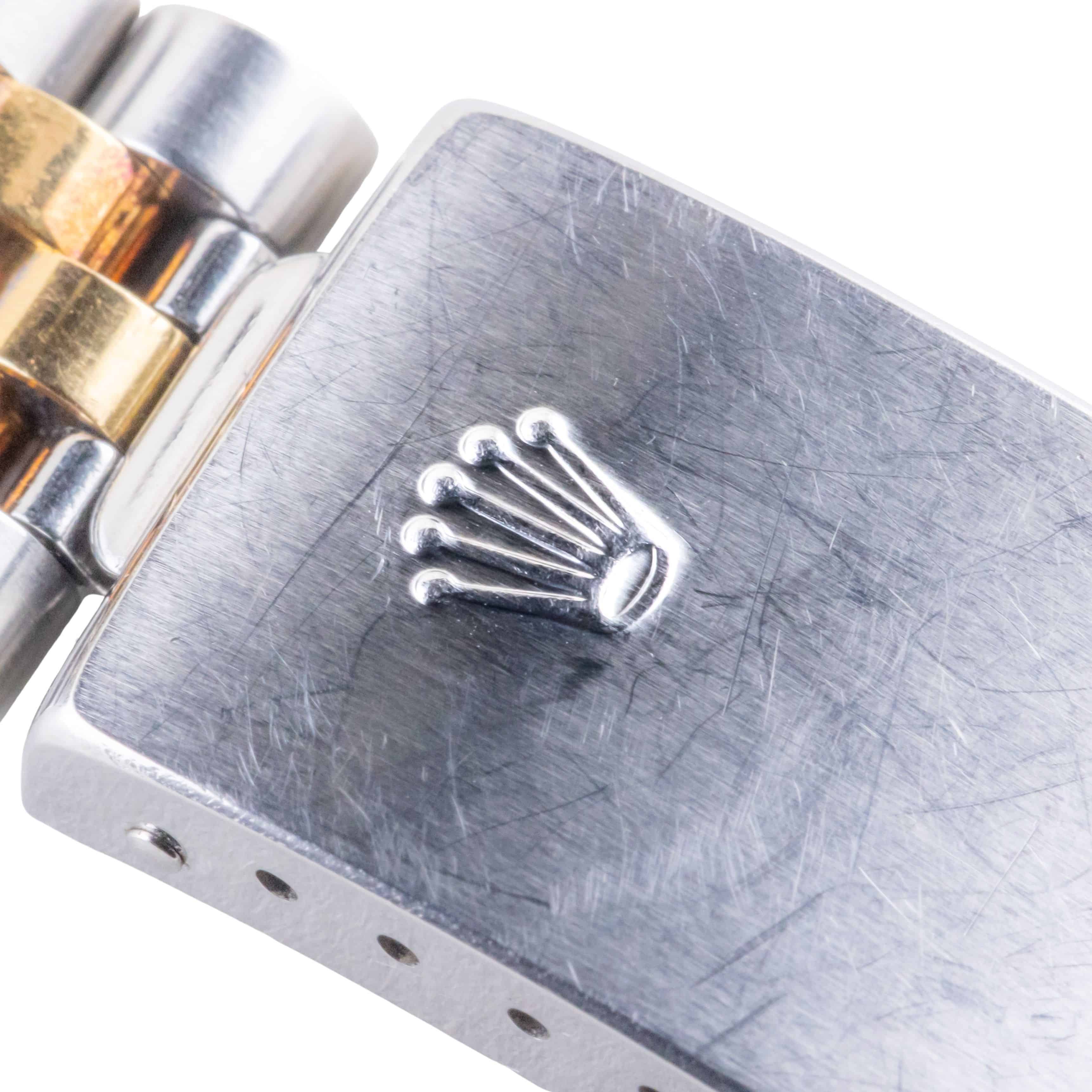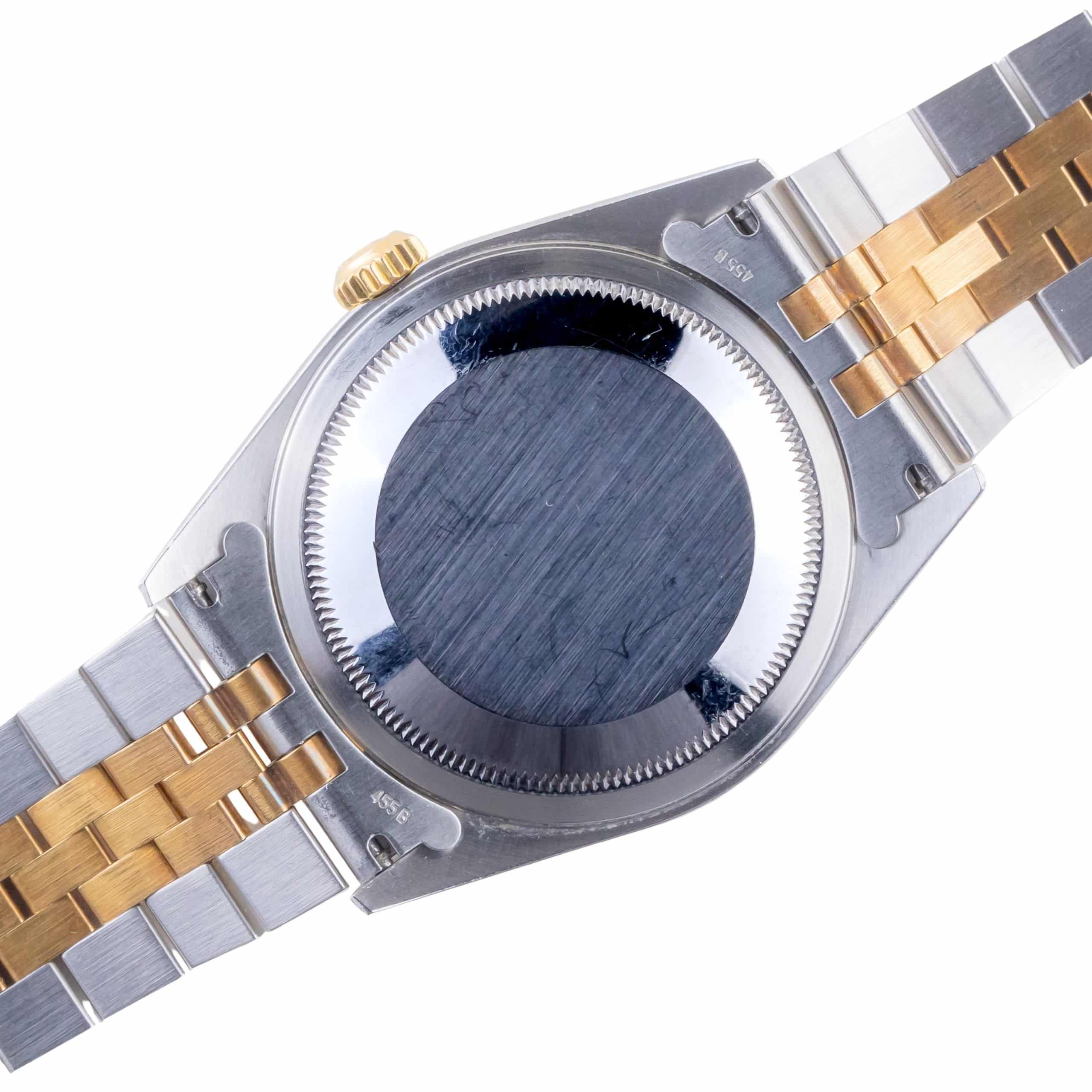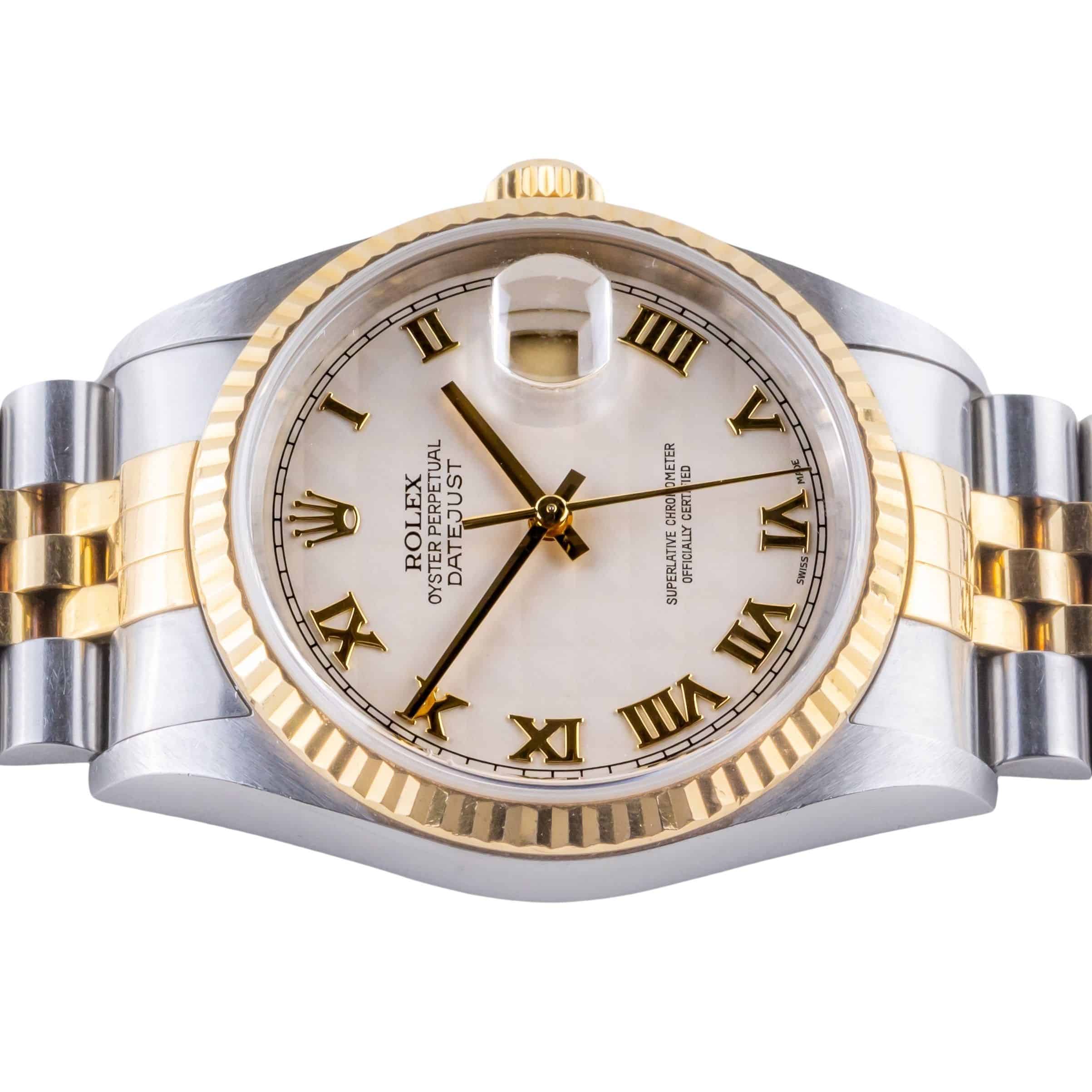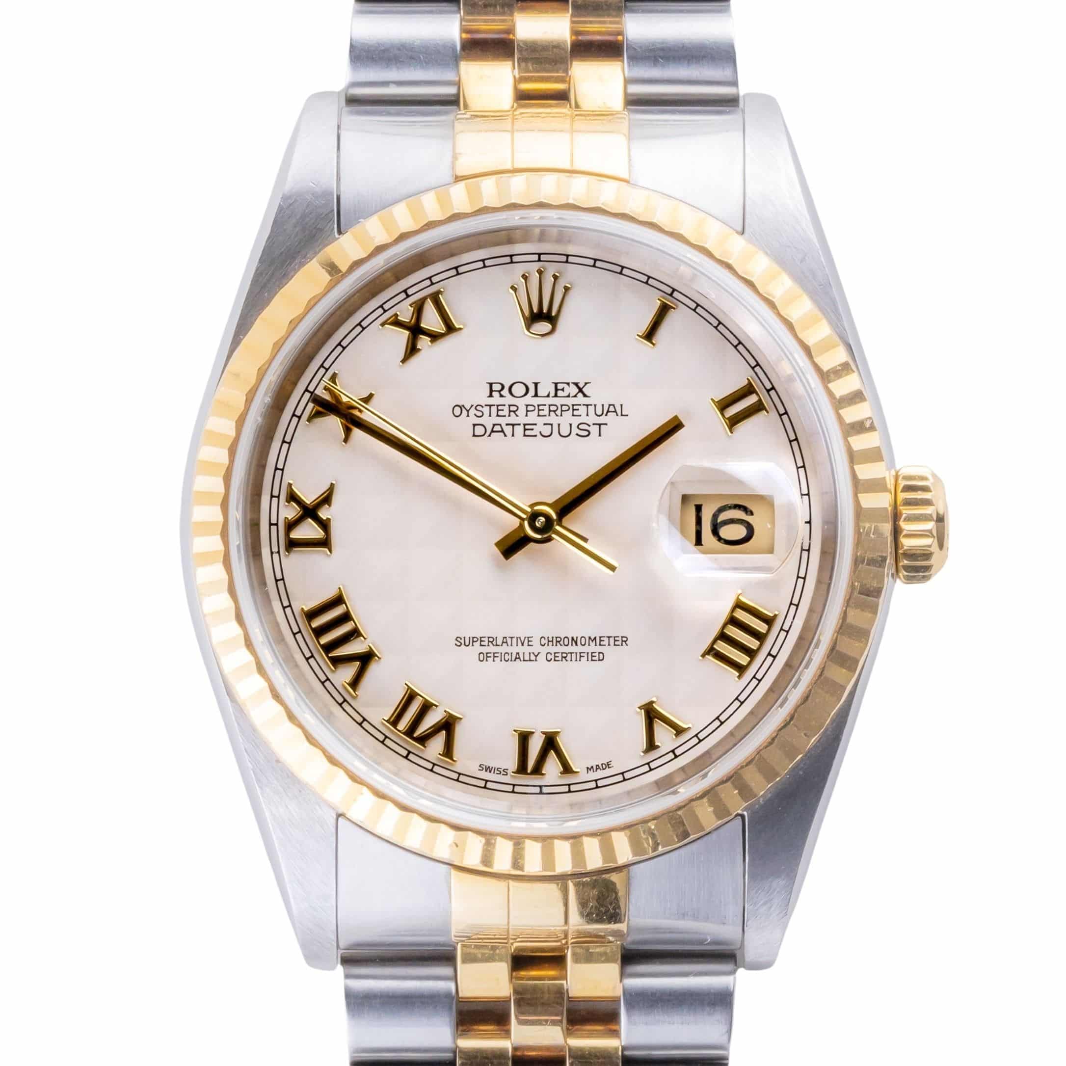 Rolex Oyster Perpetual Datejust Referenz 16233 aus dem Jahr 2003. Die Datejust 16233 misst ein 36-mm-Gehäuse aus Gold und Edelstahl, ein zweifarbiges Jubilee-Armband und eine kannelierte 18-karätige Goldlünette. Diese Datejust 16233 verfügt über ein automatisches Uhrwerk Kaliber 3135 mit Schnellverstellung des Datums, ein kratzfestes Saphirglas und ein Zifferblatt in Form einer Pyramide aus Elfenbein