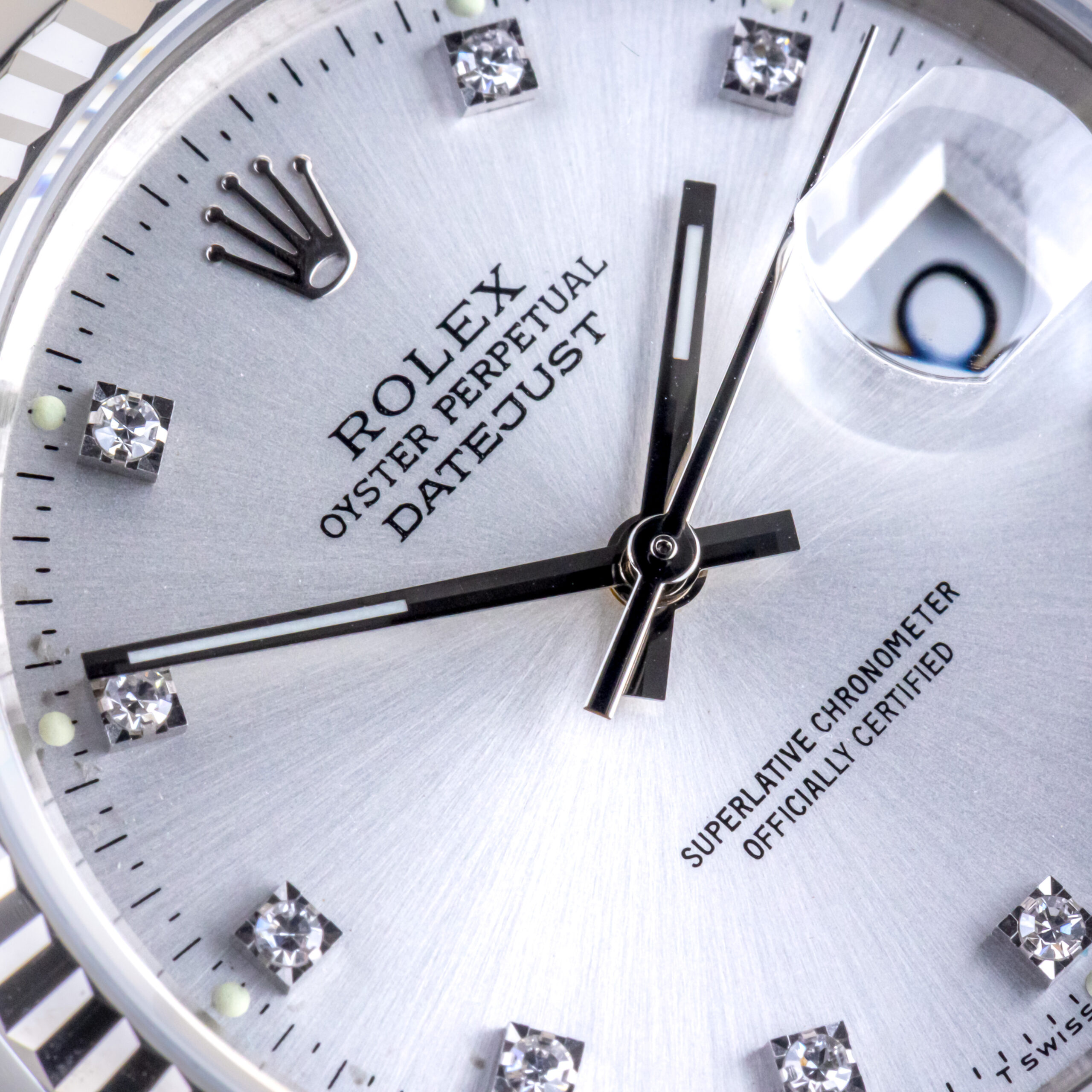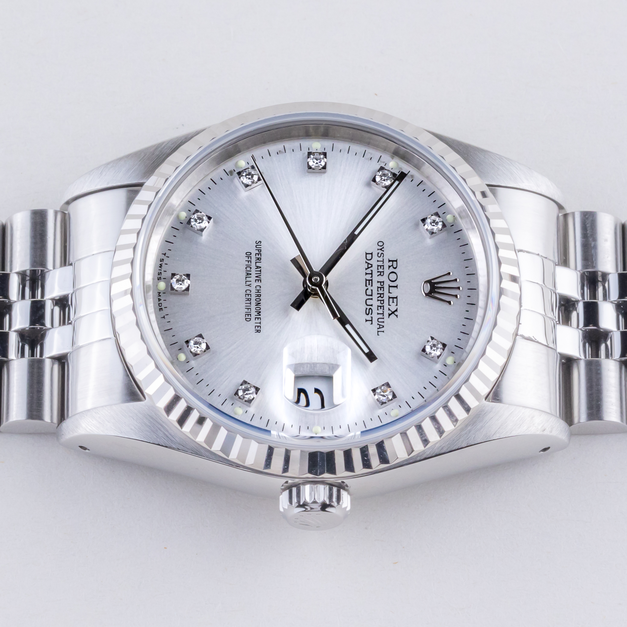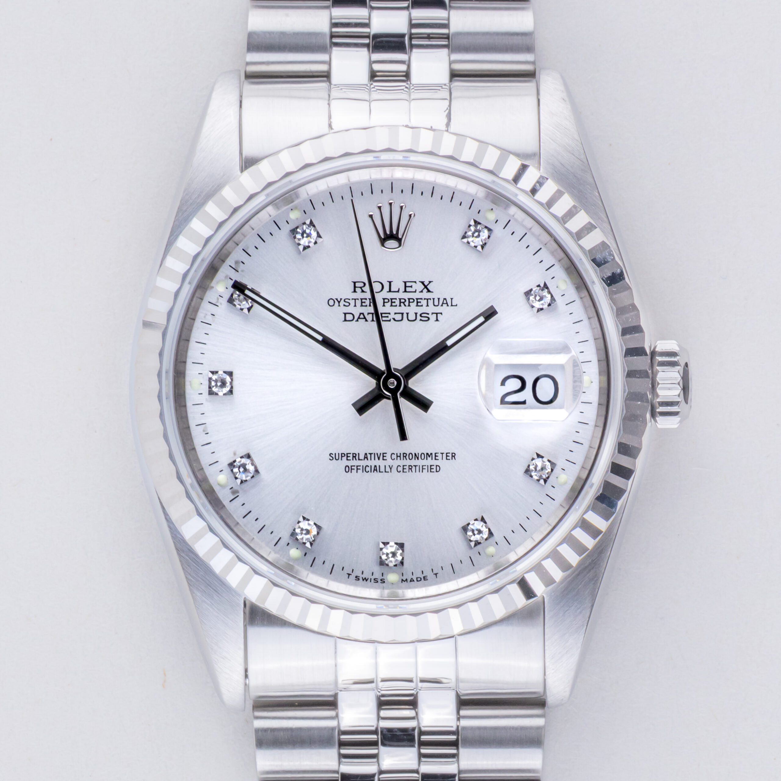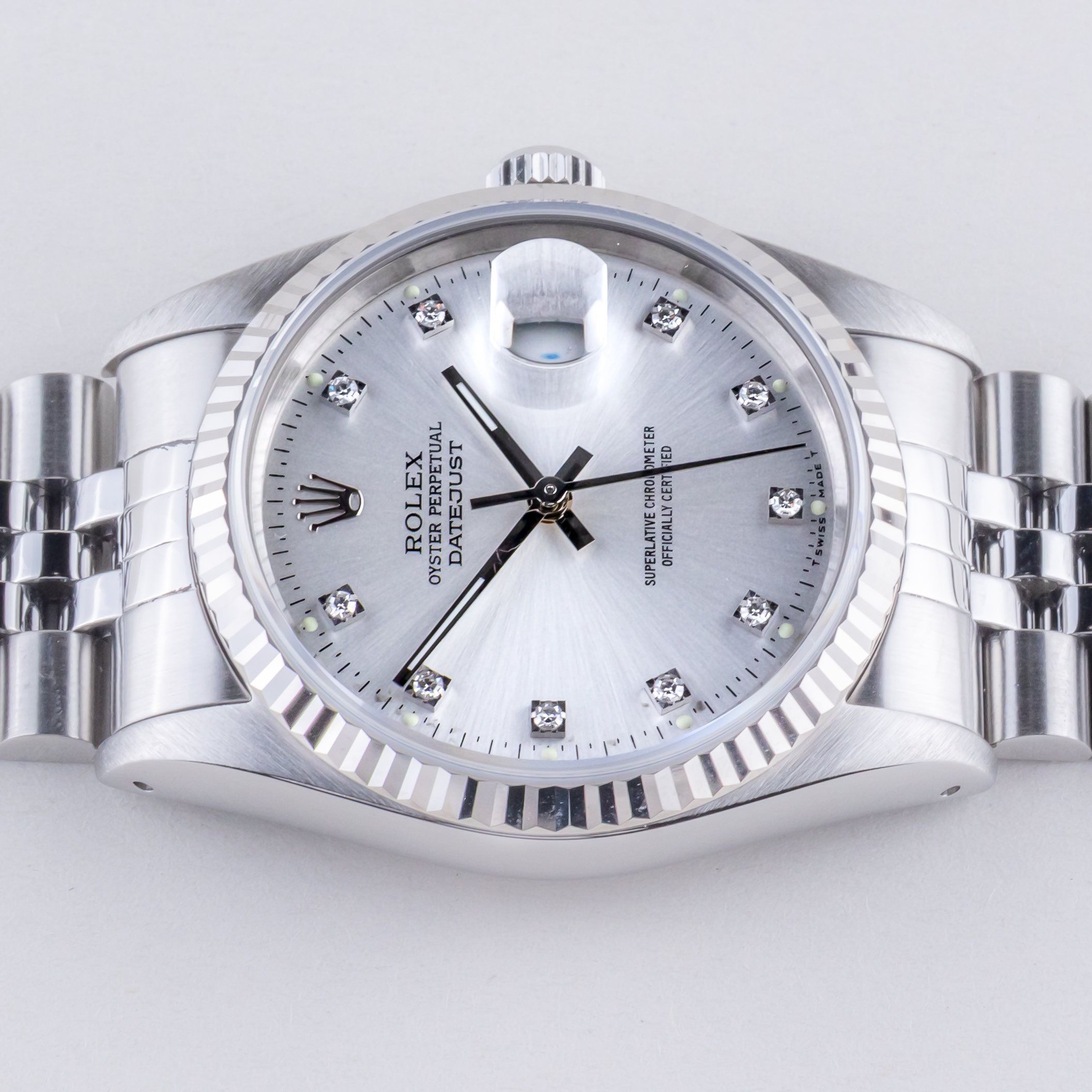 Rolex Oyster Perpetual Datejust Referenz 16234 aus dem Jahr 1991 mit komplettem Set. Die Datejust 16234 Datejust misst ein 36mm Edelstahlgehäuse, ein Edelstahl-Jubiläumsarmband und eine kannelierte 18k Weißgold Lünette. Diese Datejust 16234 verfügt über ein Automatikwerk Kaliber 3135 mit Quickset-Datum-Funktion, ein kratzfestes Saphirglas und ein silbernes Zifferblatt mit Diamantmarkierungen.