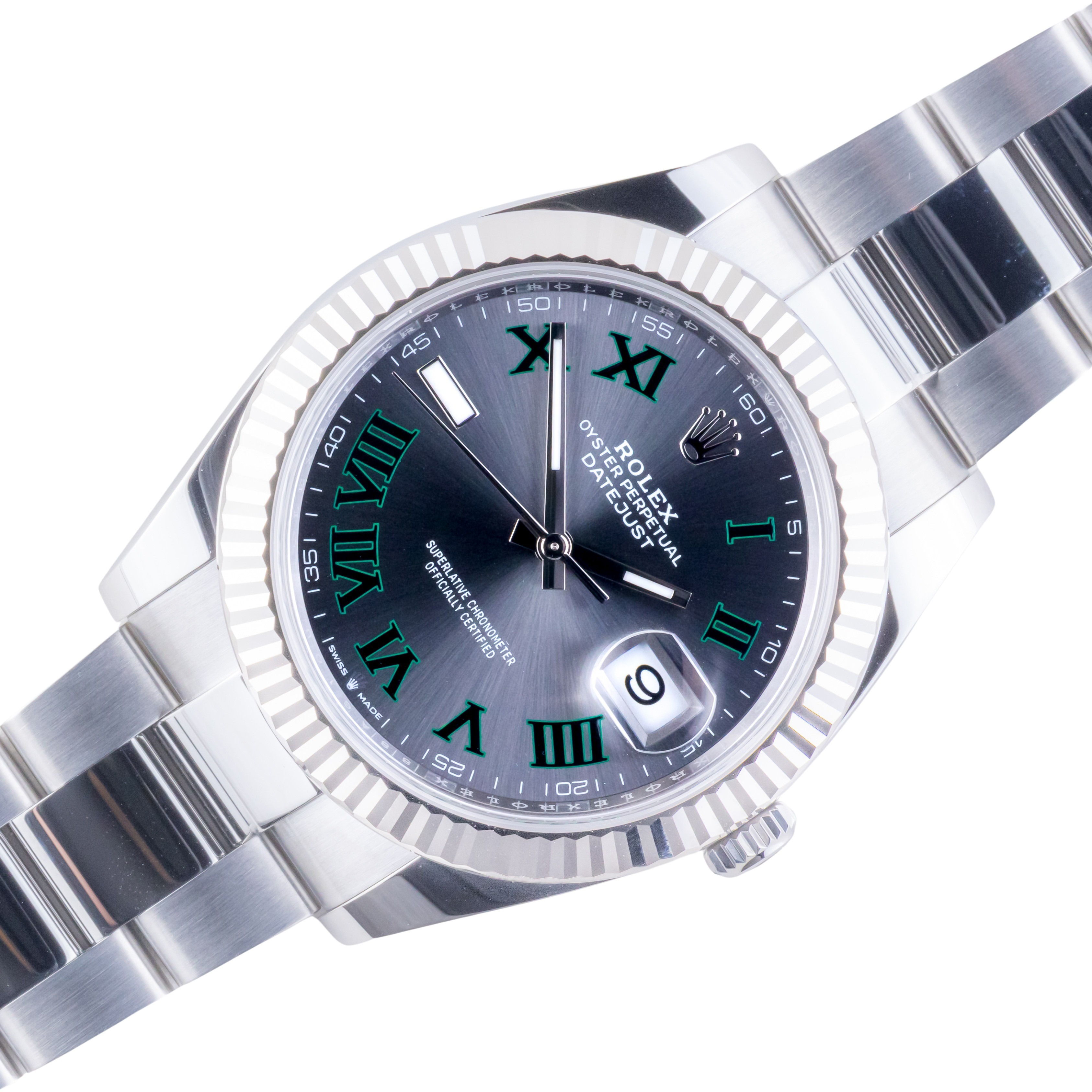 Rolex Oyster Perpetual Datejust Referenz 126334 aus dem Jahr 2025 inklusive komplettem Set. Die Datejust 126334 misst ein 41-mm-Edelstahlgehäuse, ein Edelstahl (904L) Jubilee-Armband mit Oysterclasp und eine kannelierte 18K Weißgold-Lünette. Diese Datejust 126334 verfügt über ein Automatikwerk Kaliber 3235 mit einem Quickset-Datum-Funktion, eine Kratzfestigkeit Saphirglas und Wimbledon Zifferblatt.