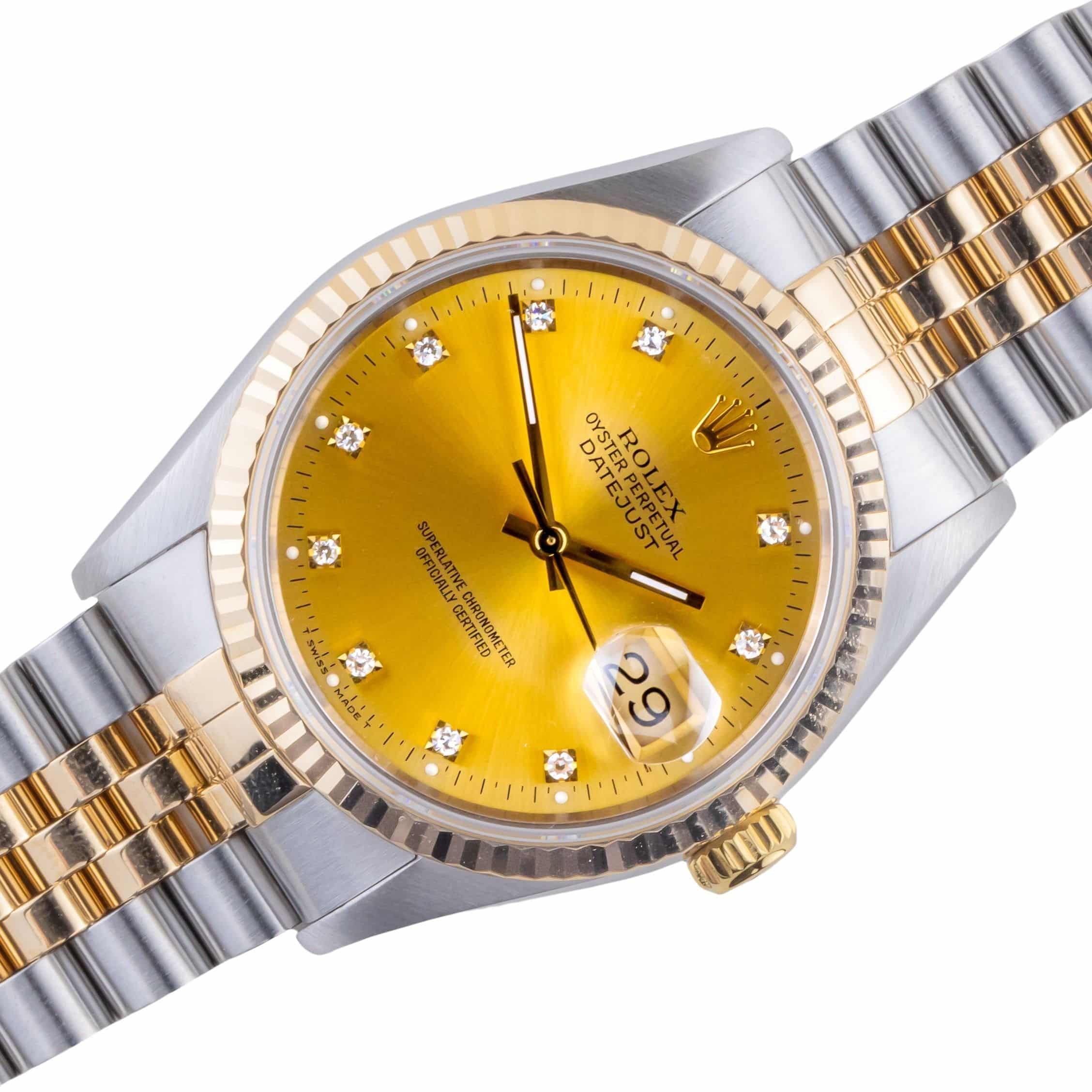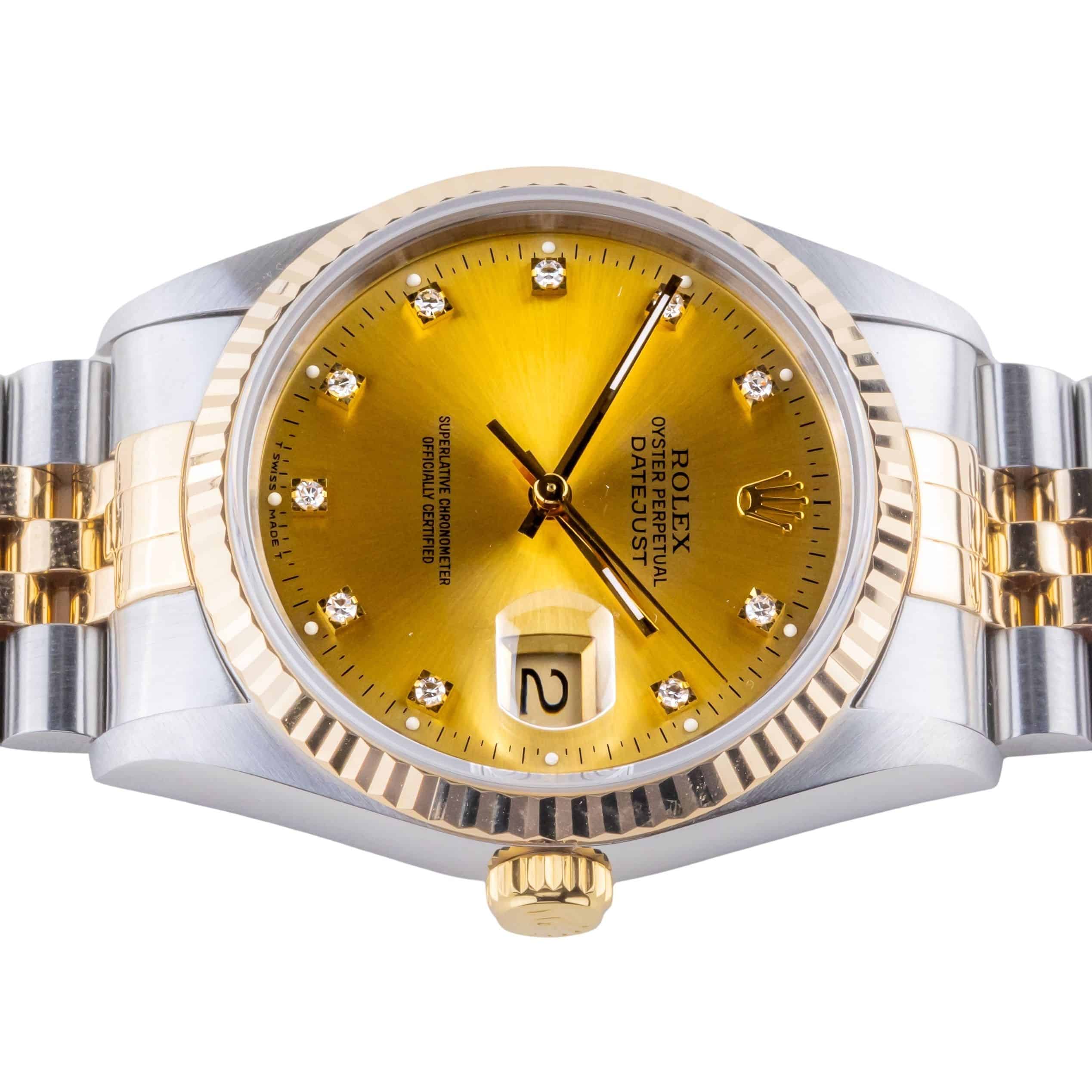 Rolex Oyster Perpetual Datejust Referenz 16233 aus dem Jahr 1993 mit komplettem Set. Die Datejust 16233 misst eine 36mm Gold und Edelstahl Gehäuse, zweifarbige Jubilee Armband und kannelierte 18k Gold Lünette. Diese Datejust 16233 verfügt über ein Automatikwerk Kaliber 3135 mit einem Quickset-Datum Funktion, eine Kratzfestigkeit Saphirglas und ein Champagner-Zifferblatt mit Diamantmarkierungen.