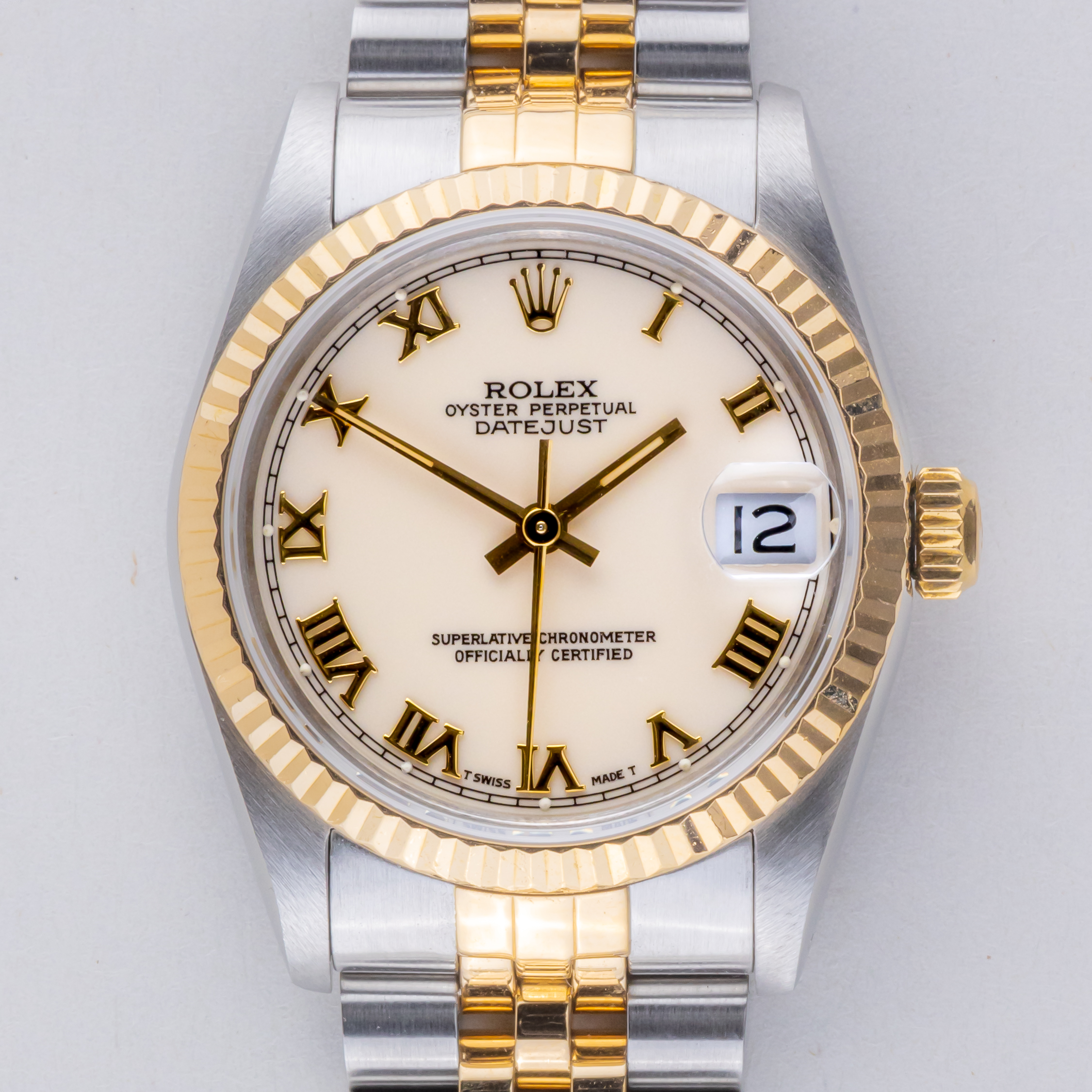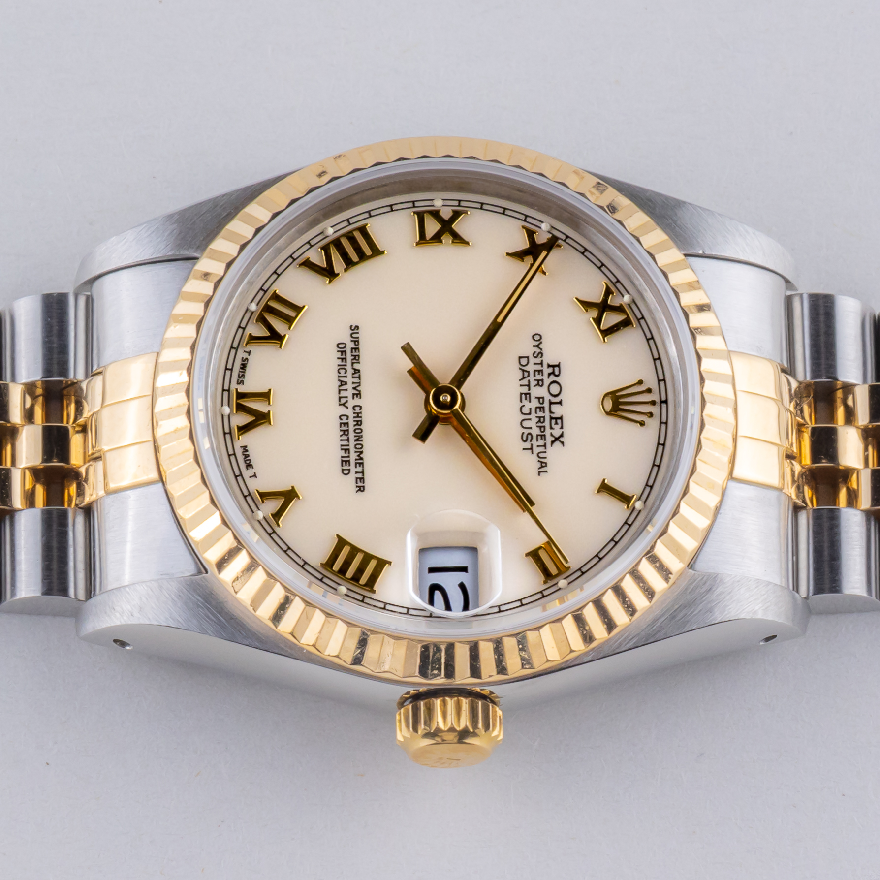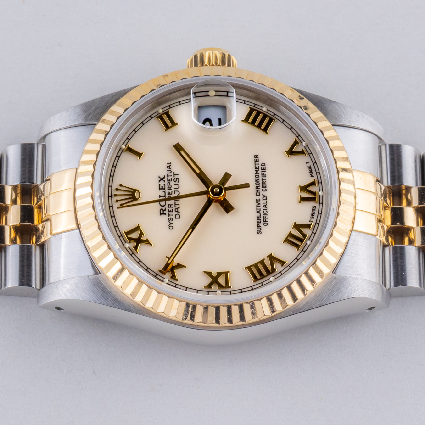 Rolex Oyster Perpetual Datejust Mid-Size Referenz 68273 aus dem Jahr 1991 mit komplettem Set. Die Datejust 68273 misst ein 31mm Gold/Edelstahl-Gehäuse, ein Gold/Edelstahl-Jubilee-Armband und eine geriffelte 18k Goldlünette. Diese Datejust 68273 verfügt über ein Automatikwerk Kaliber 3135 mit Schnellverstellung des Datums, ein kratzfestes Saphirglas und ein cremefarbenes Zifferblatt mit Tritiumzeigern und Römischen markierungen.