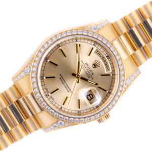 Rolex Oyster Perpetual Day-Date Referenz 118388 aus dem Jahr 2001. Die Day-Date 118388 hat ein 36-mm-Gehäuse aus 18-karätigem Gold (mit diamantbesetzten Bandanstößen), ein 18-karätiges President-Band mit Kronenverschluss und eine kannelierte Lünette aus 18-karätigem Gold mit Diamanten. Die Day-Date 118388 ist mit einem Automatikwerk Kaliber 3155 mit doppelter Schnellverstellung für Tag und Datum, einem kratzfesten Saphirglas und einem silbernen Zifferblatt ausgestattet. Die Uhr wird mit der Originalbox, den Papieren und dem Handbuch geliefert.