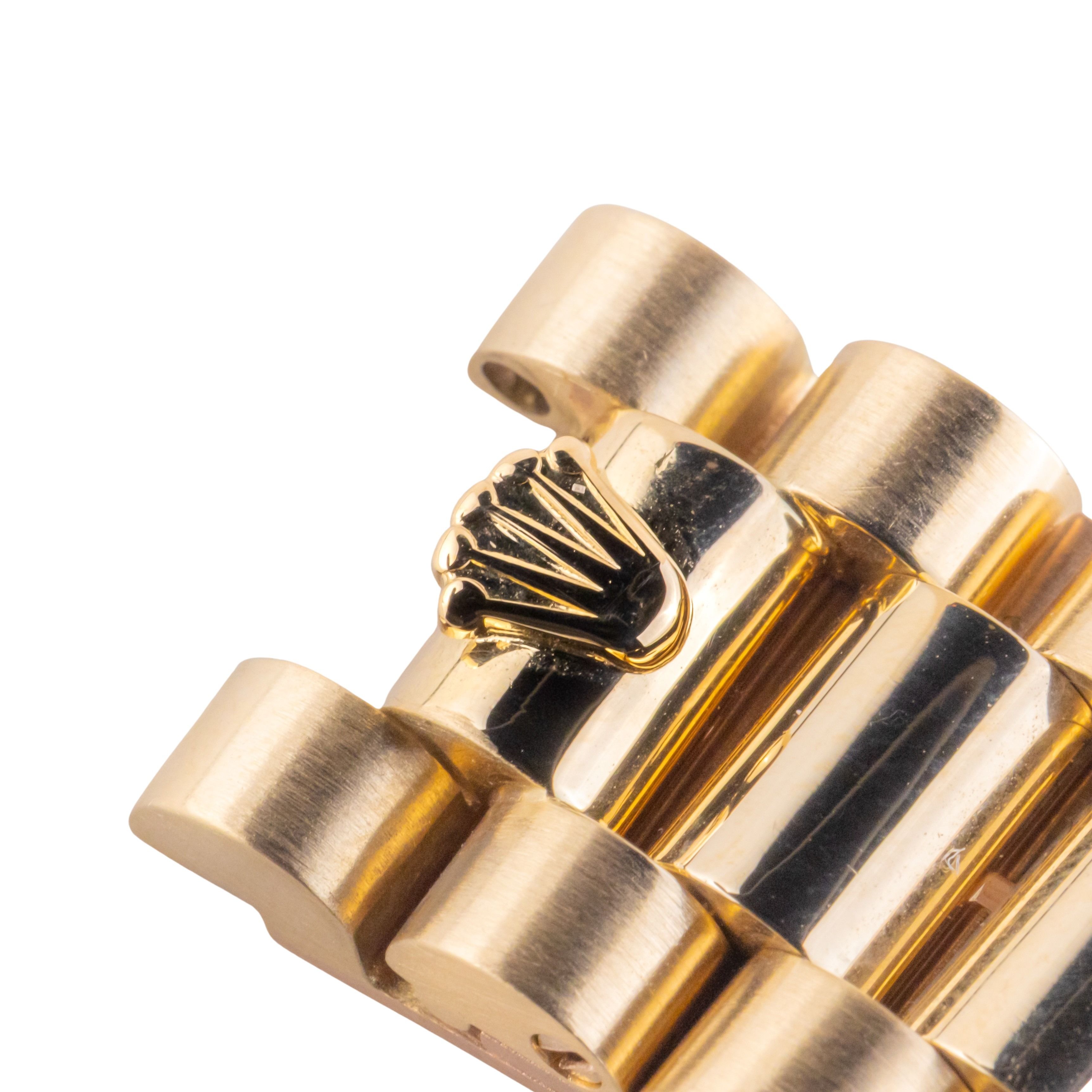 Rolex Oyster Perpetual Day-Date Referenz 18038 aus dem Jahr 1987. Die Day-Date 18038 misst ein 36-mm-Gehäuse aus 18-karätigem Gold, ein 18-karätiges Präsidentenarmband mit Kronenschließe und eine kannelierte Lünette aus 18-karätigem Gold. Die Day-Date 18038 verfügt über ein Automatikwerk Kaliber 3055 mit Schnellverstellung von Datum und Wochentag, ein kratzfestes Saphirglas und ein schwarzes Onyx Zifferblatt mit Tritiumzeigern.