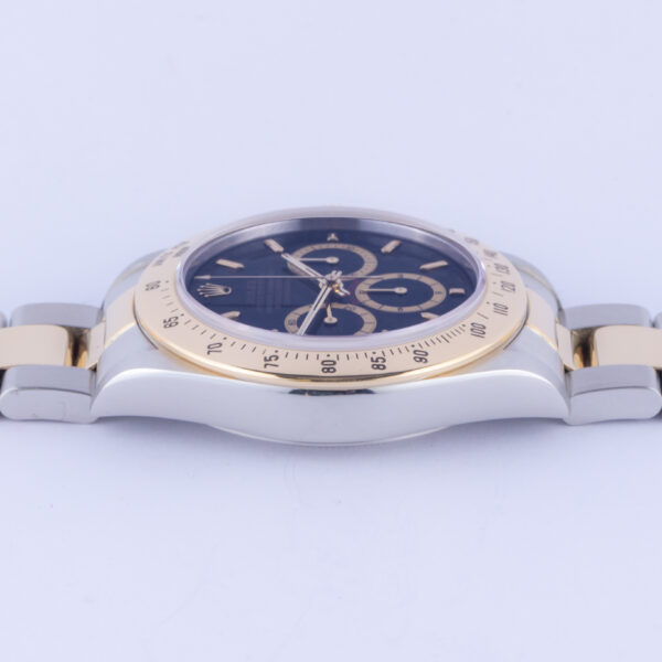 Rolex Daytona 16523 mit Schwarzes-Zifferblatt von 1990. Die Rolex Daytona Referenz 16523 misst ein 40mm Edelstahlgehäuse, ein 18k Gelbgold / Edelstahl Oyster-Armband und 18k Gelbgold Tachymeter Lünette. Die Daytona 16523 wird von einem automatischen Zenith Uhrwerk Kaliber 4030 angetrieben und verfügt über ein kratzfestes Saphirglas.