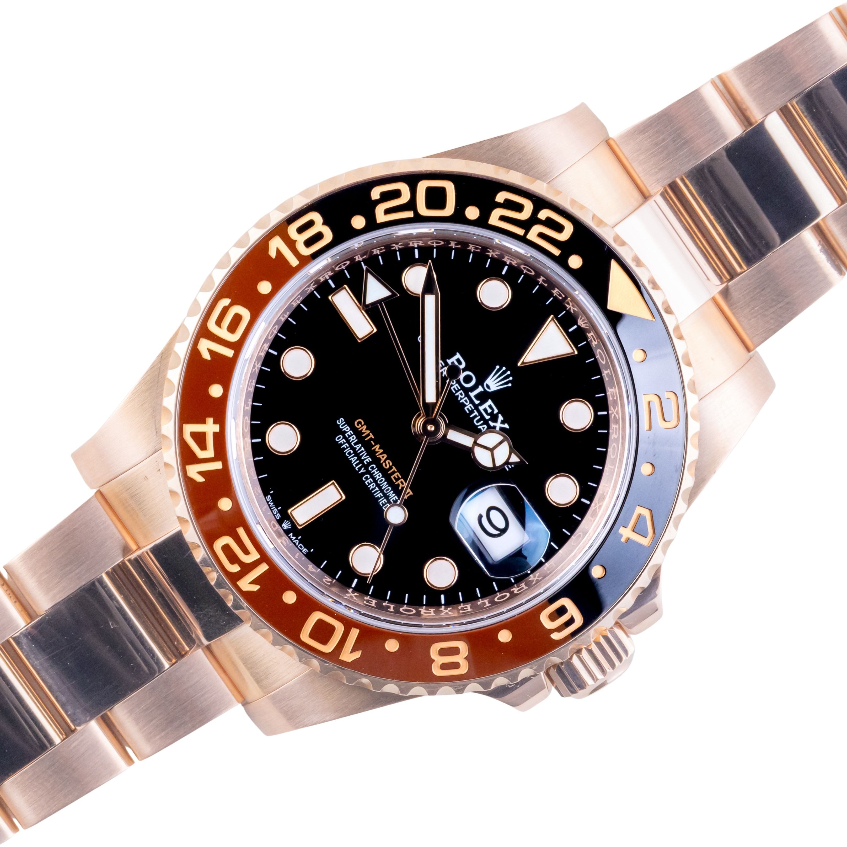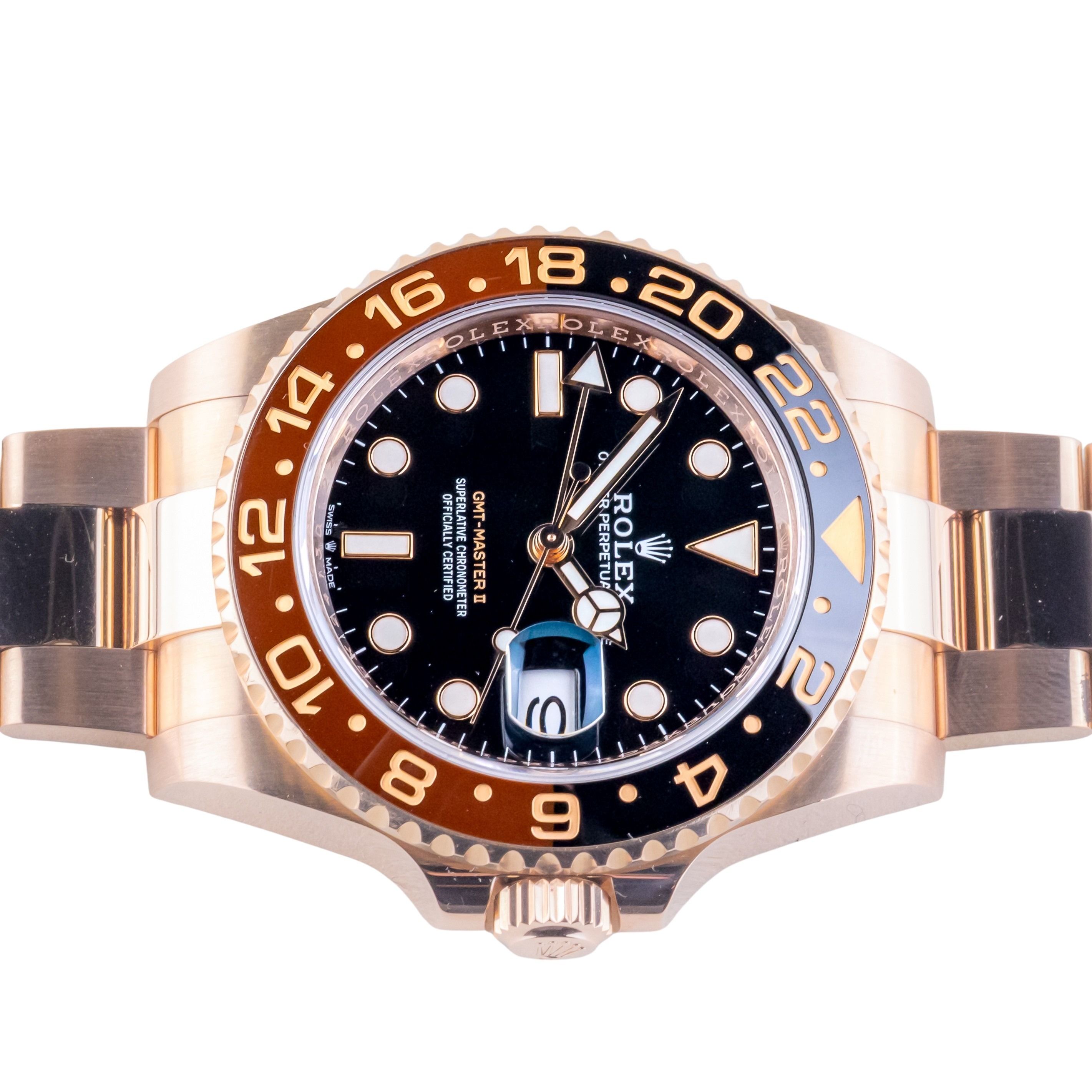 Rolex GMT-Master II Referenz 126715CHNR aus dem Jahr 2021 inklusive Komplettset. Die GMT-Master II 126715CHNR misst ein 40mm Roségoldgehäuse, ein Oyster-Armband mit Oysterclasp und CH/NR Keramiklünette. Die GMT-Master II 126715CHNR verfügt über ein Automatikkaliber 3285 mit Schnellverstellung des Datums, ein kratzfestes Saphirglas und ein schwarzes Zifferblatt mit Chromalight-Anzeige.