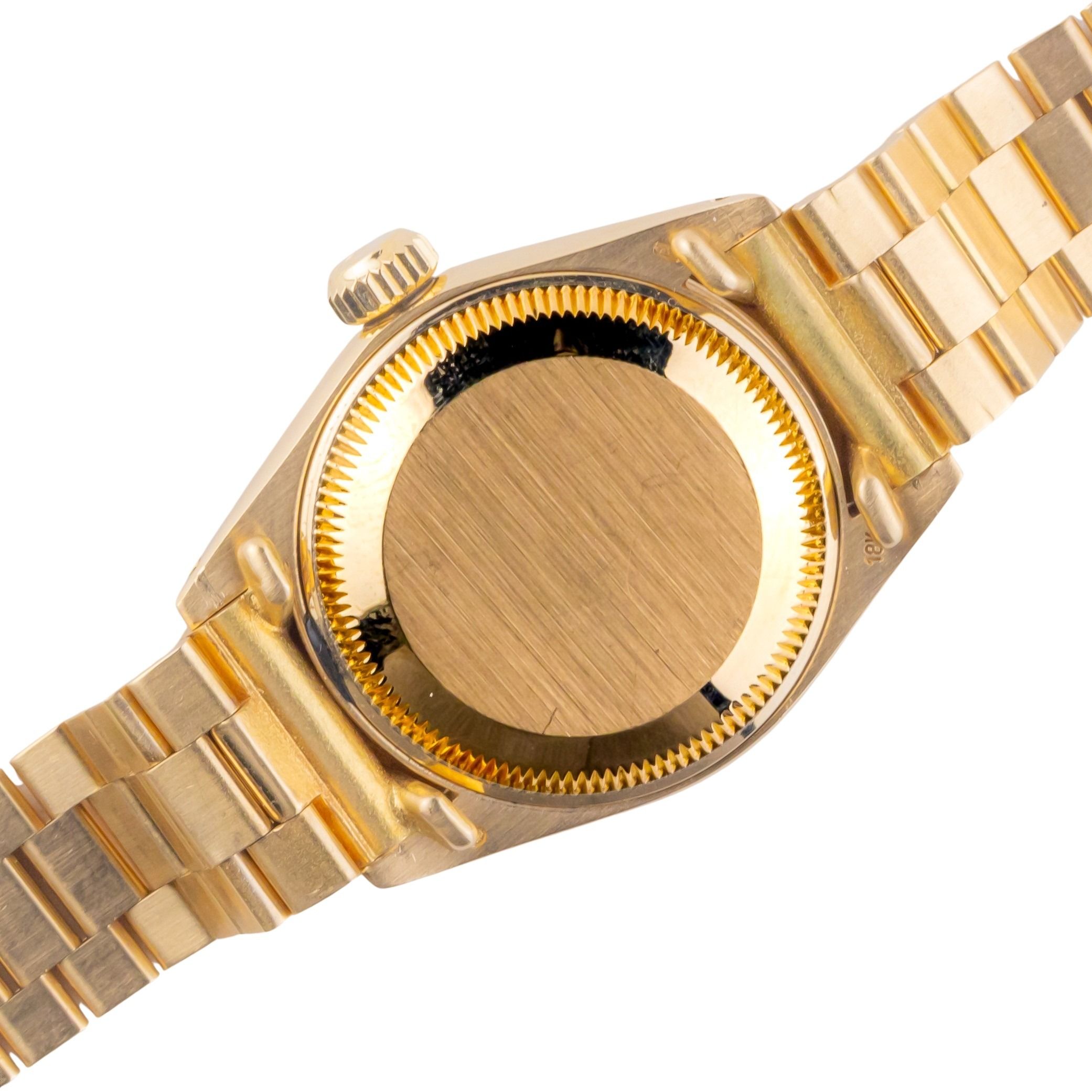 Rolex Lady-Datejust Referenz 6917/8 aus dem Jahr 1978 mit komplettem Set. Die Lady-Datejust 6917/8 misst ein 26mm Goldgehäuse, Gold President und geriffelte 18k Goldlünette. Diese Lady-Datejust 6917/8 verfügt über ein Automatikwerk Kaliber 2035 mit Quickset-Datum-Funktion, Plexiglas und ein Schwarzes-Zifferblatt.