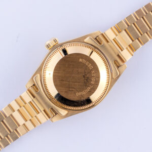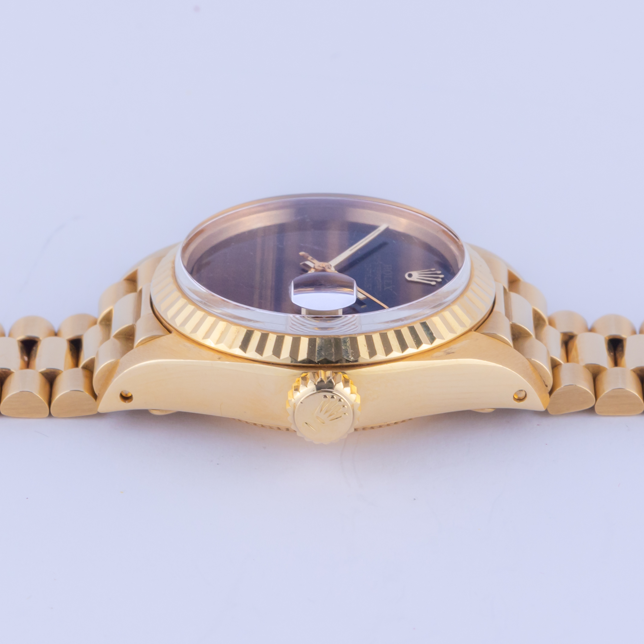 Rolex Lady-Datejust Referenz 6917/8 aus dem Jahr 1982 mit komplettem Set. Die Lady-Datejust 6917/8 misst ein 26mm Goldgehäuse, Gold President und geriffelte 18k Goldlünette. Diese Lady-Datejust 6917/8 verfügt über ein Automatikwerk Kaliber 2035 mit Quickset-Datum-Funktion, Plexiglas und ein Tigerauge-Zifferblatt.