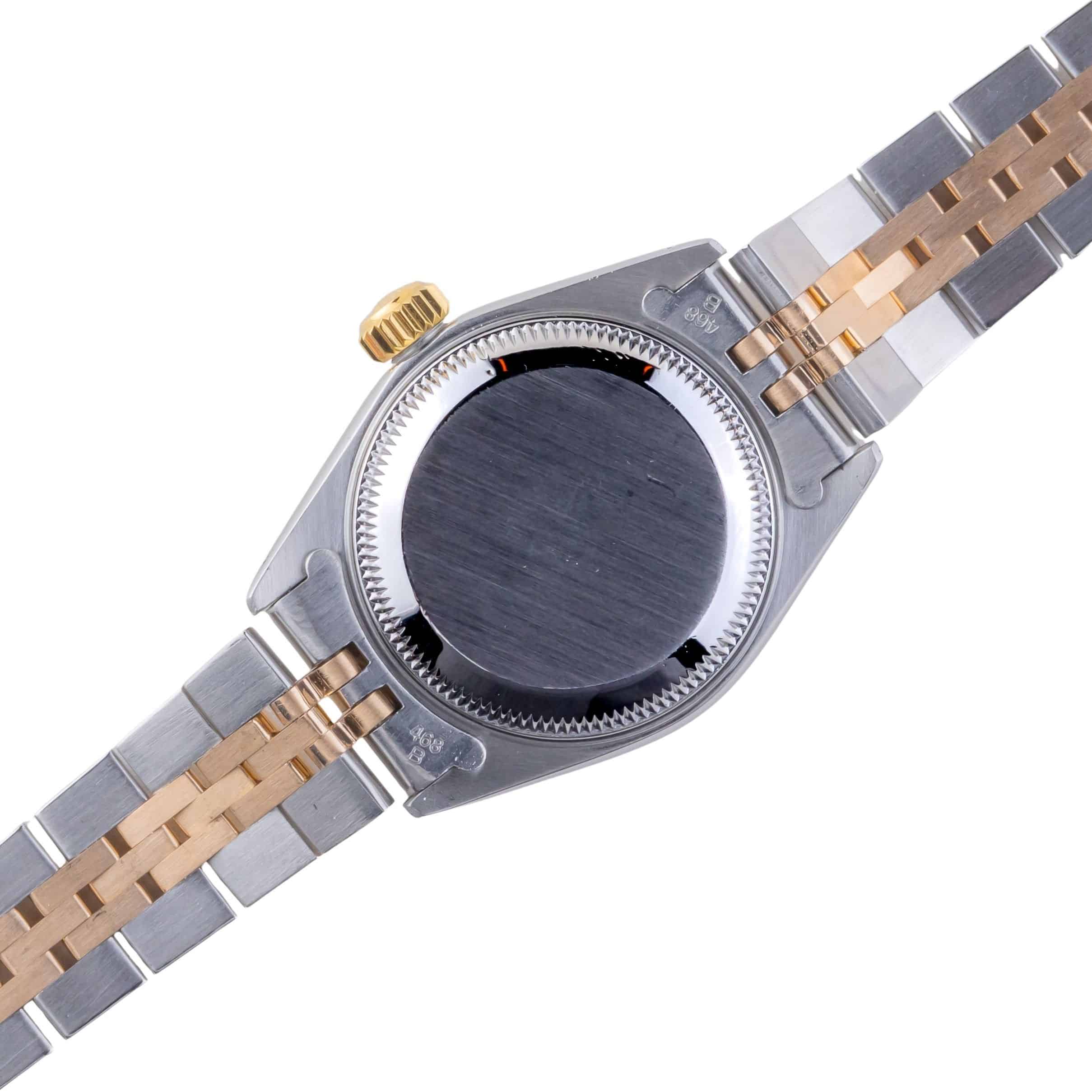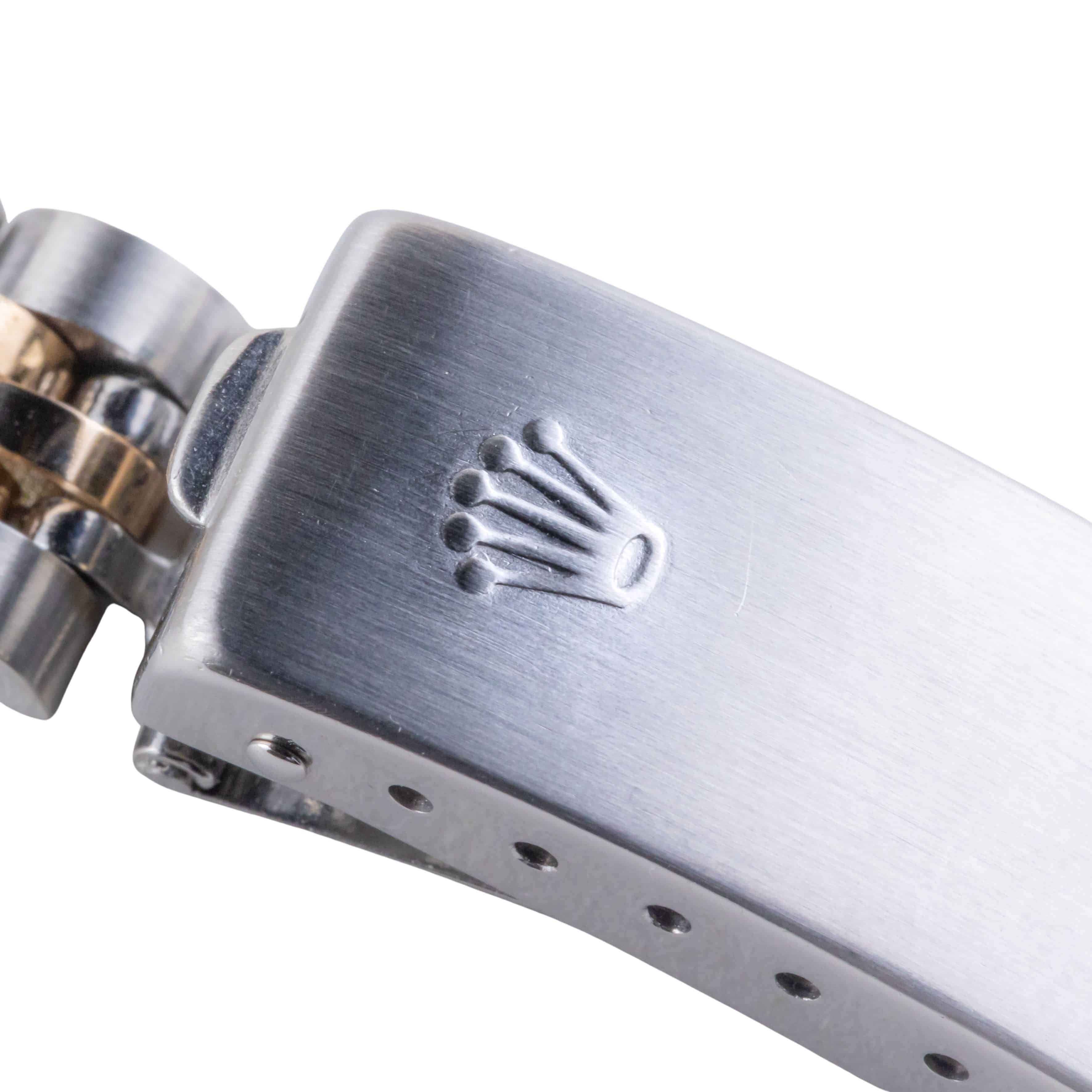 Rolex Oyster Perpetual Lady-Datejust Referenz 69173 aus dem Jahr 1990 mit komplettem Set. Die Lady-Datejust 69173 misst eine 26mm Gold und Edelstahl-Gehäuse, zwei-Ton-Jubiläum Armband und geriffelte 14k Gold Lünette. Diese Lady-Datejust 69173 verfügt über ein Automatikwerk Kaliber 2135 mit Quickset Datum Funktion, eine Kratzfestigkeit Saphirglas und ein Champagner Zifferblatt mit Tritium Zeiger.