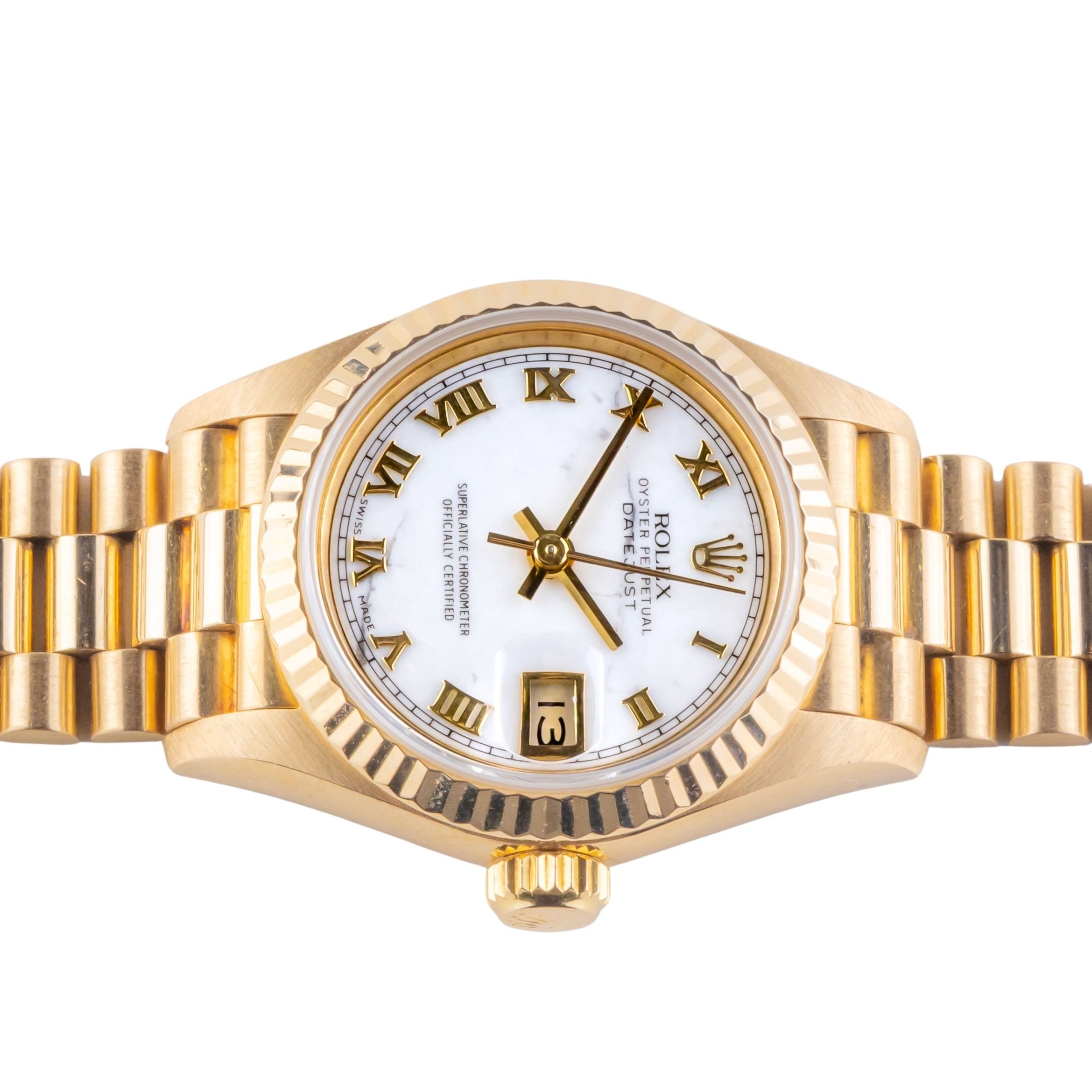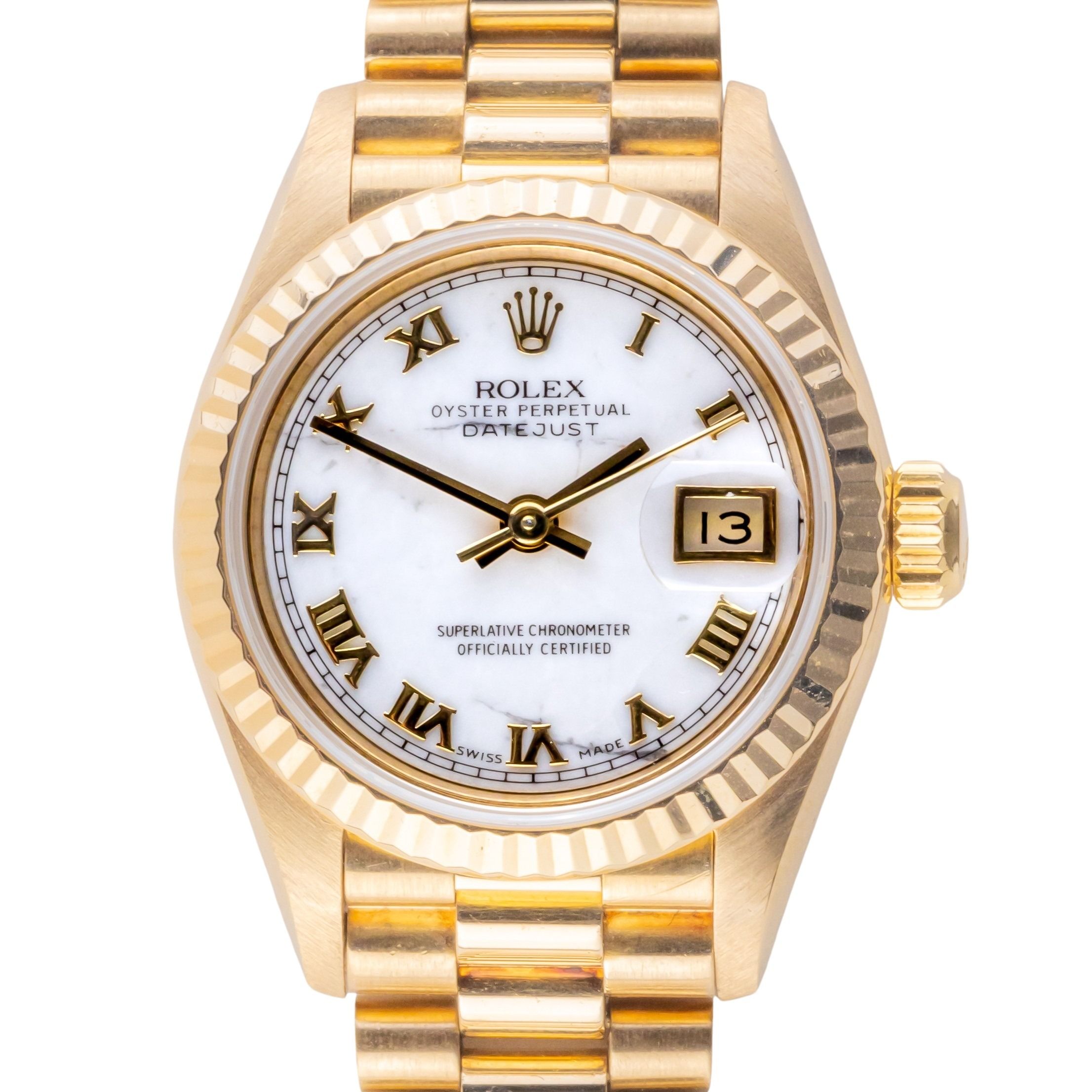 Rolex Oyster Perpetual Lady-Datejust Referenz 69178 aus dem Jahr 1990 mit komplettem Set. Die Lady-Datejust 69178 misst ein 26-mm-Goldgehäuse, ein goldenes Jubiläumsarmband und eine kannelierte Lünette aus 18 Karat Gelbgold. Diese Lady-Datejust 69178 verfügt über ein Automatikwerk Kaliber 2135 mit Quickset-Datum-Funktion, Saphirglas und ein howlite Zifferblatt.