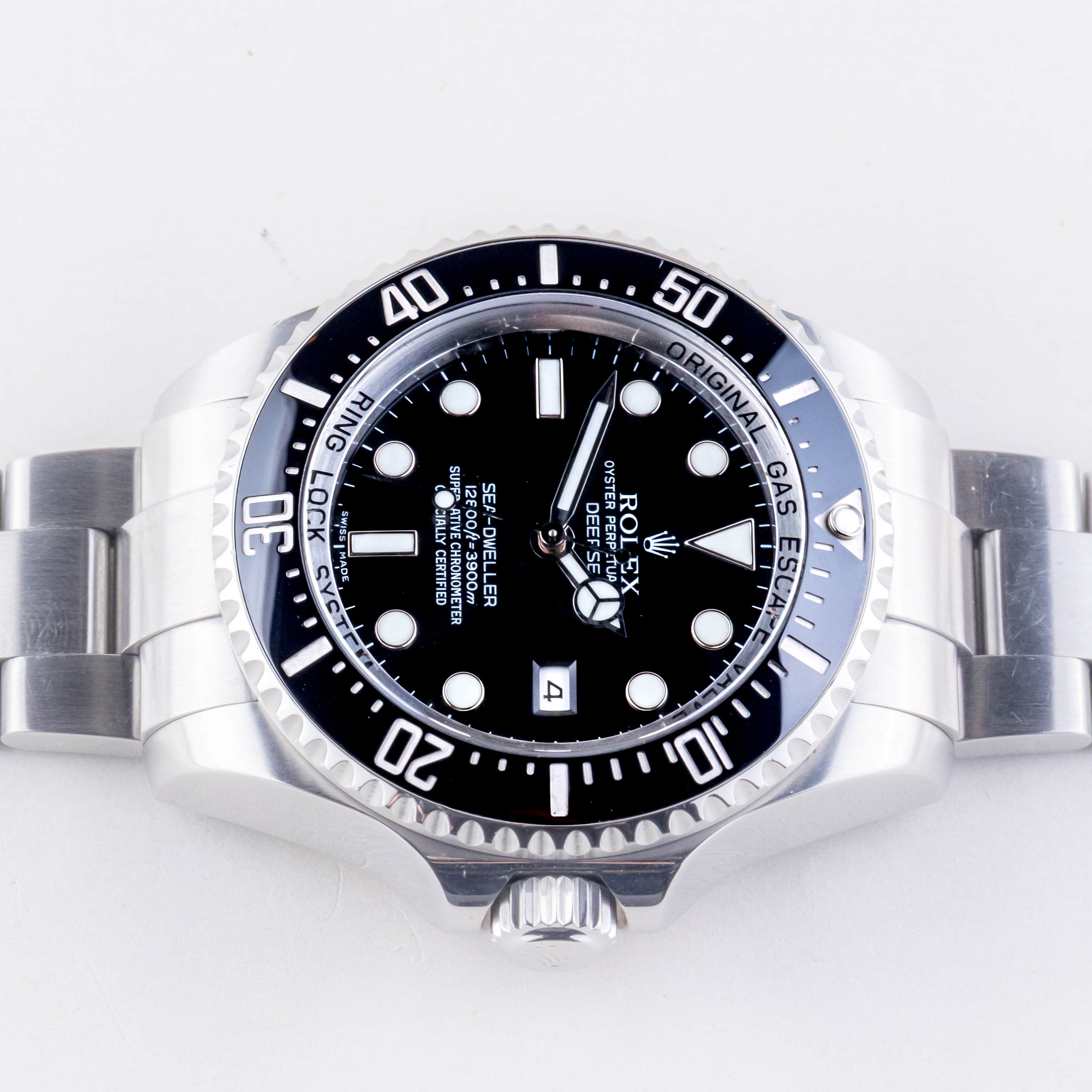 Rolex Oyster Perpetual Sea-Dweller Referenz 116660 aus dem Jahr 2009. Die Rolex Sea-Dweller 116660 hat ein 44-mm-Stahlgehäuse, ein Oyster-Stahlband mit Oyster-Schließe und eine drehbare Aluminiumlünette (schwarze Lünette). Die Sea-Dweller 116660 verfügt über ein Automatikwerk Kaliber 3135 mit Schnellverstellung des Datums, ein kratzfreies Saphirglas und ein schwarzes Zifferblatt mit Chromalight-Anzeige. Diese Uhr wird mit der Originalbox, der Rolex-Karte, den Handbüchern und der 4-Jahres-Garantie von Rolex geliefert.