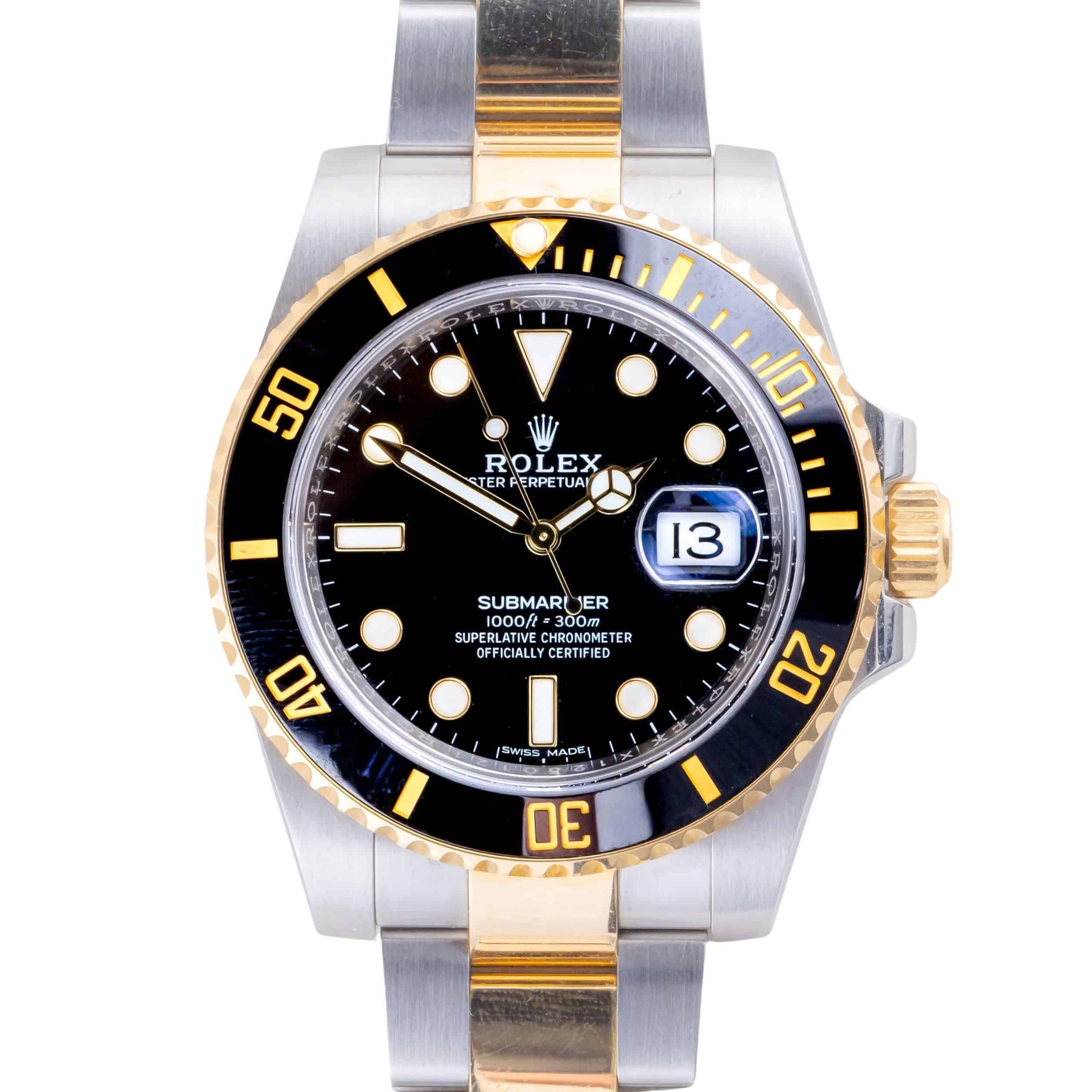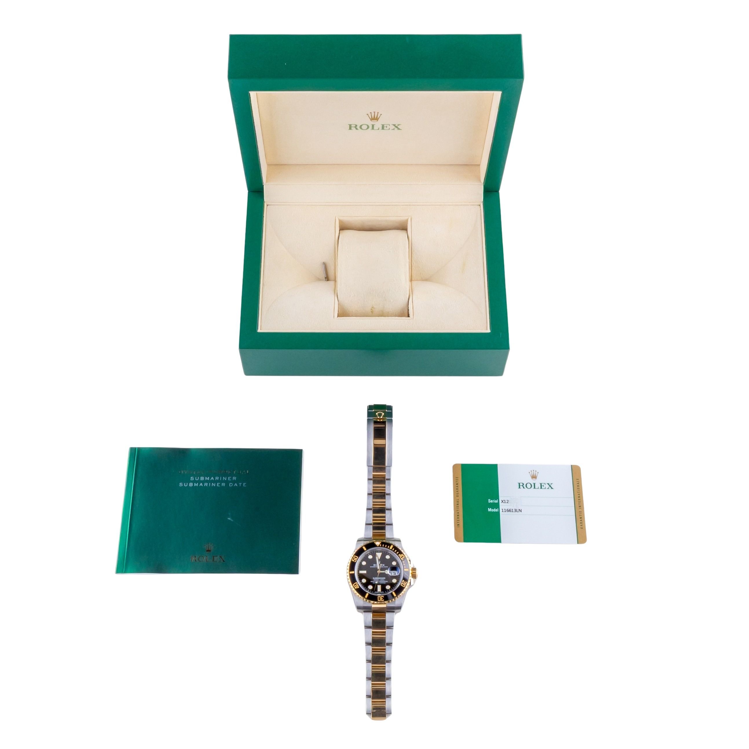Rolex Submariner Date Referenz 116613LN von 2017 einschließlich voller Satz. Die Submariner Date misst ein 40mm Gold / Edelstahl-Gehäuse, ein Gold / Edelstahl Oyster Armband w / Oysterlock Schließe und eine Keramik (drehbar) Lünette. Die Submariner Date 116613LN verfügt über ein Automatikwerk Kaliber 3135, ein kratzfestes Saphirglas und ein schwarzes Zifferblatt mit Chromalight-Anzeige.