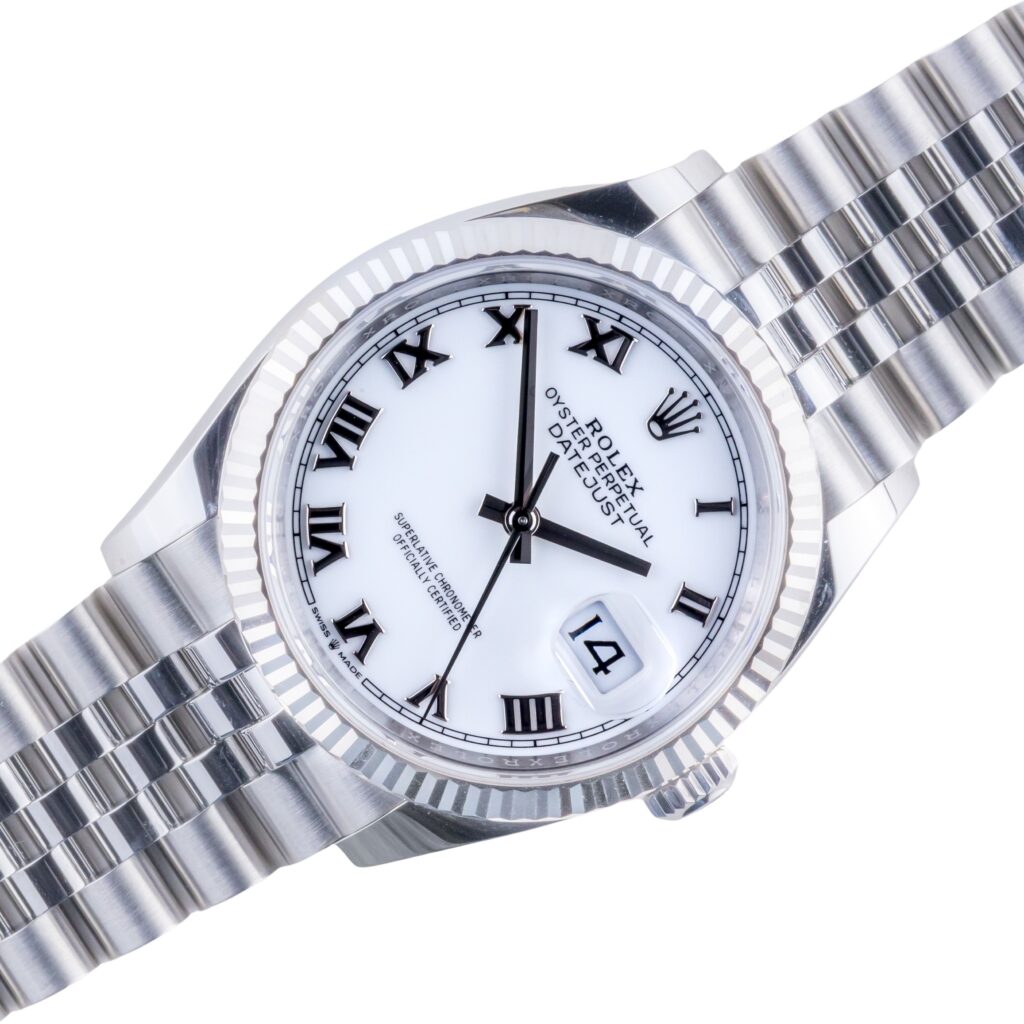 Rolex Oyster Perpetual Datejust referentie 126234 uit 2024. De Datejust 126234 bevat een 36mm stalen kast, een stalen jubilee band met oystersluiting, en een 18k witgouden fluted bezel. De Datejust 126234 bevat een automatisch uurwerk kaliber 3235 met een quickset datum functie, een krasbestendig saffierglas en een witte wijzerplaat met Romeinse markeringen. Dit horloge wordt met de originele doos, warranty kaart en boekjes geleverd.