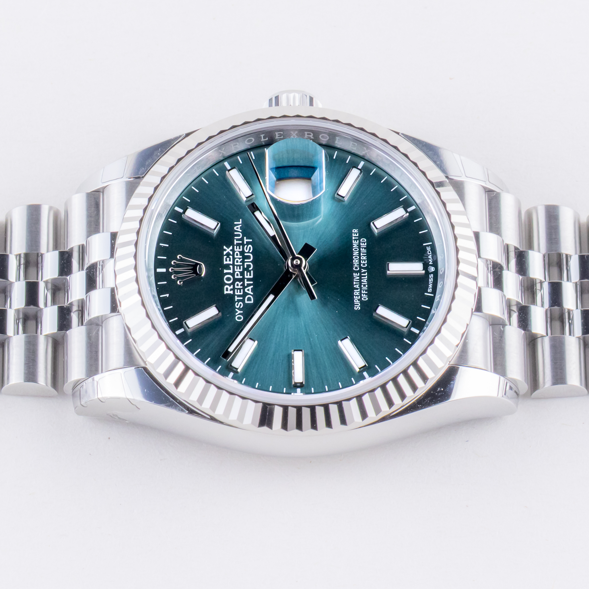 Rolex Oyster Perpetual Datejust referentie 126234 uit 2025. De Datejust 126234 bevat een 36mm stalen kast, een stalen jubilee band met oystersluiting, en een 18k witgouden fluted bezel. De Datejust 126234 bevat een automatisch uurwerk kaliber 3235 met een quickset datum functie, een krasbestendig saffierglas en een mintgroene wijzerplaat. Dit horloge wordt met de originele doos, warranty kaart en boekjes geleverd.
