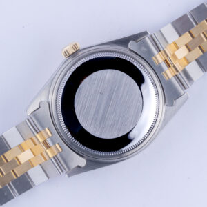 Lees meer...De Rolex Datejust 16013 die wij aanbieden komt uit 1986 en loopt op het automatische 3035 uurwerk van Rolex. Dit zeer betrouwbare uurwerk zit in een robuuste 36mm oystercase met de kenmerkende 18kt geelgouden fluted bezel. Daarnaast heeft dit horloge een prachtige witte wijzerplaat met eenvoudige markeringen. De geweldige afwerking van de wijzerplaat is iets waar de Datejust bekend om staat. De two-tone jubilee band is voorzien van de sterke vouwsluiting met kenmerkende Rolex kroon.
