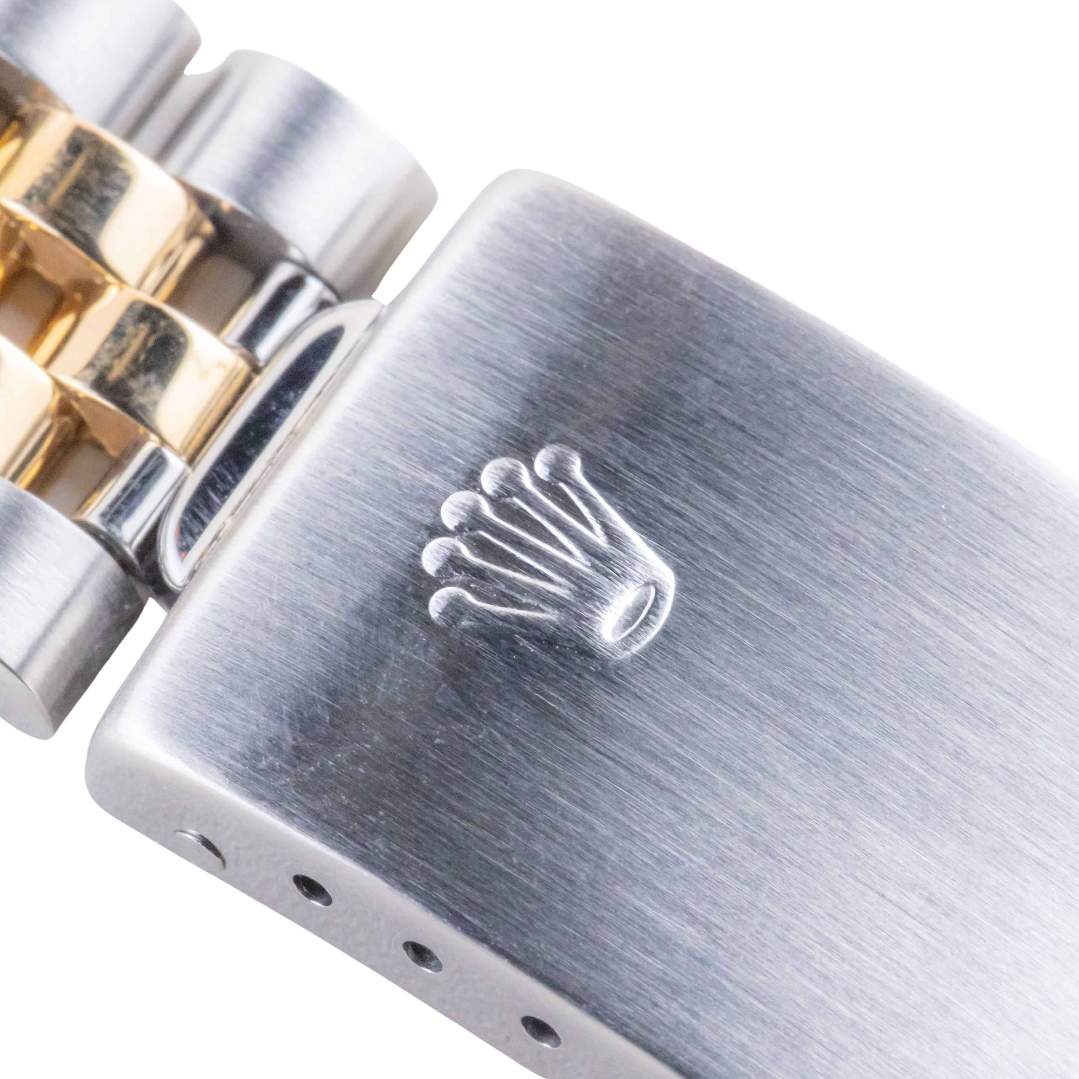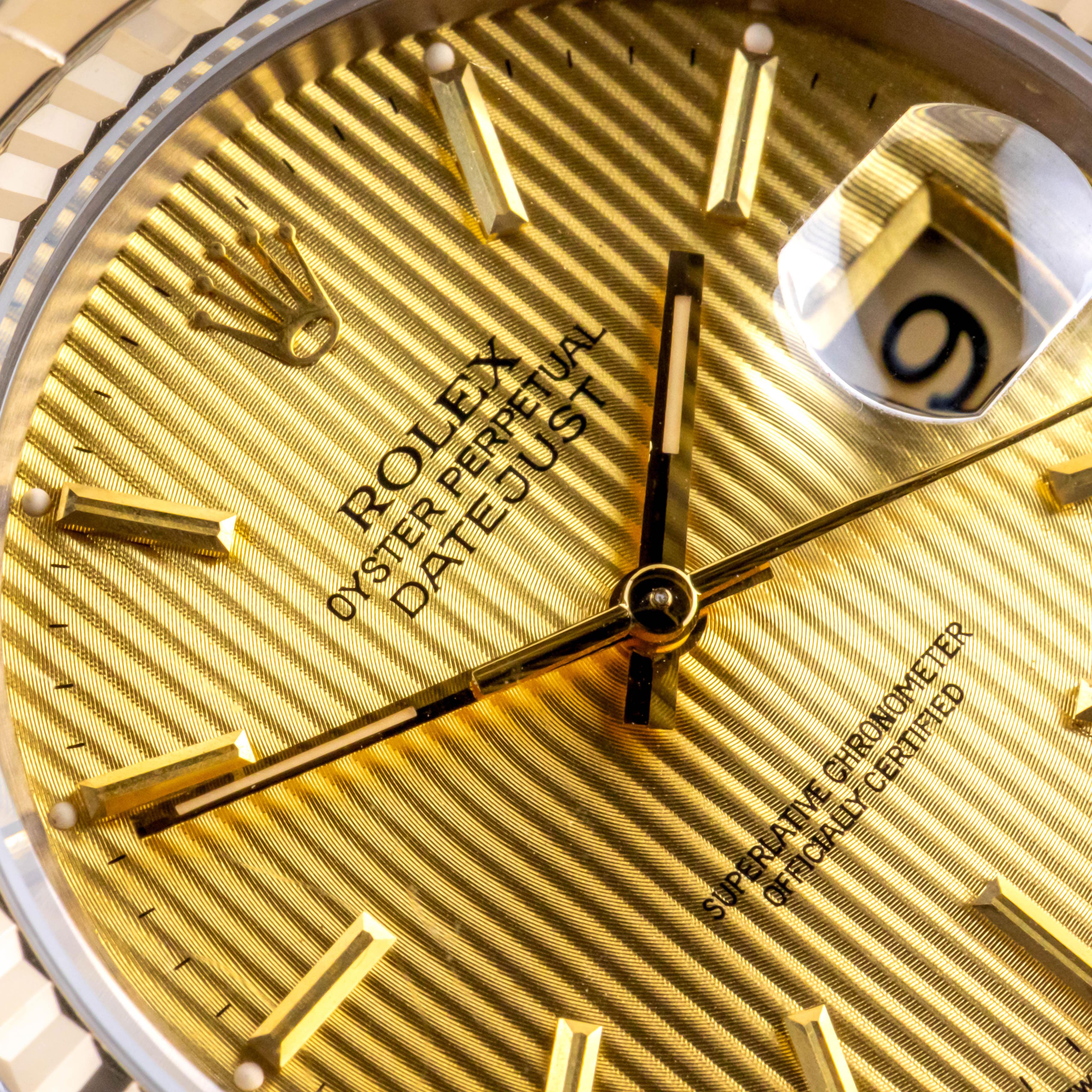 Lees meer...De Rolex Datejust 16233 die wij aanbieden komt uit 1990 en loopt op het automatische 3135 uurwerk van Rolex. Dit zeer betrouwbare uurwerk zit in een robuuste 36mm oystercase met de kenmerkende 18kt geelgouden fluted bezel. Daarnaast heeft dit horloge een prachtige champagne tapestry wijzerplaat met eenvoudige minute track. De geweldige afwerking van de wijzerplaat is iets waar de Datejust bekend om staat. De two-tone jubilee band is voorzien van de sterke vouwsluiting met kenmerkende Rolex kroon.
