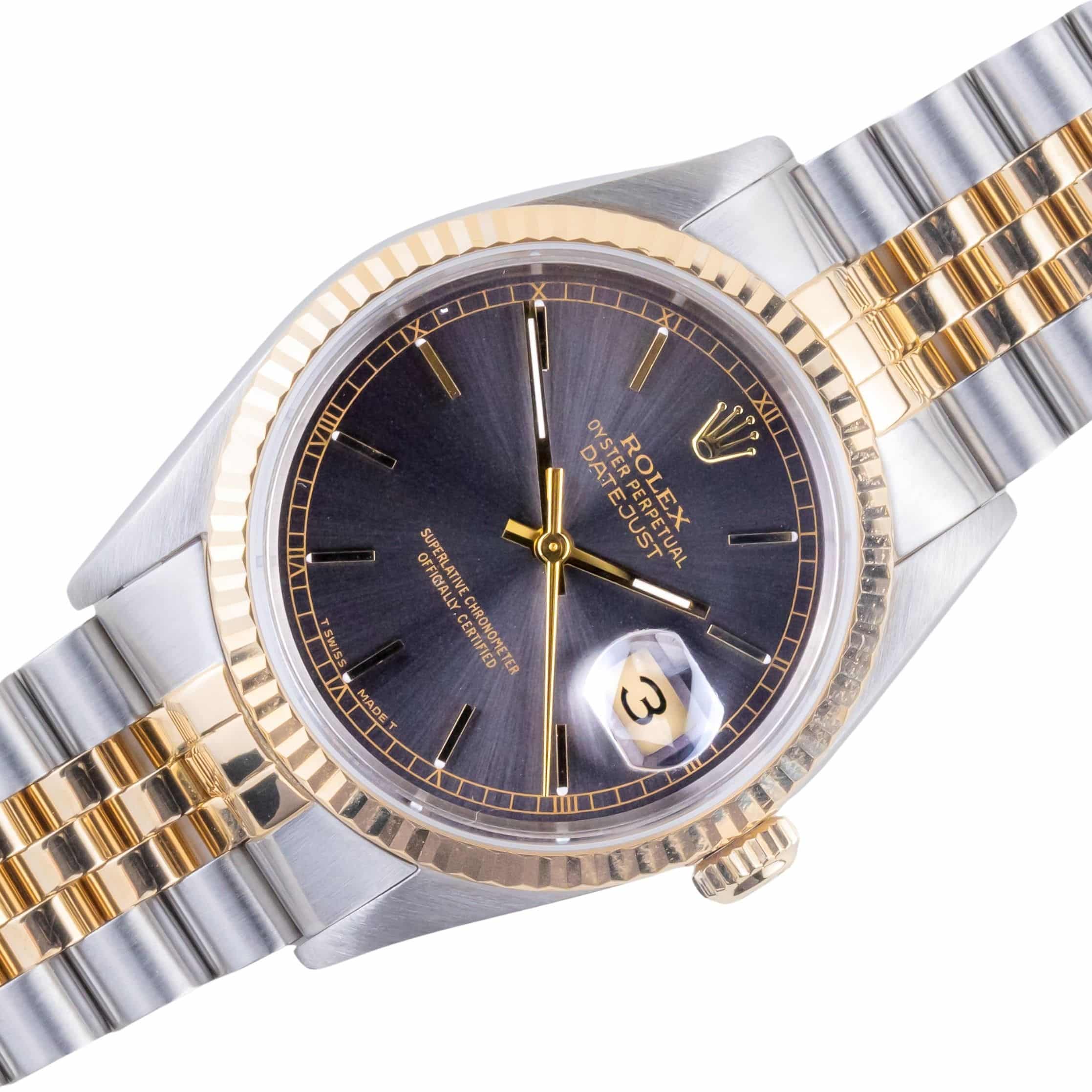 Lees meer...De Rolex Datejust 16233 die wij aanbieden komt uit 1993 en loopt op het automatische 3135 uurwerk van Rolex. Dit zeer betrouwbare uurwerk zit in een robuuste 36mm oystercase met de kenmerkende 18kt geelgouden fluted bezel. Daarnaast heeft dit horloge een prachtige grijze wijzerplaat. De geweldige afwerking van de wijzerplaat is iets waar de Datejust bekend om staat. De two-tone jubilee band is voorzien van de sterke vouwsluiting met kenmerkende Rolex kroon.