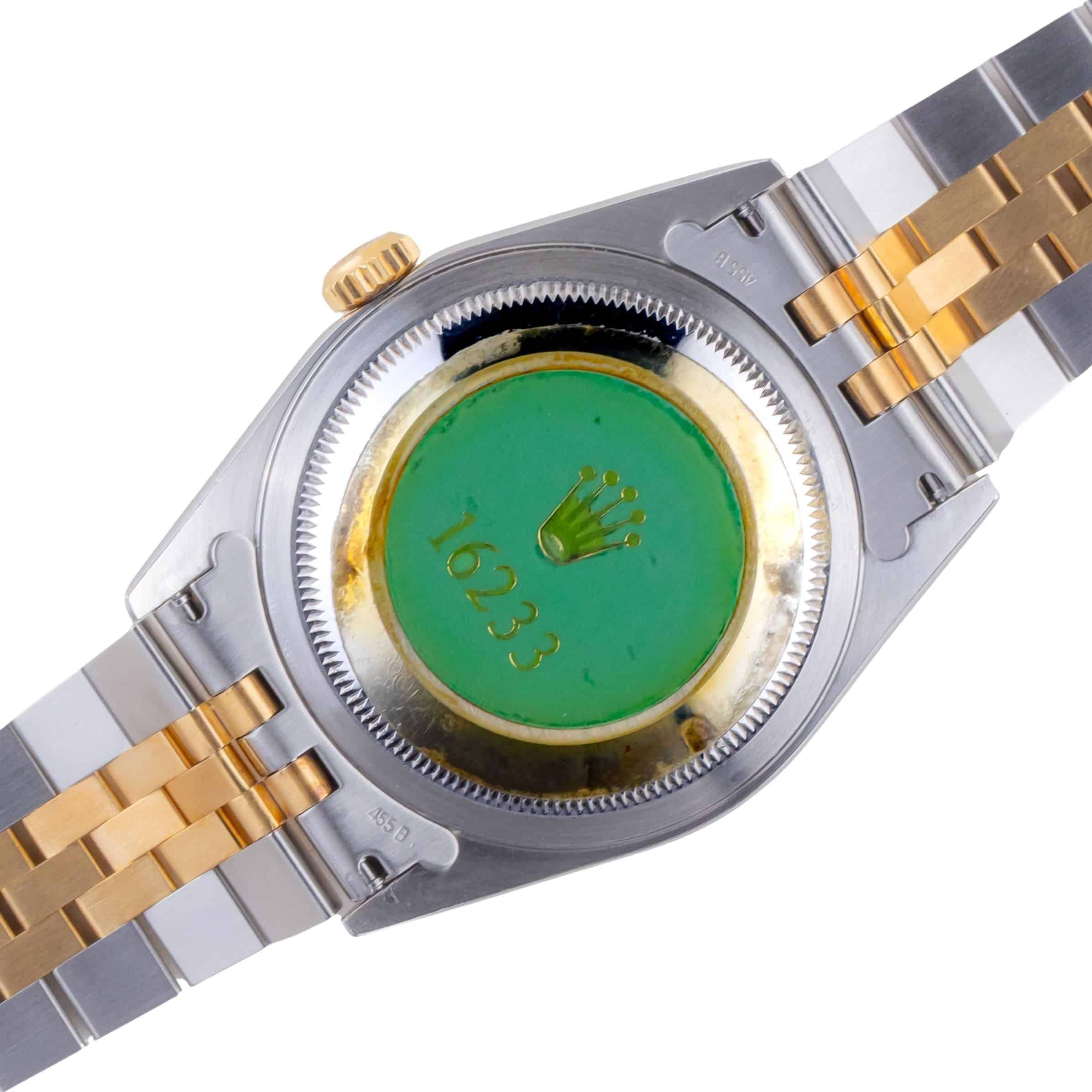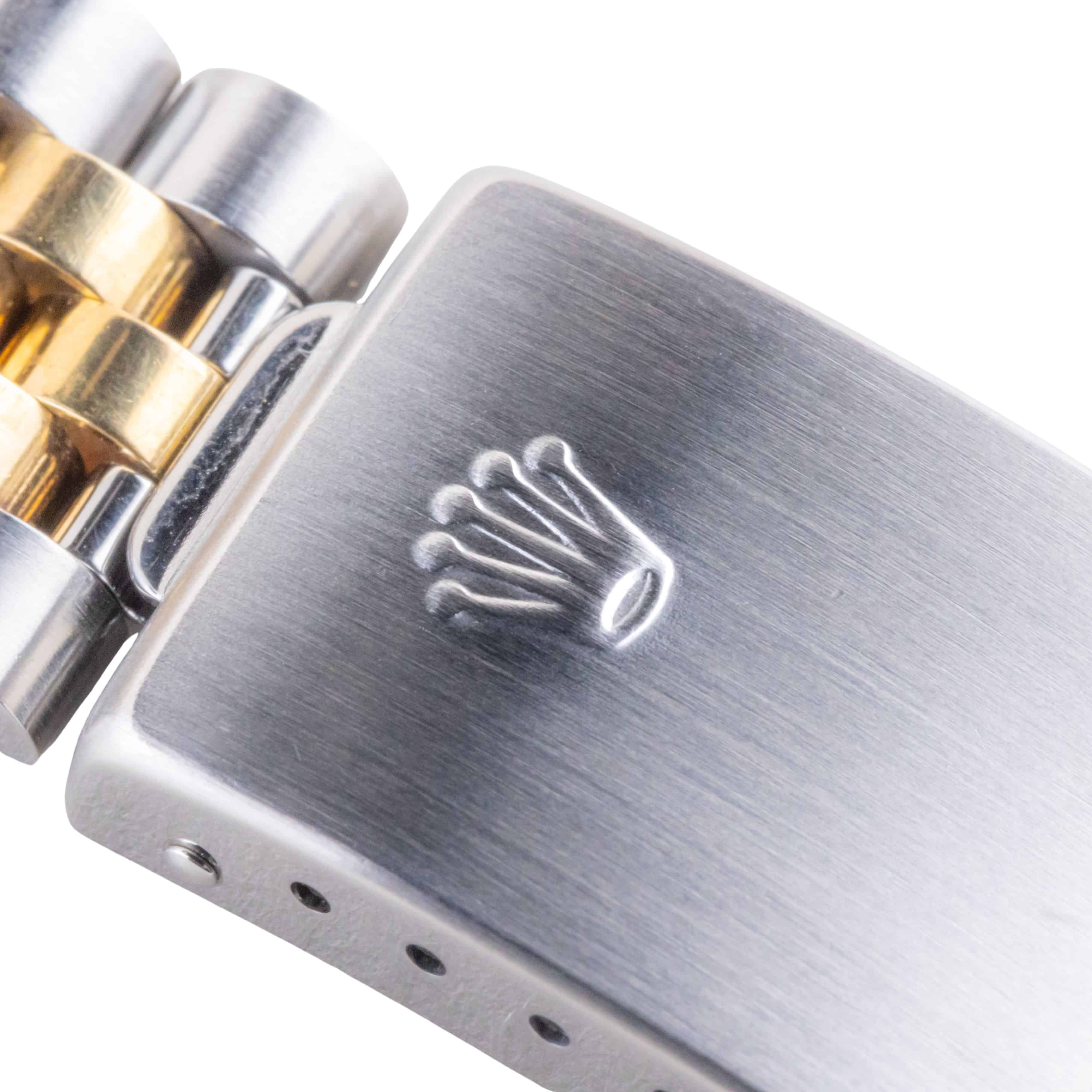 Lees meer...De Rolex Datejust 16233 die wij aanbieden komt uit 1997 en loopt op het automatische 3135 uurwerk van Rolex. Dit zeer betrouwbare uurwerk zit in een robuuste 36mm oystercase met de kenmerkende 18kt geelgouden fluted bezel. Daarnaast heeft dit horloge een prachtige pyramide wijzerplaat met Romeinse markeringen. De geweldige afwerking van de wijzerplaat is iets waar de Datejust bekend om staat. De two-tone jubilee band is voorzien van de sterke vouwsluiting met kenmerkende Rolex kroon.
