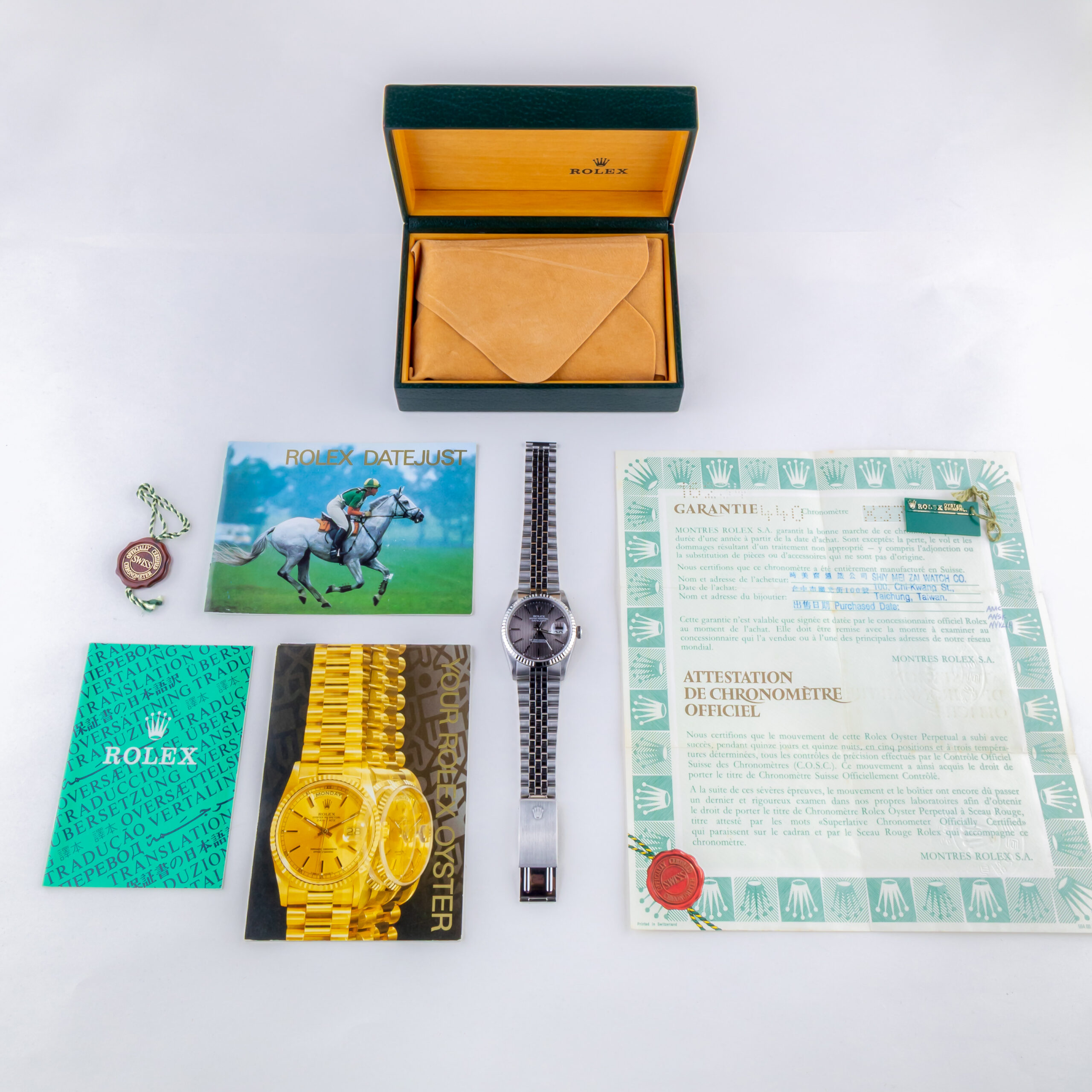 Deze Rolex Datejust 16234 uit 1990 is in mint conditie door de dikke kast, strakke bezel en stevige jubilee band. Het horloge komt met de originele doos, papieren en (handleiding)boekjes.