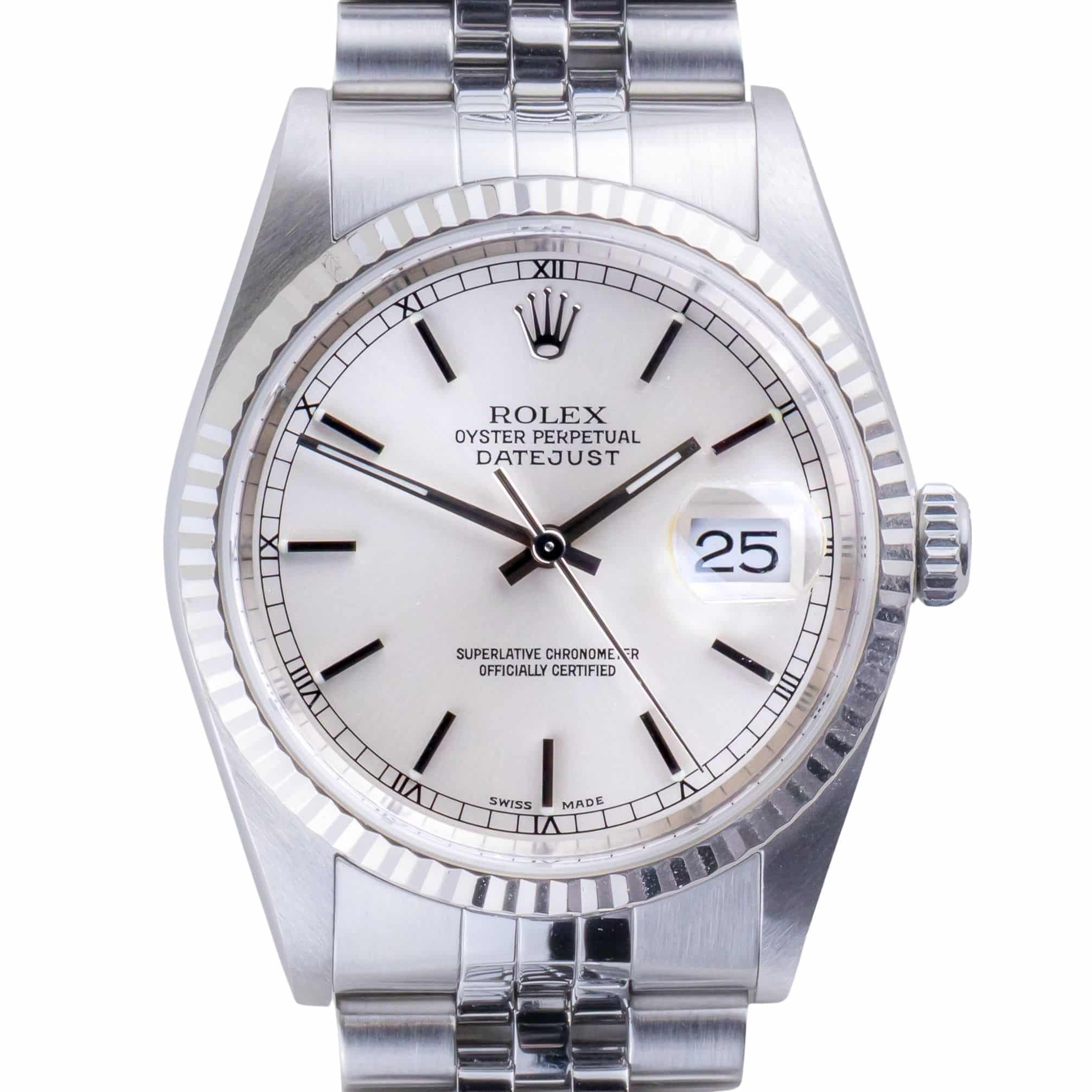 De Rolex Datejust 16234 die wij vandaag aanbieden komt uit 2000 en loopt op het automatische 3135 uurwerk van Rolex. Dit zeer betrouwbare uurwerk zit in een 36mm Oyster kast van staal met een witgouden fluted bezel. Daarnaast heeft dit horloge een prachtige zilveren wijzerplaat met tritium lumeplots en wijzers. De geweldige afwerking van de wijzerplaat is iets waar de Datejust bekend om staat, net als de iconische Jubilee band die er vaak bij komt. Deze Jubilee band is net als het horloge van staal gemaakt en heeft een vouwsluiting.