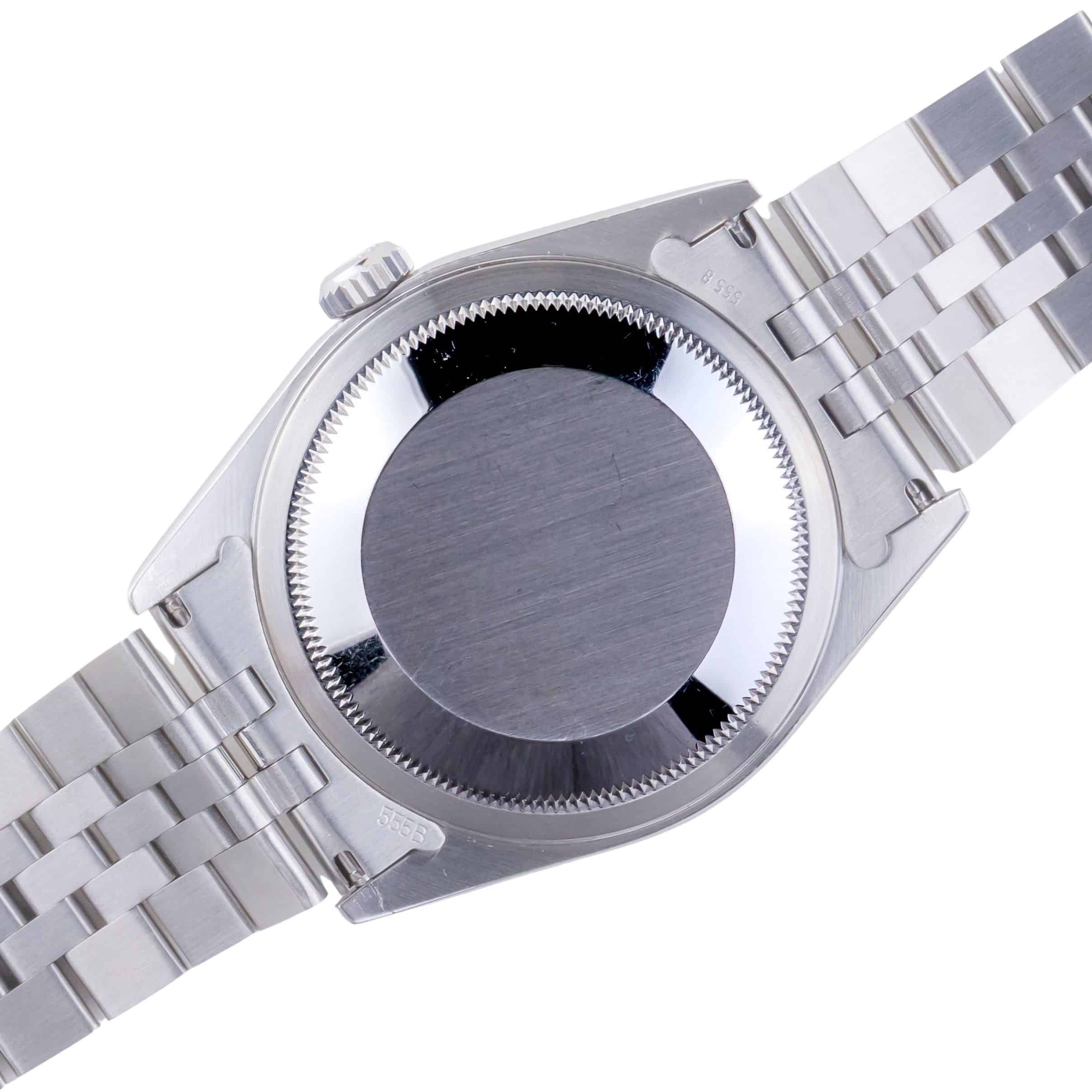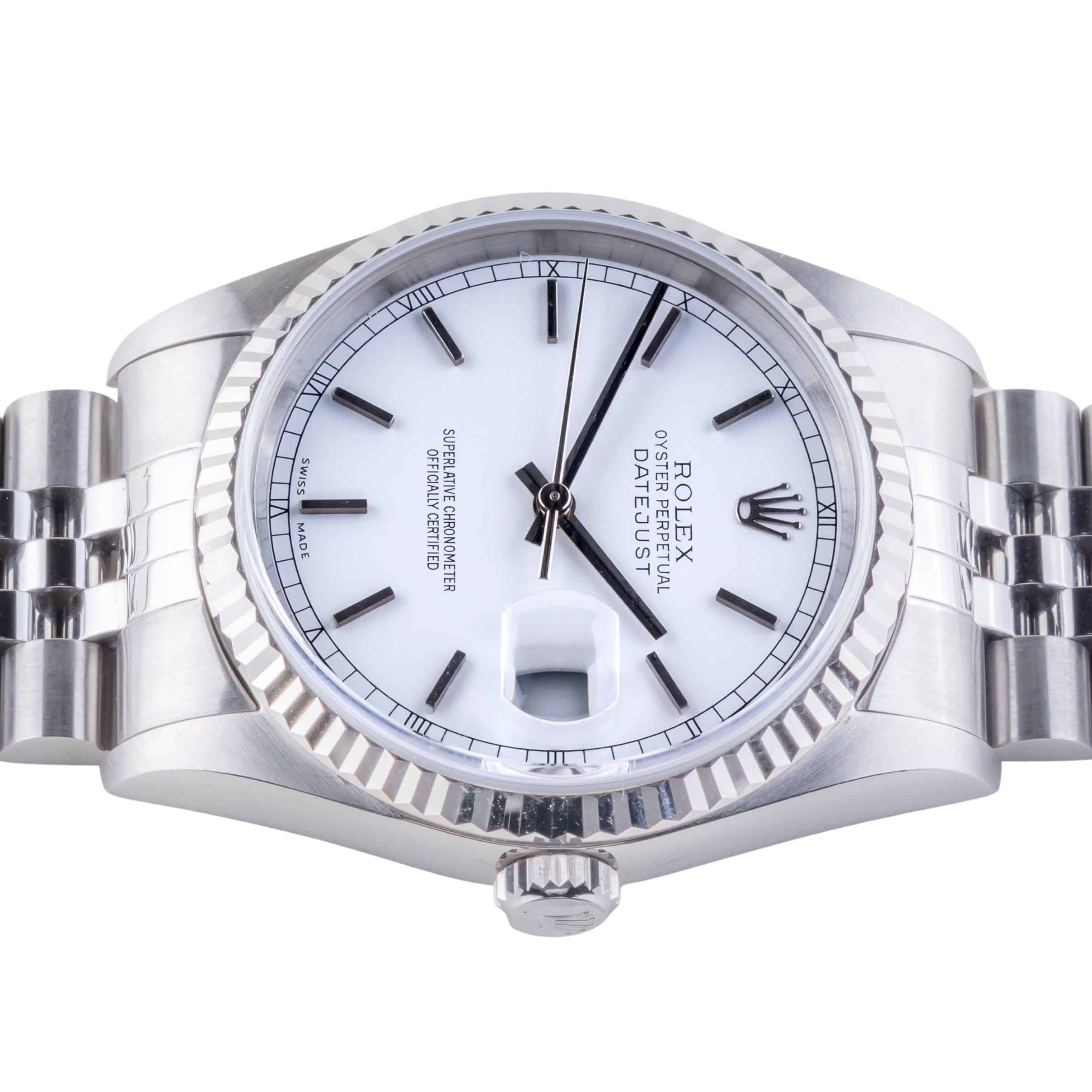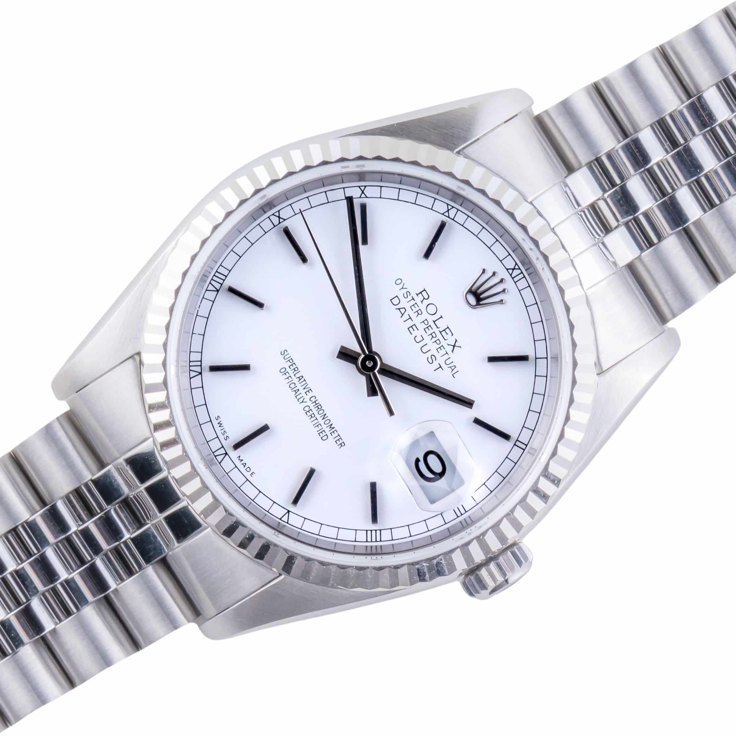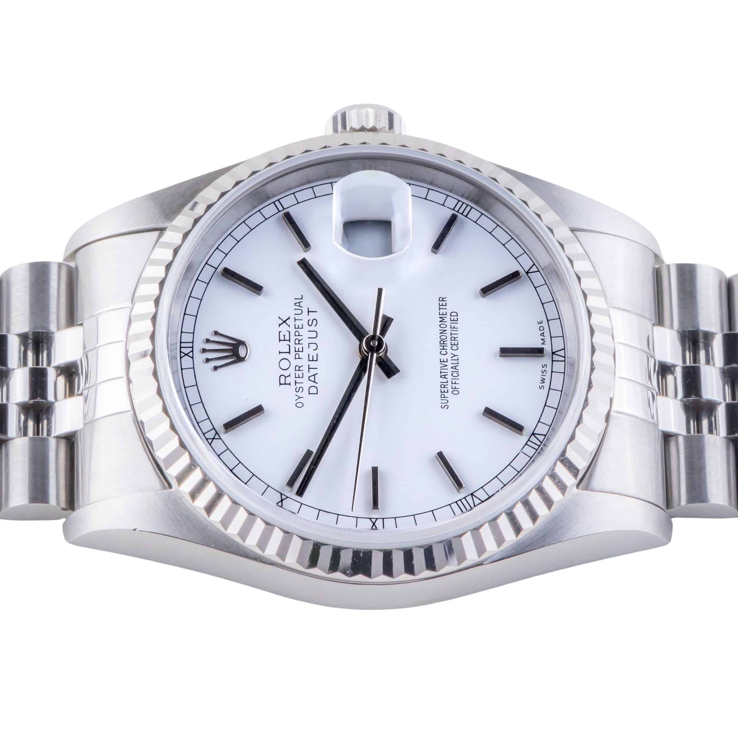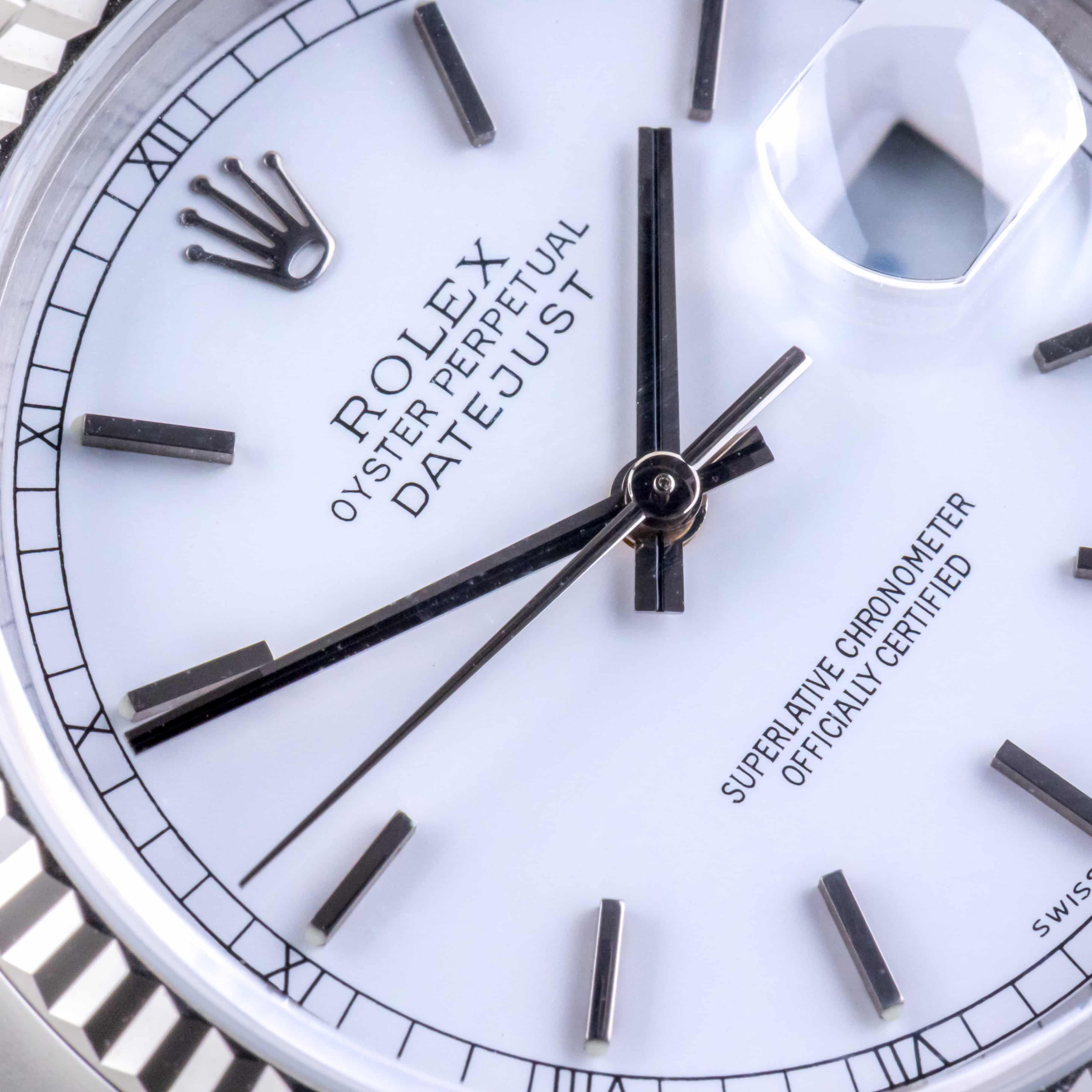 De Rolex Datejust 16234 die wij aanbieden komt uit 1997 en loopt op het automatische 3135 uurwerk van Rolex. Dit zeer betrouwbare uurwerk zit in een robuuste 36mm oystercase met de kenmerkende 18kt witgouden fluted bezel. Daarnaast heeft dit horloge een prachtige witte wijzerplaat met eenvoudige minute track. De geweldige afwerking van de wijzerplaat is iets waar de Datejust bekend om staat. De jubilee band is voorzien van de sterke vouwsluiting met kenmerkende Rolex kroon.