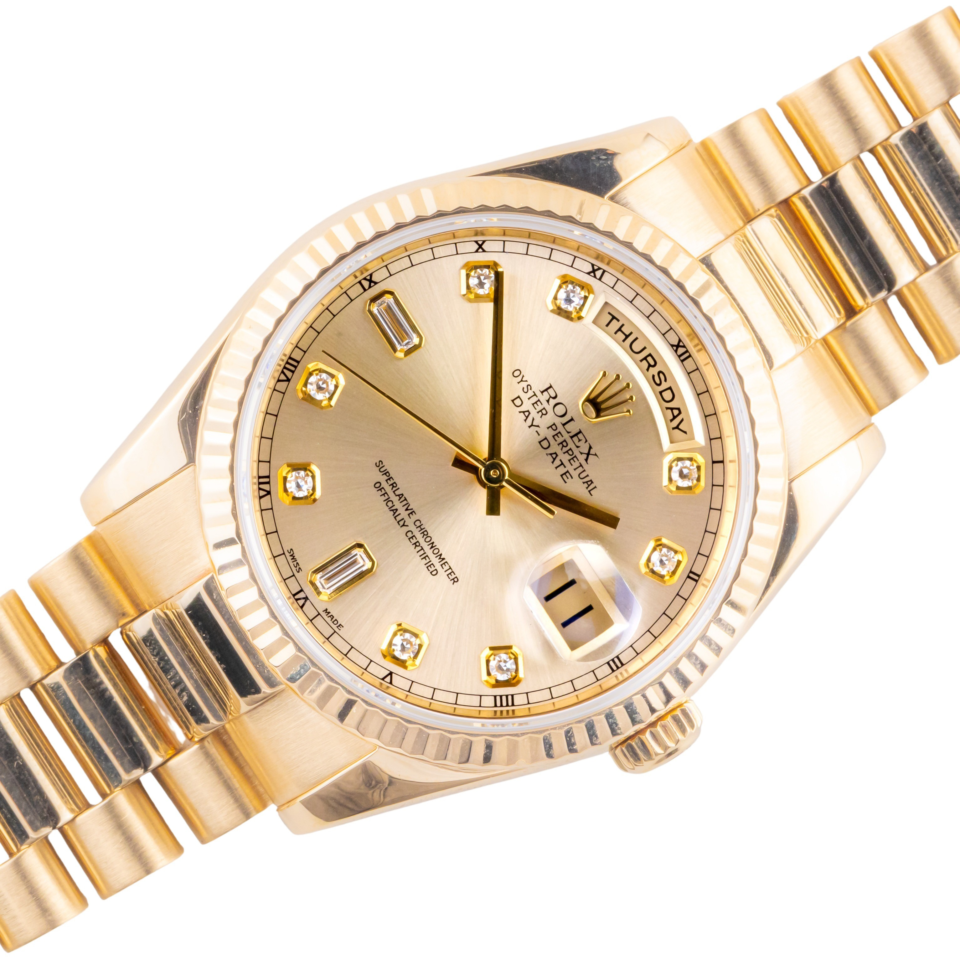 Rolex Oyster Perpetual Day-Date referentie 118238 uit 2001. De Day-Date 118238 bevat een 36mm 18k gouden kast, een 18k gouden President band met kroonsluiting en een fluted 18k gouden bezel. De Day-Date 118238 bevat een automatisch uurwerk kaliber 3155 met een dubbele quickset functie voor dag- en datum, een krasbestendig saffierglas en een zilveren wijzerplaat met diamanten markeringen. Het horloge wordt met de originele doos, papieren en handleiding boekjes geleverd.