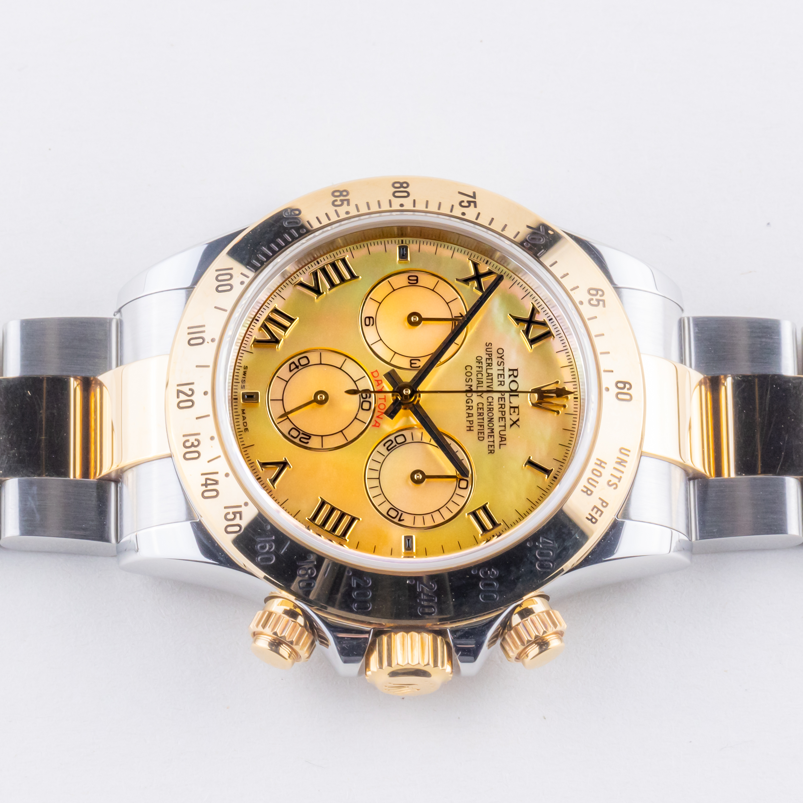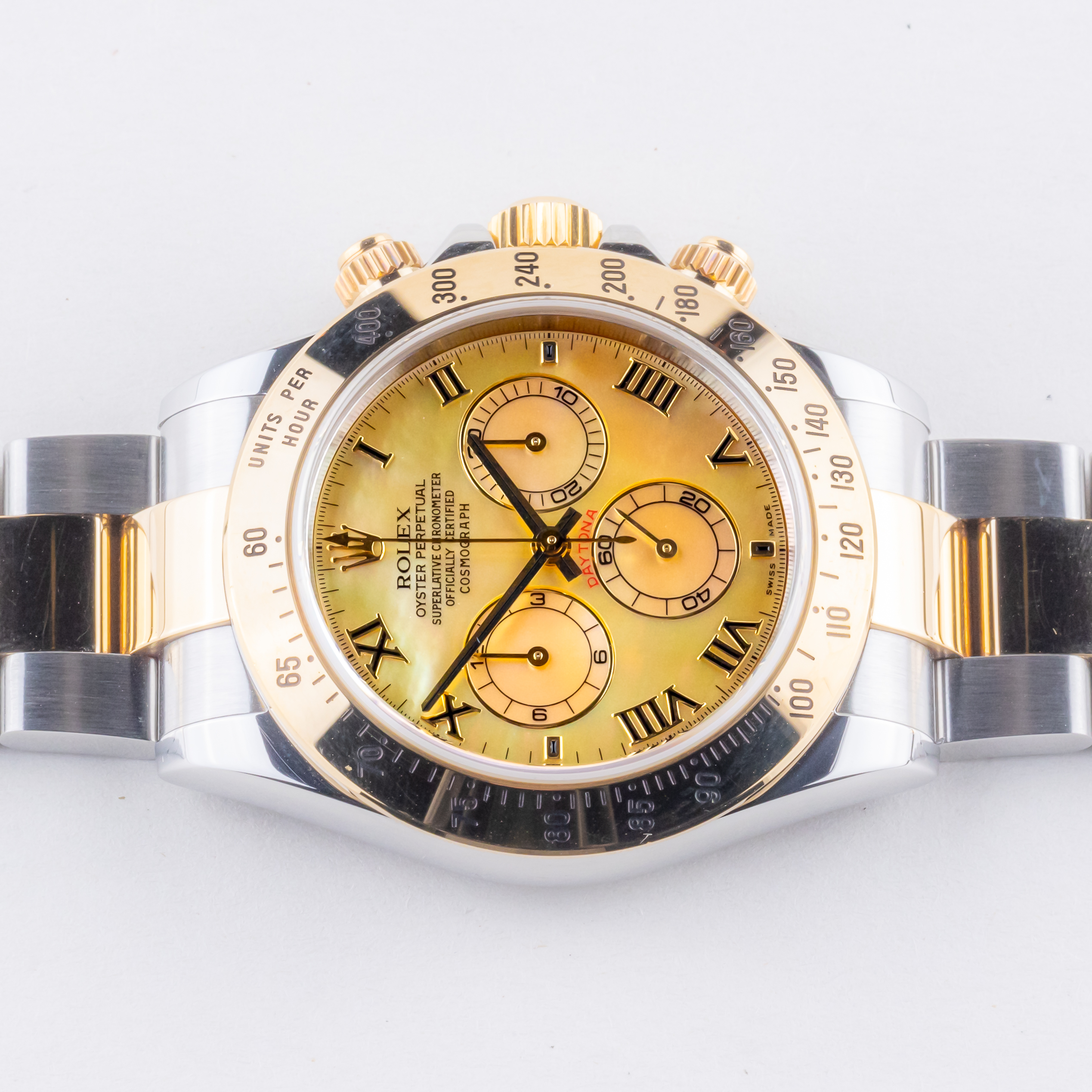 Rolex Daytona referentie 116523 uit 2003 inclusief volledige set. De Rolex Daytona 116523 heeft een gouden/roestvrijstalen kast van 40 mm, is voorzien van een gouden/roestvrijstalen Oysterband en bevat een gouden tachymeter bezel. De Rolex Daytona 116523 wordt aangedreven door een in-house kaliber 4130 uurwerk dat een chronograaf functie bevat waarmee activiteiten nauwkeurig en gemakkelijk getimed kunnen worden. Deze Daytona 116523 bevat een bijzondere MOP wijzerplaat met Romeinse markeringen. Het horloge wordt met de originele doos, Rolex papieren en Rolex service kaart geleverd.