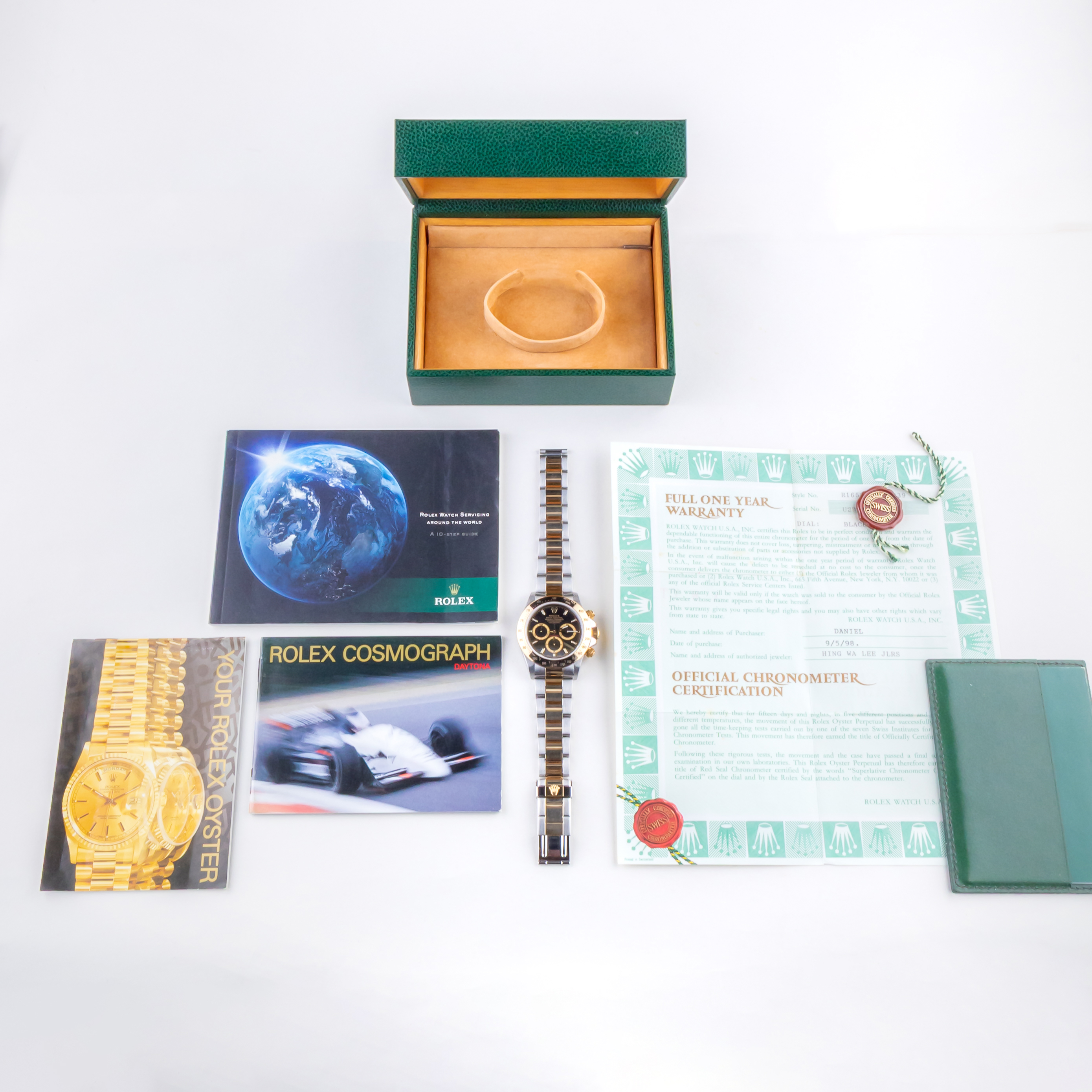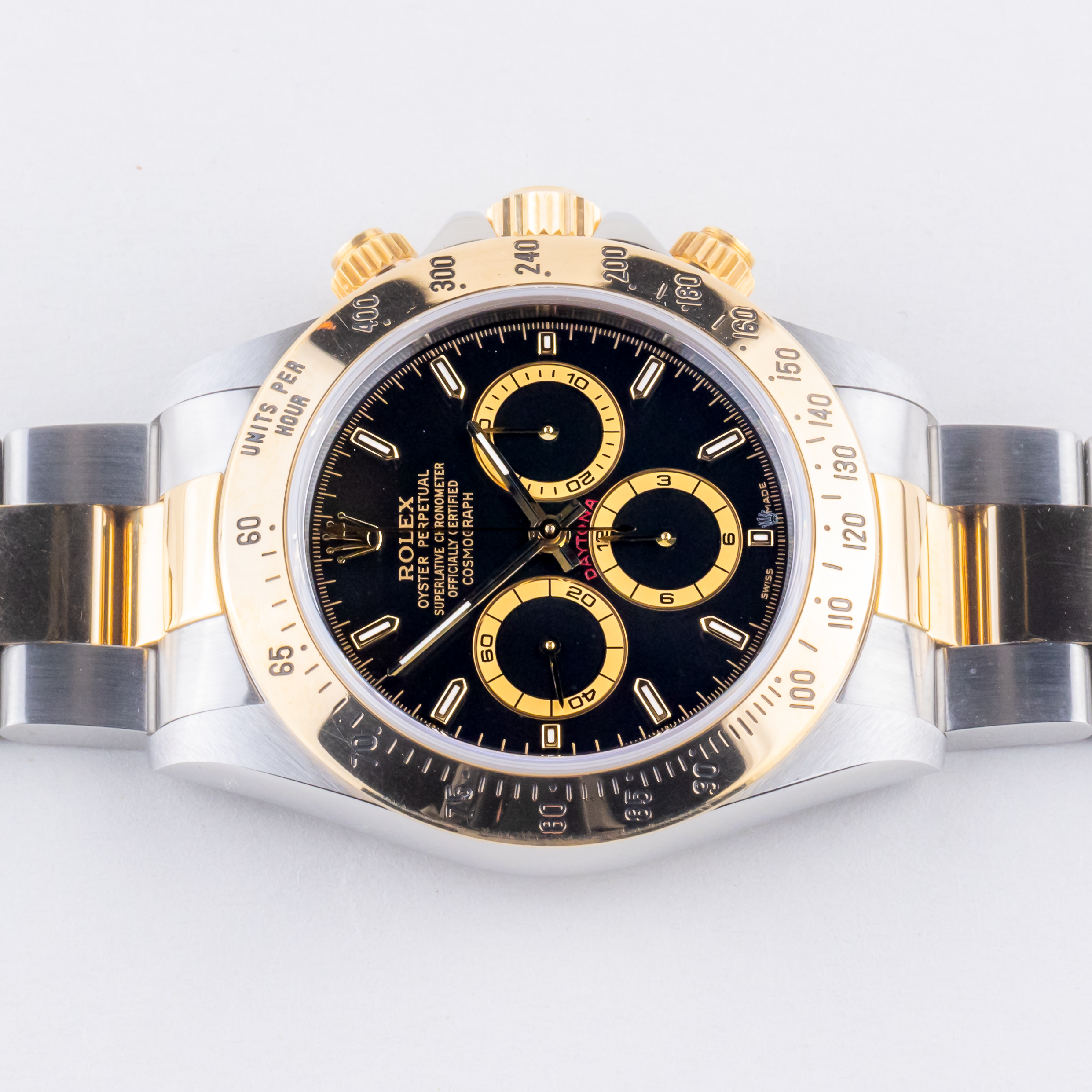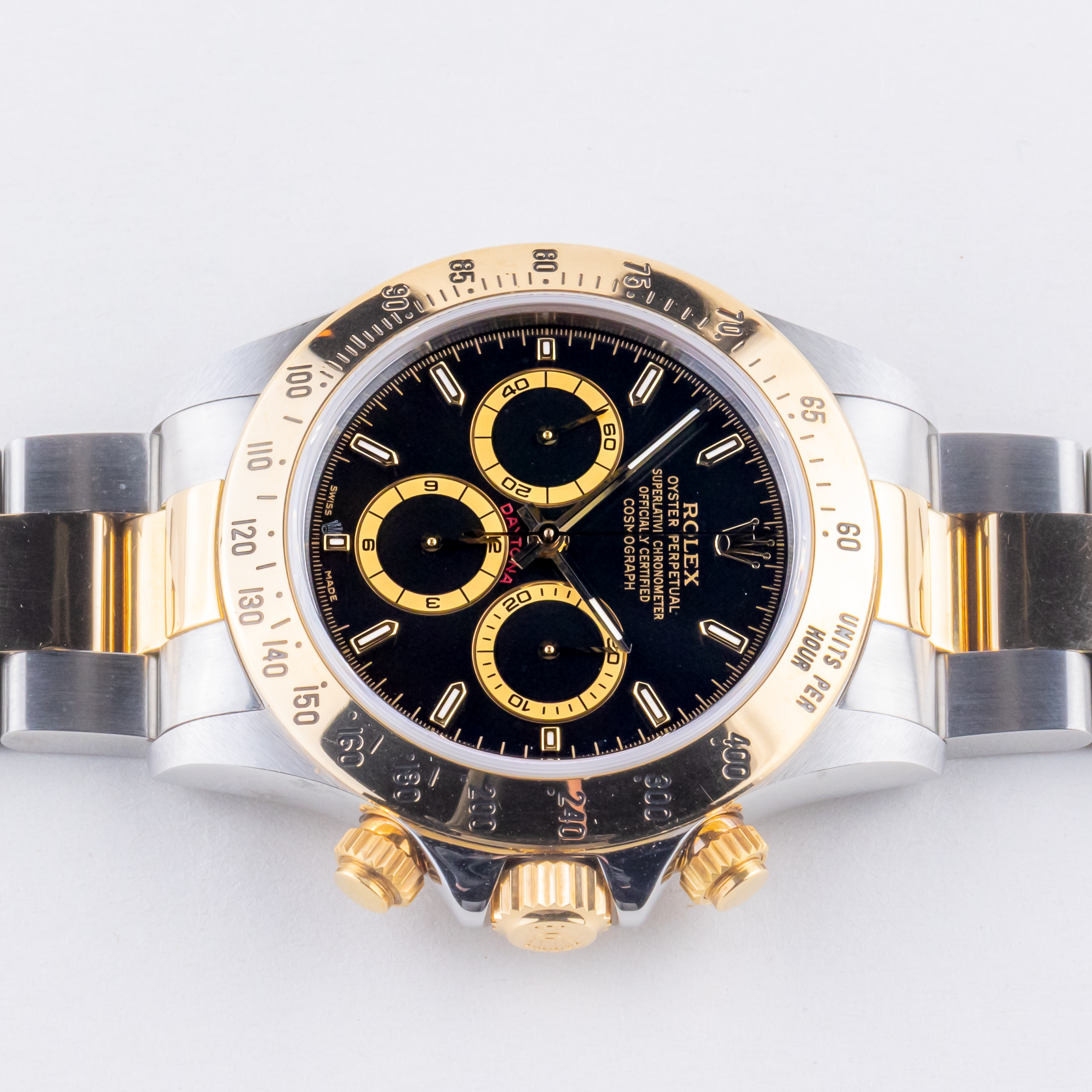 De Rolex Daytona referentie 16523 uit 1997 inclusief volledig set. De Rolex Daytona 16523 heeft een roestvrijstalen kast van 40 mm, een 18k geelgouden/ roestvrijstalen Oyster-armband en een geelgouden tachymeter. Verder wordt de Daytona 16523 aangedreven door een automatisch Zenith uurwerk kaliber 4030 en bevat de kast een krasbestendig saffierglas.