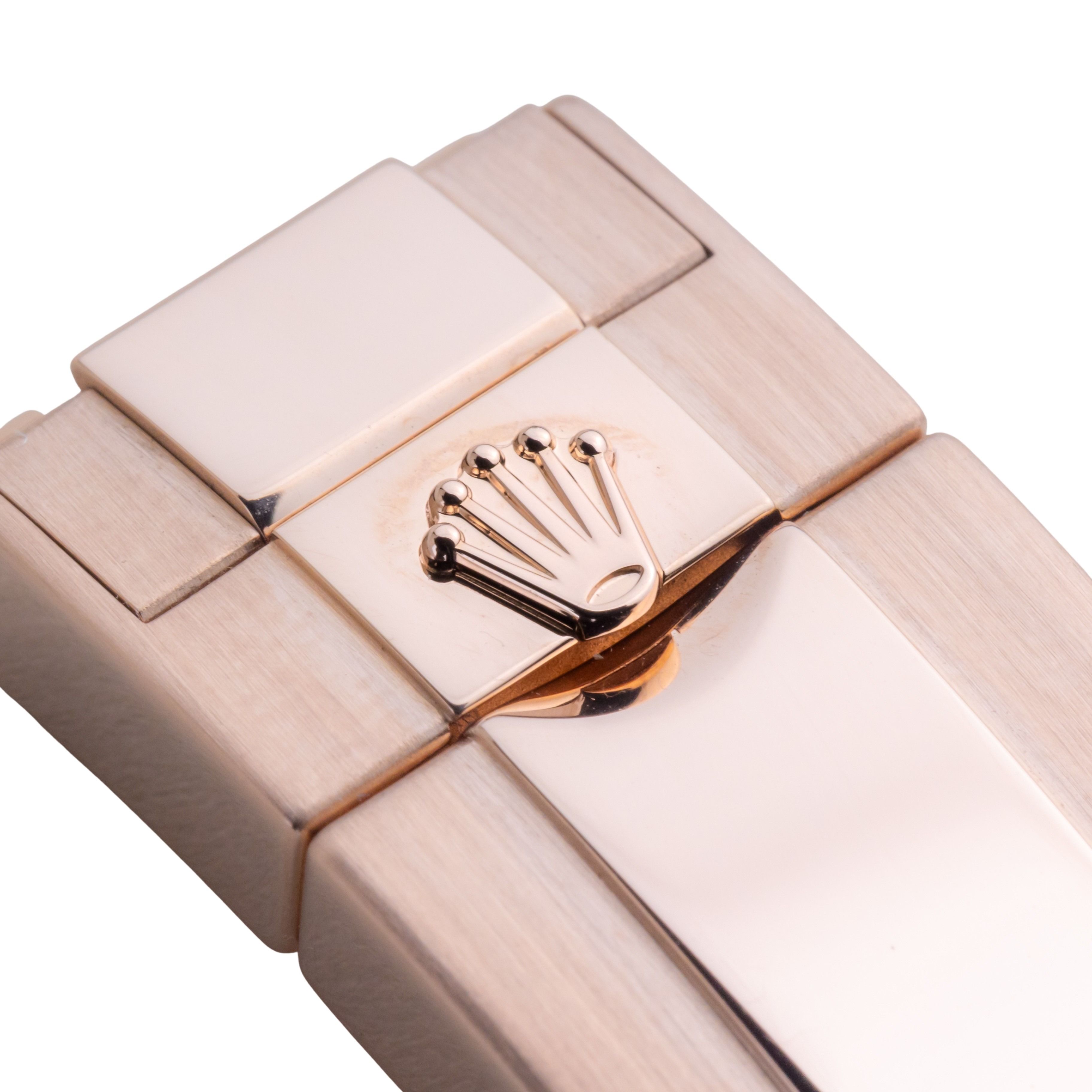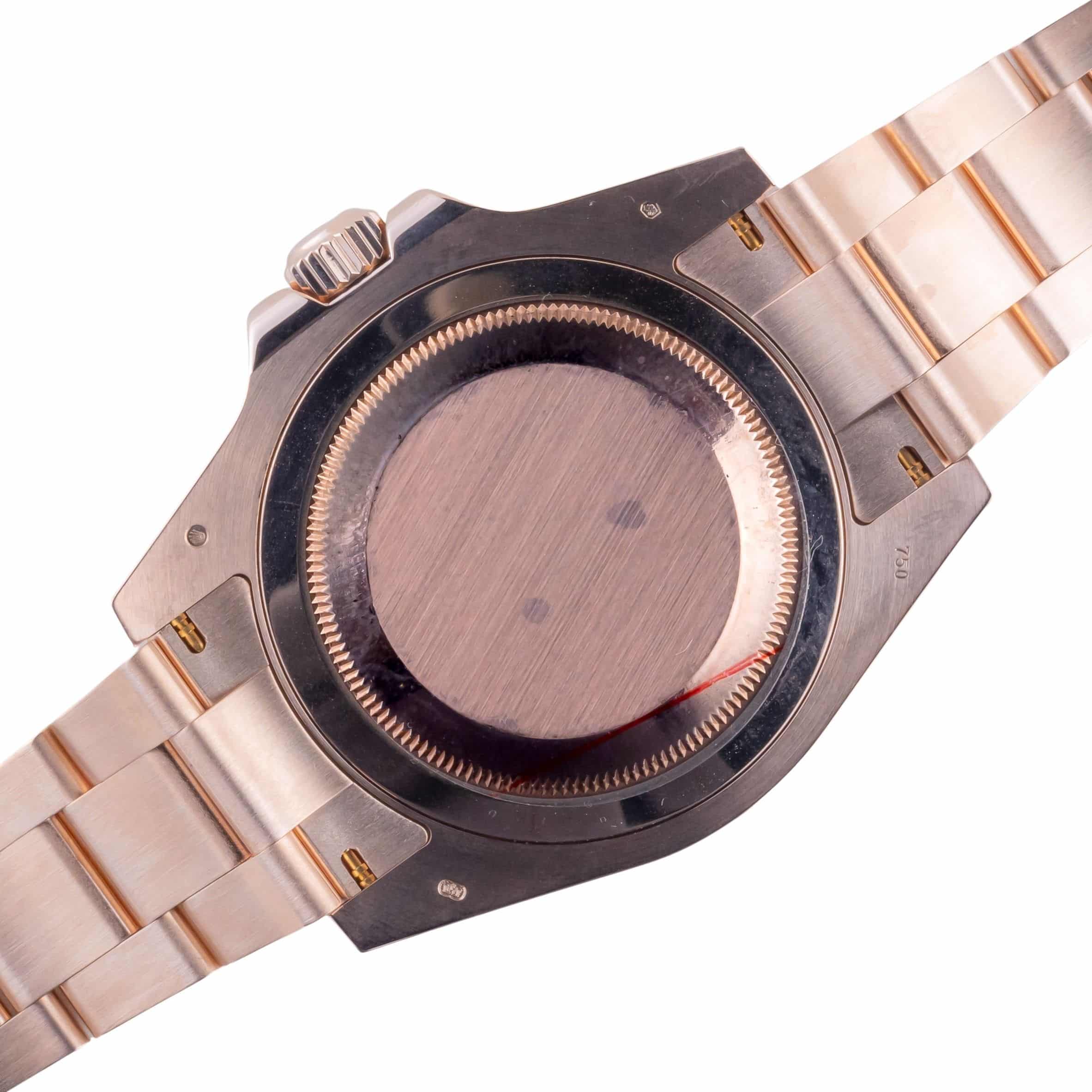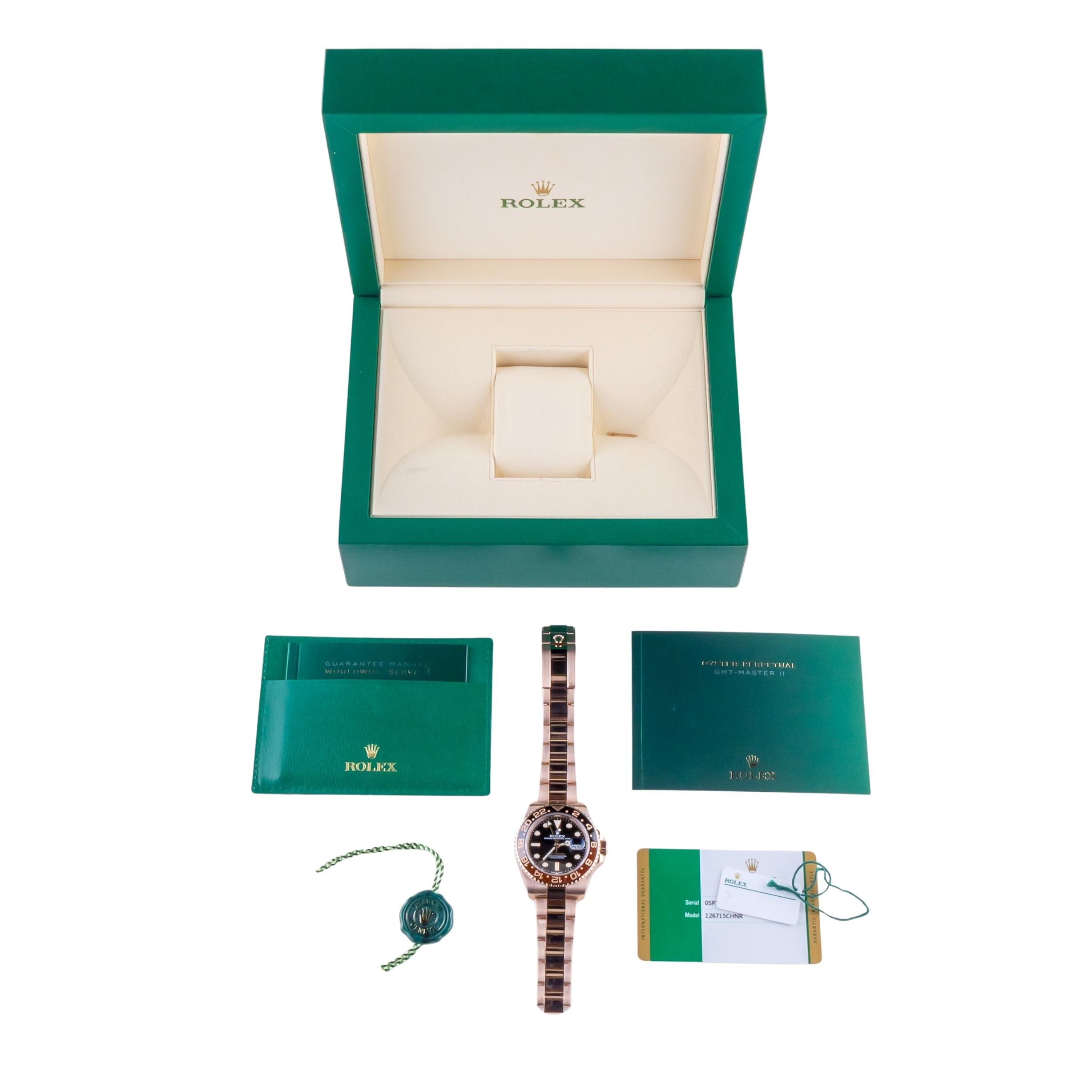 Rolex GMT-Master II reference 126715CHNR uit 2020. De Rolex GMT-Master II 126715CHNR bevat een 40mm rosegouden kast, een rosegouden Oyster band met Oystersluiting en een verdraaibare keramische bezel. Deze GMT-Master II 126715CHNR bevat een automatisch uurwerk kaliber 3285 met een quickset datumfunctie, een krasvrij saffierglas en zwarte wijzerplaat met chromalight display. Het horloge wordt met de originele doos, Rolex card, handleidingboekjes en 5-jaar Rolex garantie geleverd.