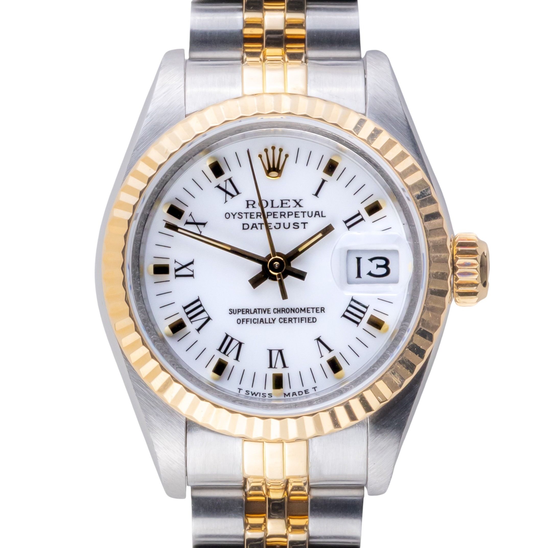 Rolex Oyster Perpetual Lady-Datejust referentie 69173 afkomstig uit 1989 inclusief volledige set. De lady-Datejust 69173 bevat een 26mm goud/stalen kast, een goud/stalen jubilee band met vouwsluiting en fluted bezel van 14k geelgoud. Deze 69173 bevat een automatisch uurwerk kaliber 2135 met een quickset datumfunctie, een kras bestendig saffierglas en een witte wijzerplaat met tritium hands en Romeinse markeringen. Het horloge wordt met de originele doos en papieren geleverd.