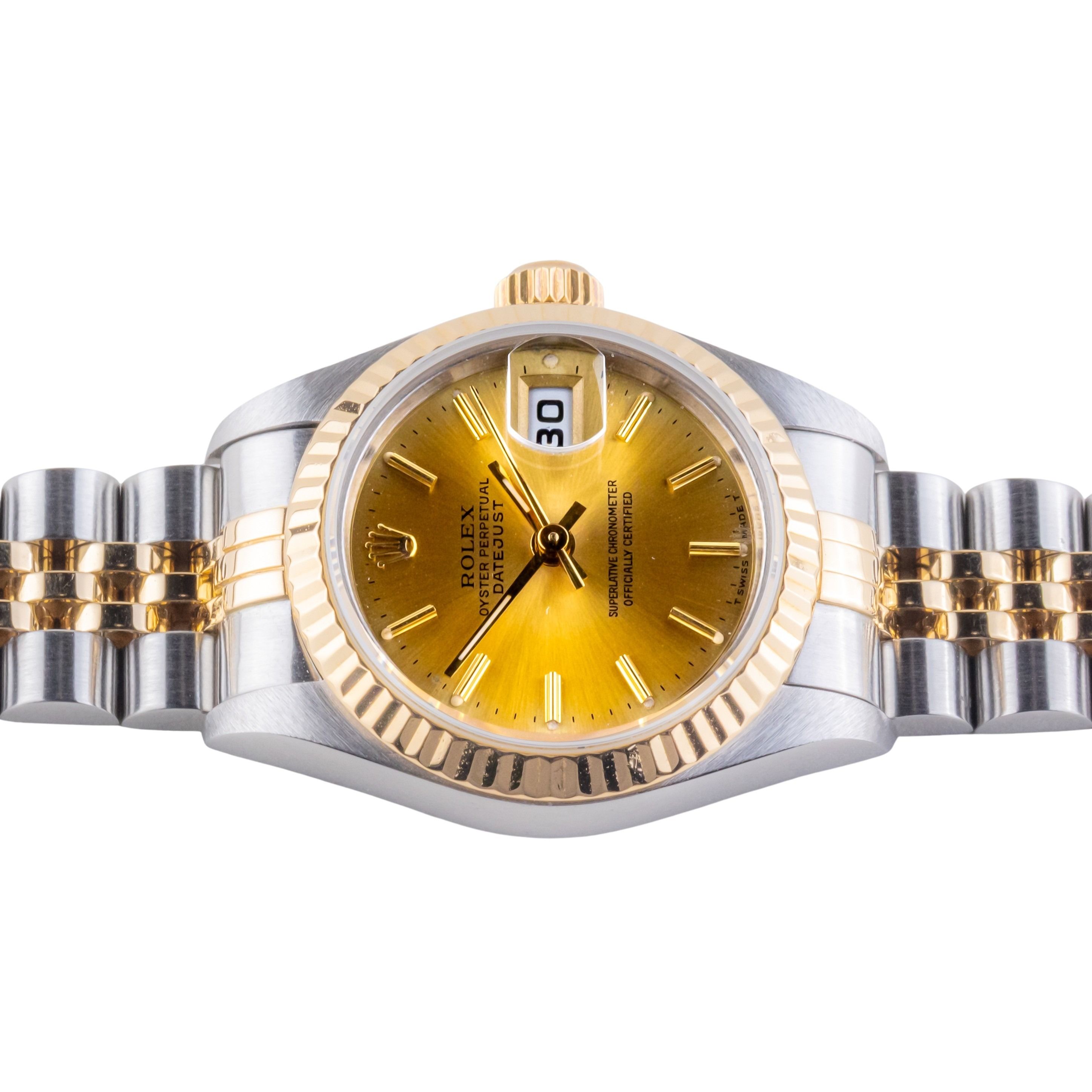 Rolex Oyster Perpetual Lady-Datejust referentie 69173 afkomstig uit 1995. De lady-Datejust 69173 bevat een 26mm goud/stalen kast, een goud/stalen jubilee band met vouwsluiting en fluted bezel van 14k geelgoud. Deze 69173 bevat een automatisch uurwerk kaliber 2135 met een quickset datumfunctie, een kras bestendig saffierglas en een champagne wijzerplaat met tritium hands. Het horloge wordt met de originele doos en papieren geleverd.