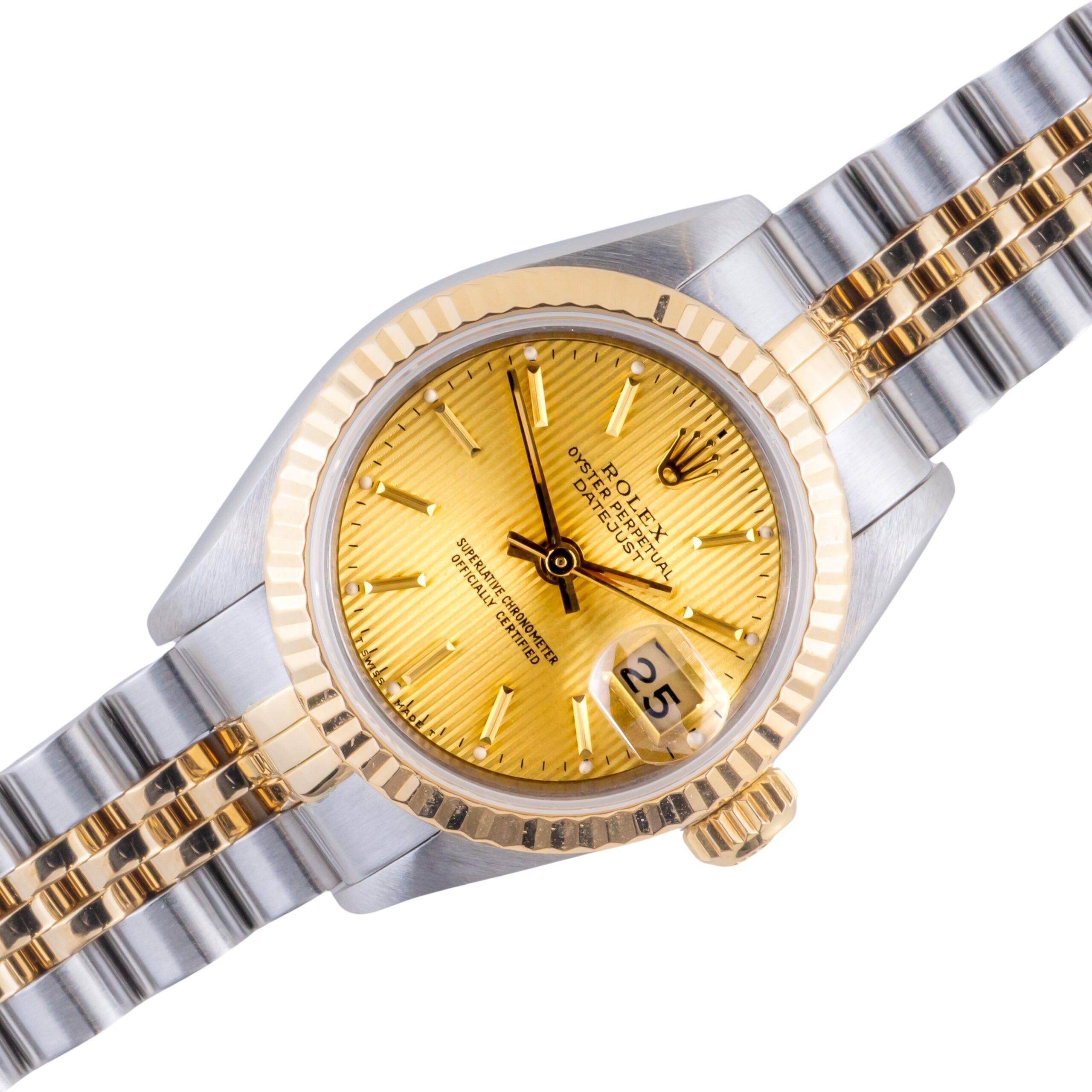 Rolex Oyster Perpetual Lady-Datejust referentie 69173 afkomstig uit 1989. De lady-Datejust 69173 bevat een 26mm goud/stalen kast, een goud/stalen jubilee band met vouwsluiting en fluted bezel van 14k geelgoud. Deze 69173 bevat een automatisch uurwerk kaliber 2135 met een quickset datumfunctie, een kras bestendig saffierglas en een champagne Tapestry wijzerplaat met tritium hands. Het horloge wordt met de originele doos en papieren geleverd.