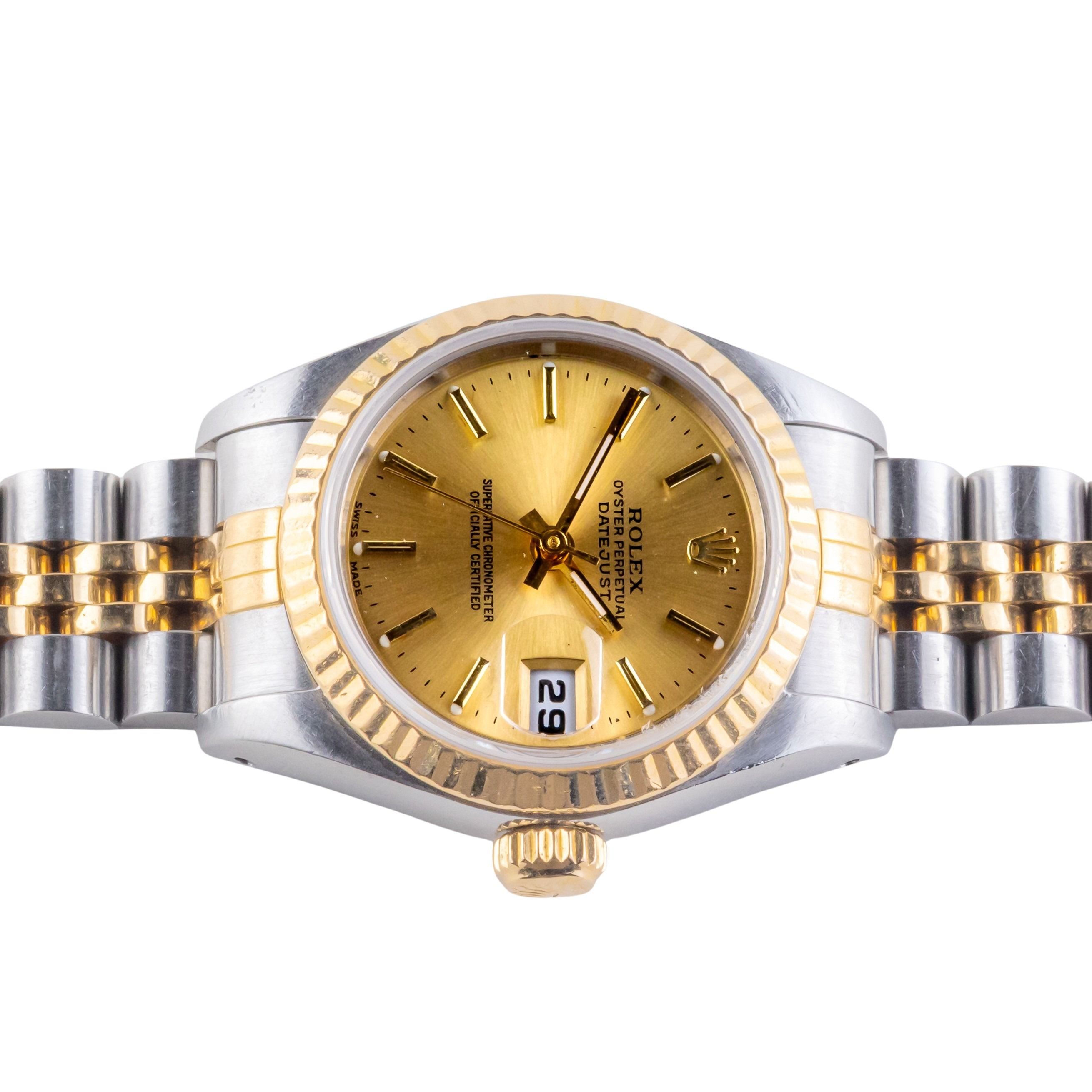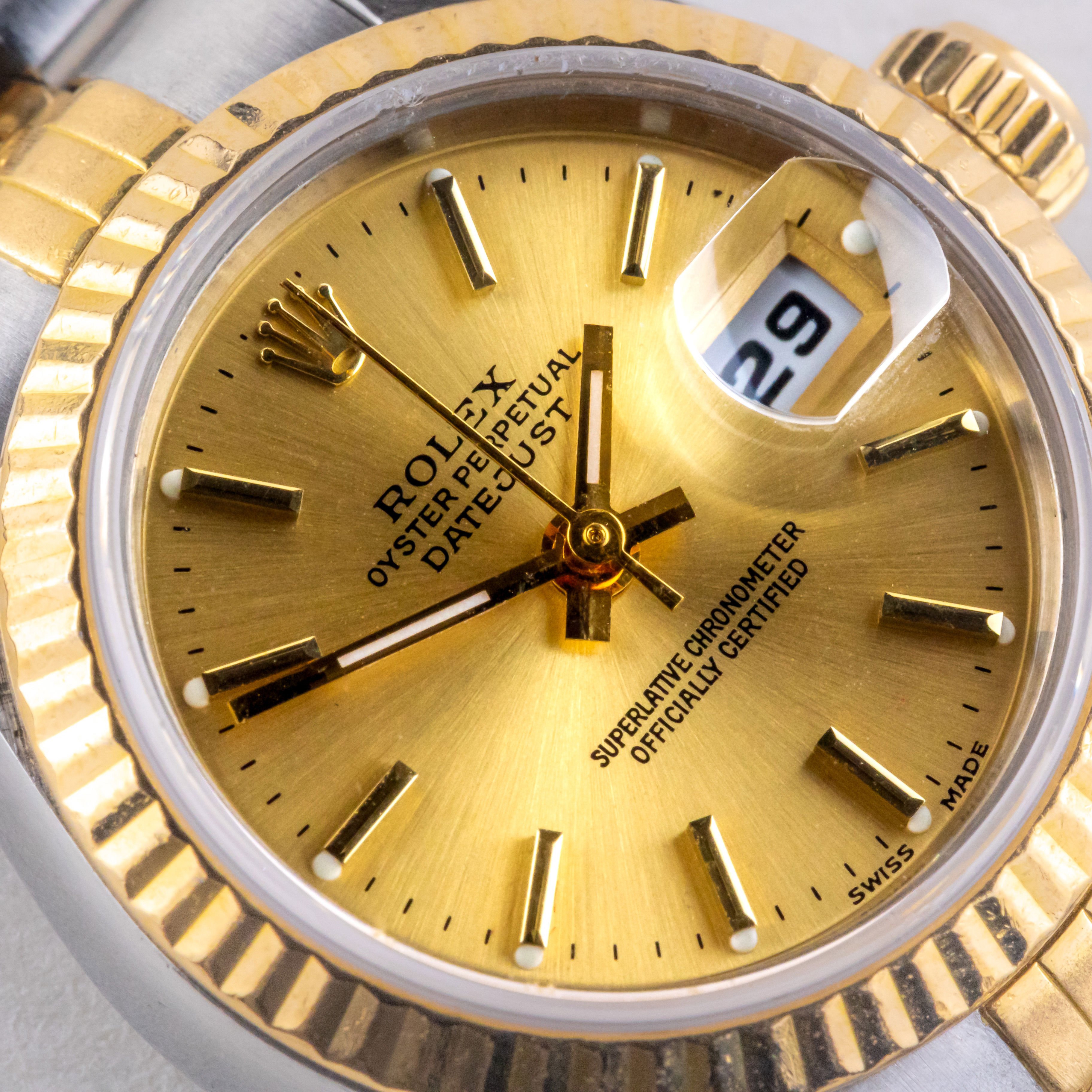 Rolex Oyster Perpetual Lady-Datejust referentie 69173 afkomstig uit 1990. De lady-Datejust 69173 bevat een 26mm goud/stalen kast, een goud/stalen jubilee band met vouwsluiting en fluted bezel van 14k geelgoud. Deze 69173 bevat een automatisch uurwerk kaliber 2135 met een quickset datumfunctie, een kras bestendig saffierglas en een champagne wijzerplaat met tritium hands. Het horloge wordt met de originele doos en papieren geleverd.