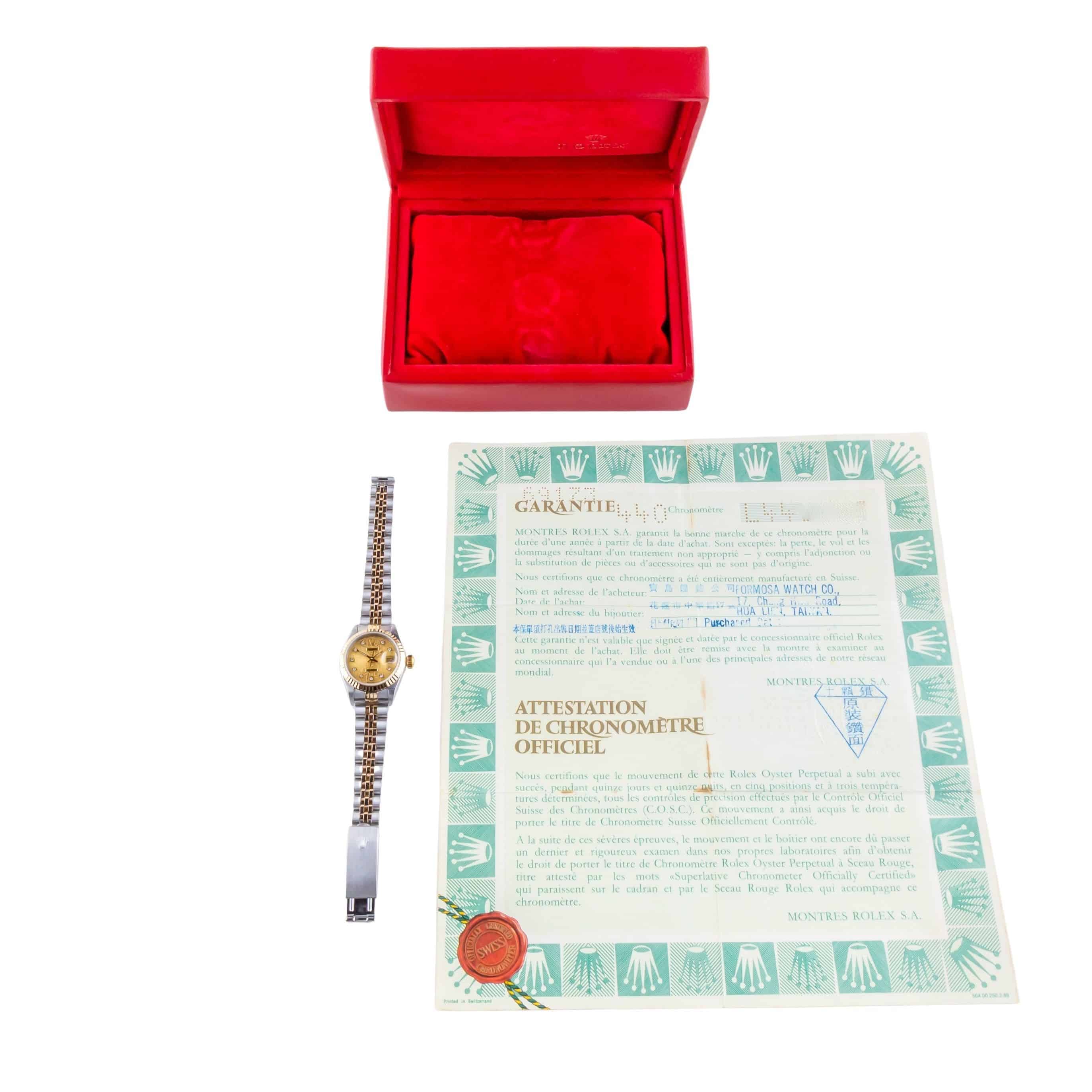 Rolex Oyster Perpetual Lady-Datejust referentie 69173 afkomstig uit 1989. De lady-Datejust 69173 bevat een 26mm goud/stalen kast, een goud/stalen jubilee band met vouwsluiting en fluted bezel van 14k geelgoud. Deze 69173 bevat een automatisch uurwerk kaliber 2135 met een quickset datumfunctie, een kras bestendig saffierglas en champagne wijzerplaat met diamanten index. Het horloge wordt met de originele doos en papieren geleverd.