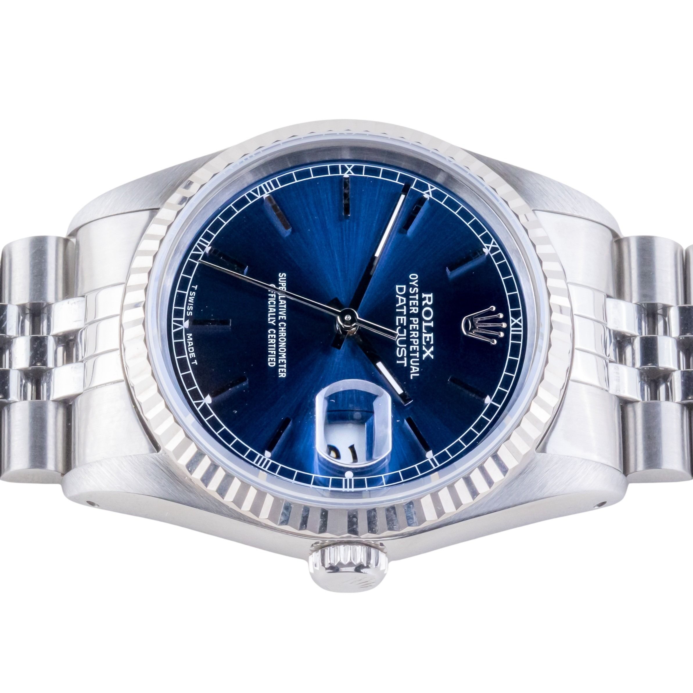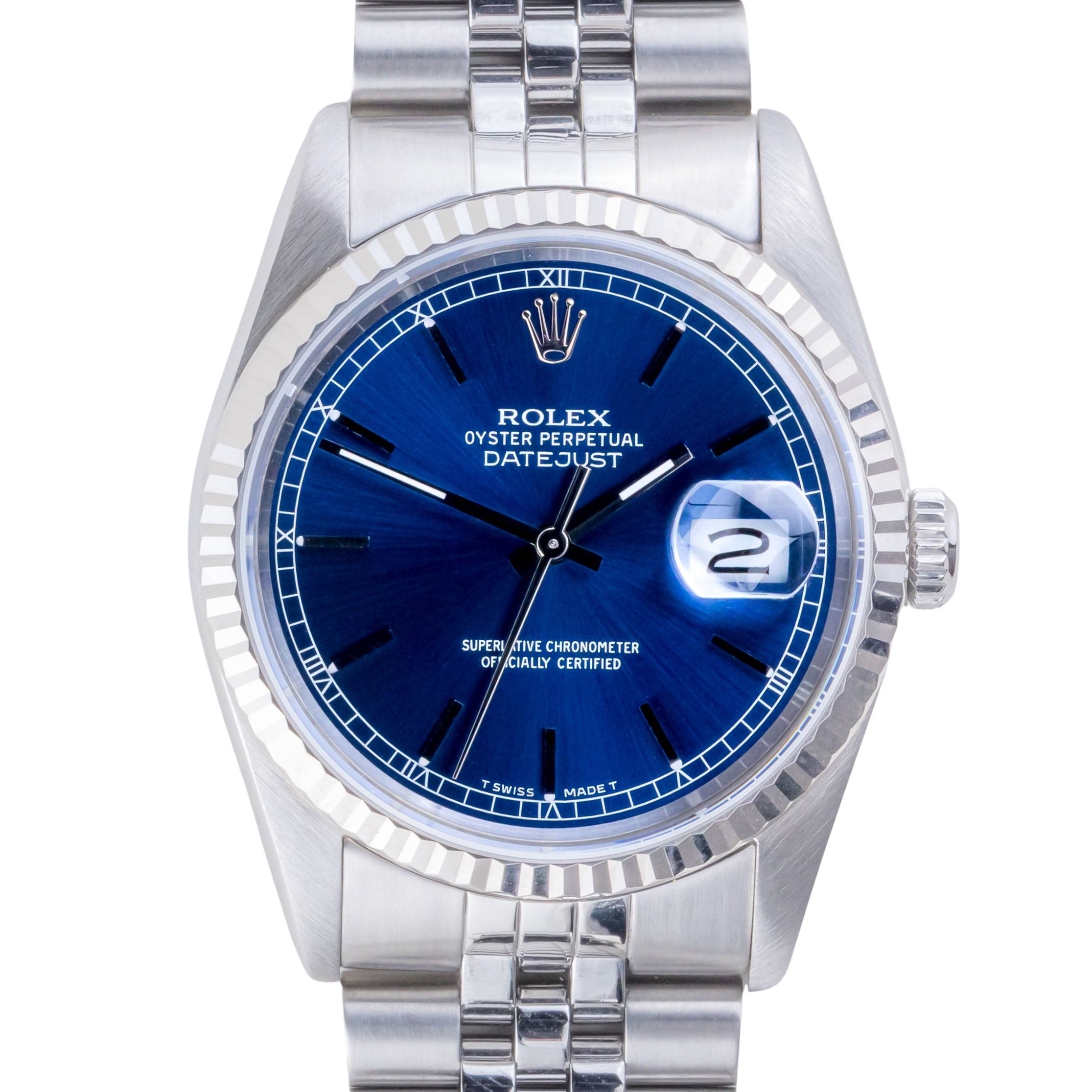 Lees meer...De Rolex Datejust 16234 die wij aanbieden komt uit 1990 en loopt op het automatische 3135 uurwerk van Rolex. Dit zeer betrouwbare uurwerk zit in een robuuste 36mm oystercase met de kenmerkende 18kt witgouden fluted bezel. Daarnaast heeft dit horloge een prachtige blauwe wijzerplaat met Romeinse minute track. De geweldige afwerking van de wijzerplaat is iets waar de Datejust bekend om staat. De jubilee band is voorzien van de sterke vouwsluiting met kenmerkende Rolex kroon.