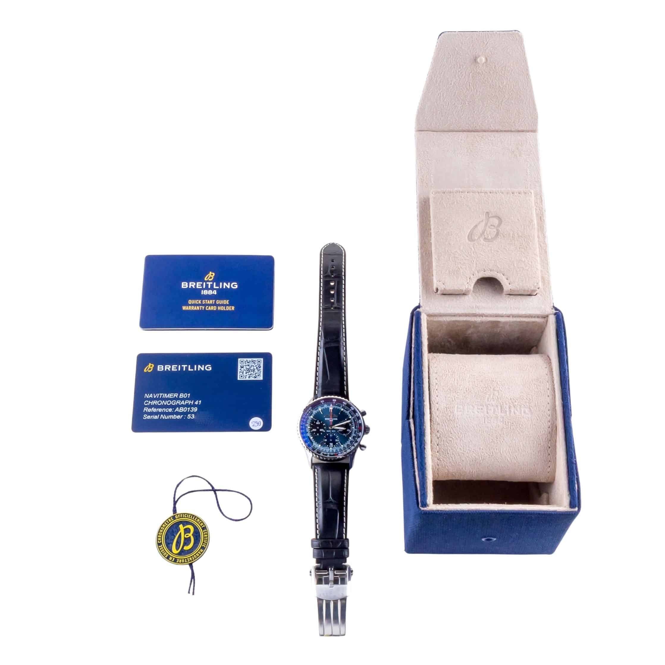 Breitling Navitimer reference AB0139 from 2025 including full set. The Navitimer AB0139 features a 43mm stainless steel case, a stainless steel bracelet and the iconic circular slide rule bezel that defines the Navitimer collection. This Breitling Navitimer AB0139 is equipped with an automatic chronograph movement and a scratch-resistant sapphire crystal, complemented by a striking blue dial.