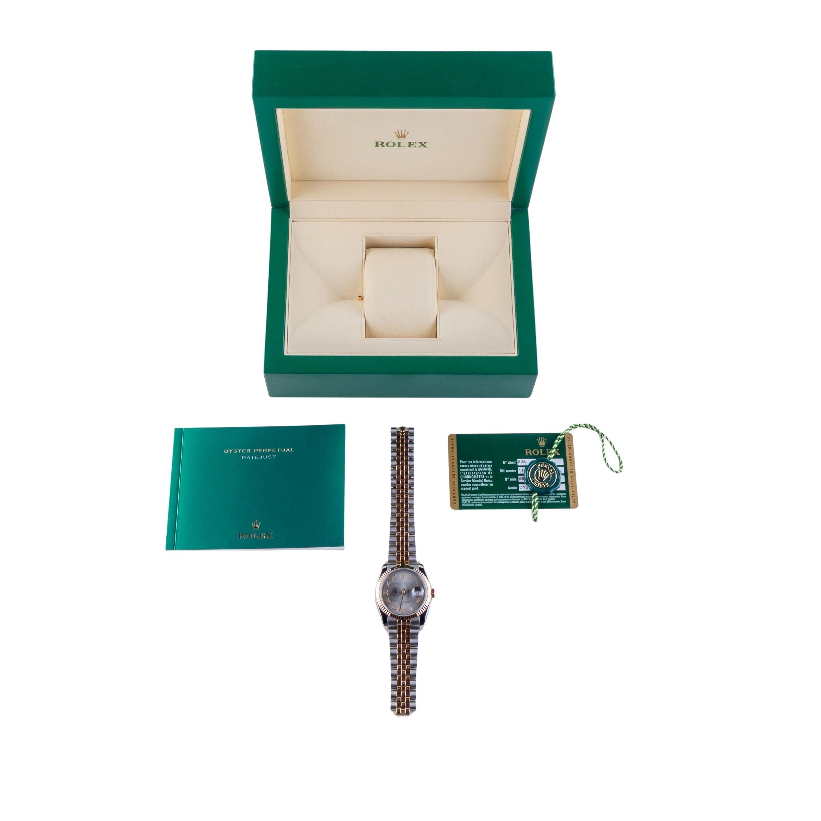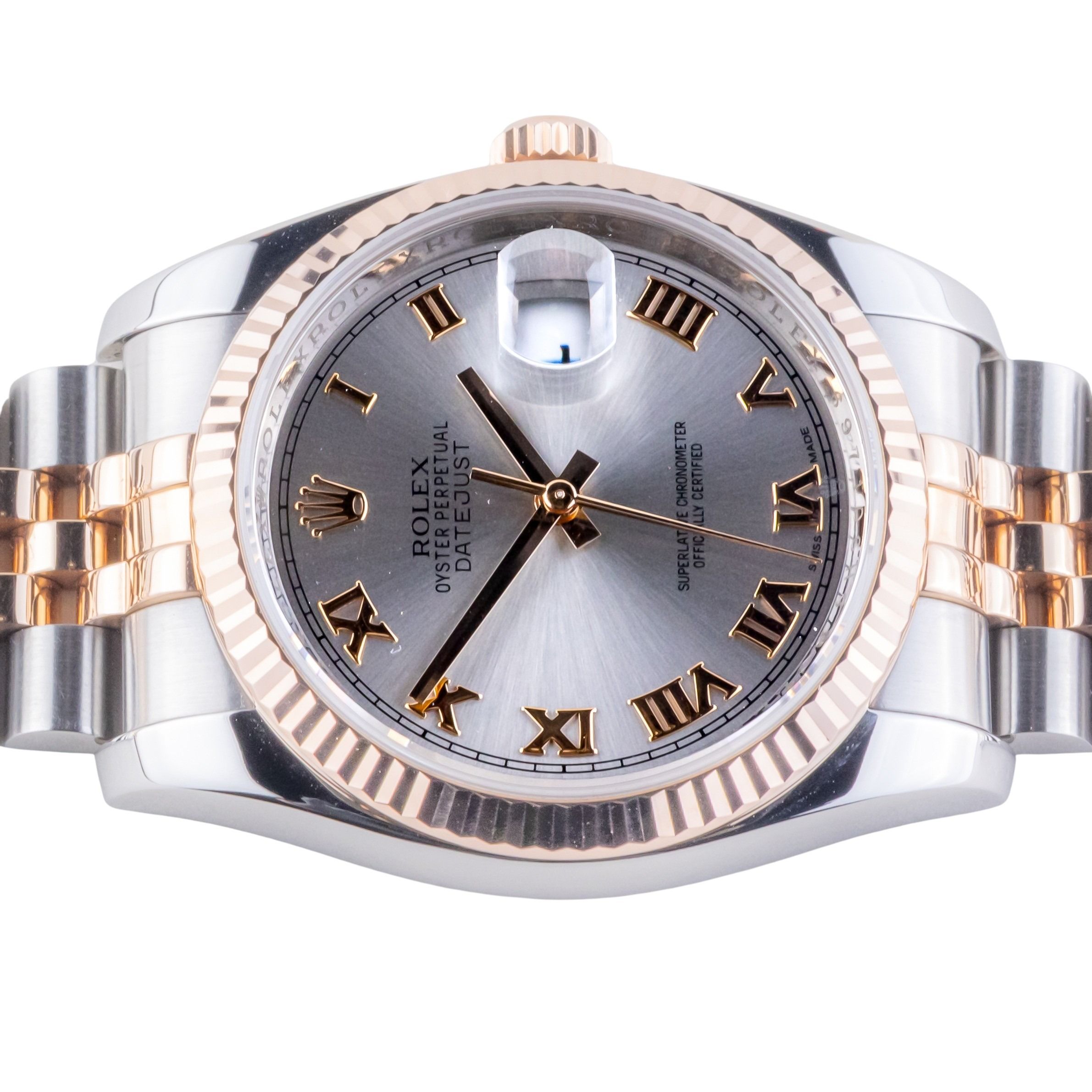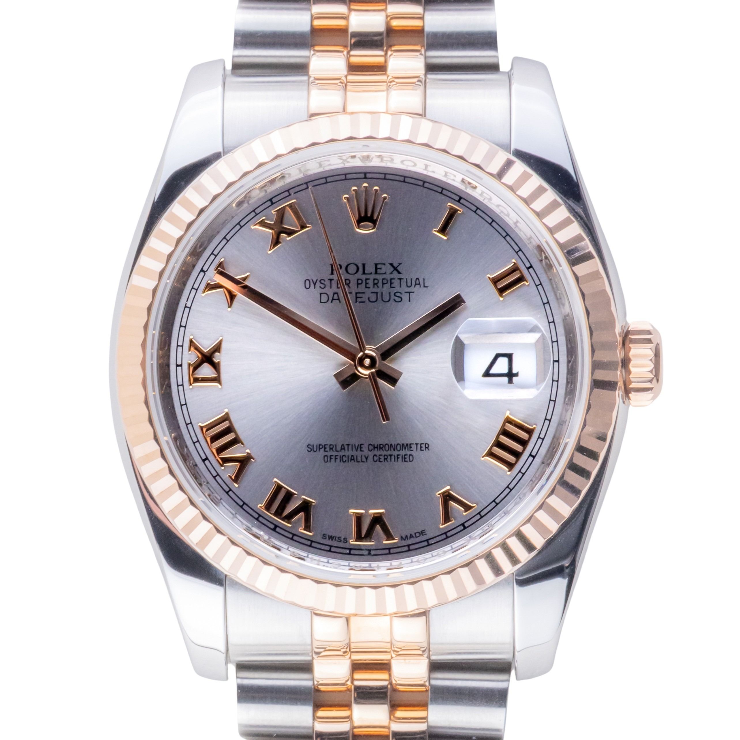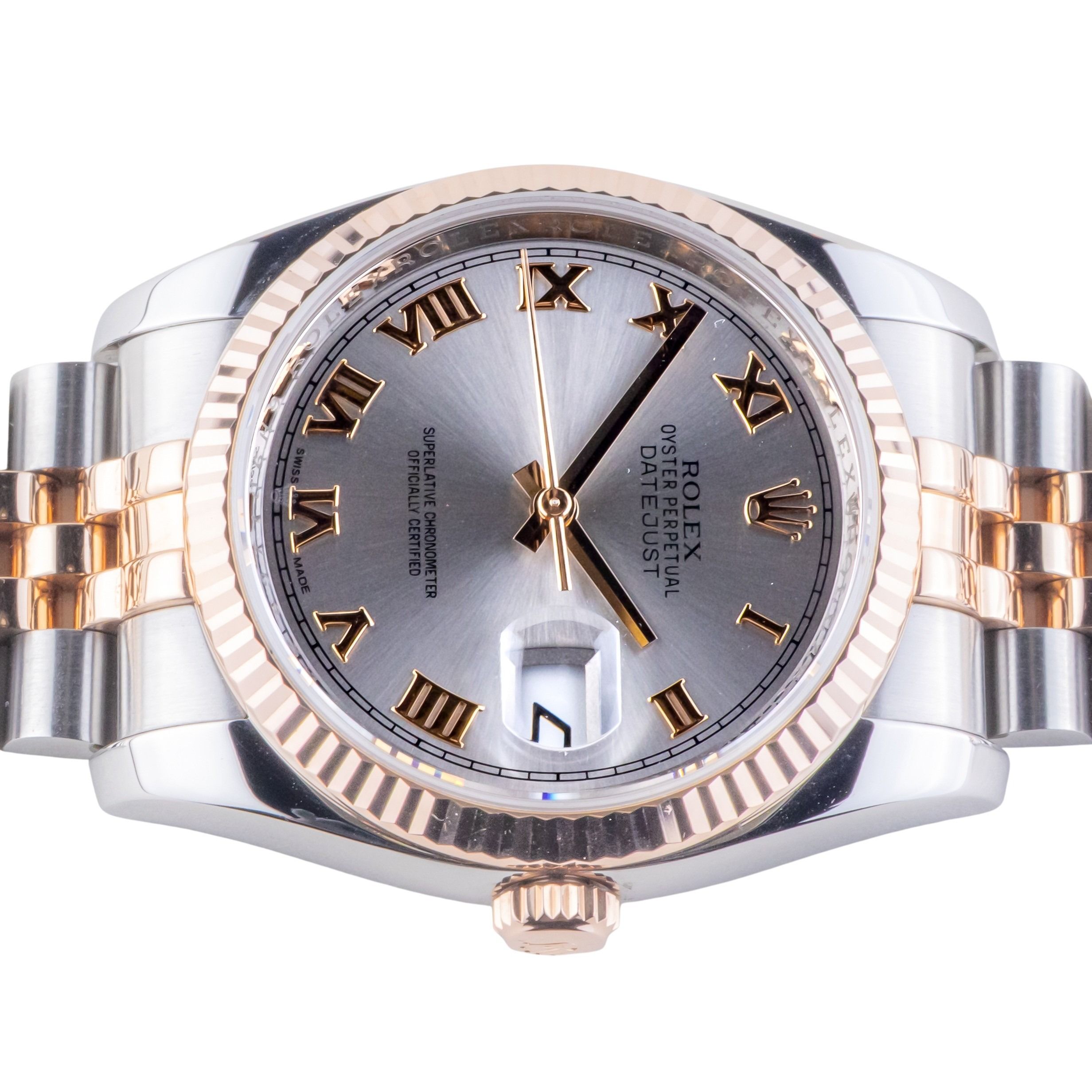 Rolex Oyster Perpetual Datejust reference 116231 from 2015 including full set. The Datejust 116233 measures a 36mm rose gold and stainless steel case, a two-tone Jubilee bracelet with crownclasp and fluted 18k rose gold bezel. This Datejust 116231 features an automatic movement caliber 3135 with quickset date function, a scratch resistance sapphire crystal and a grey colored dial with Roman markers.