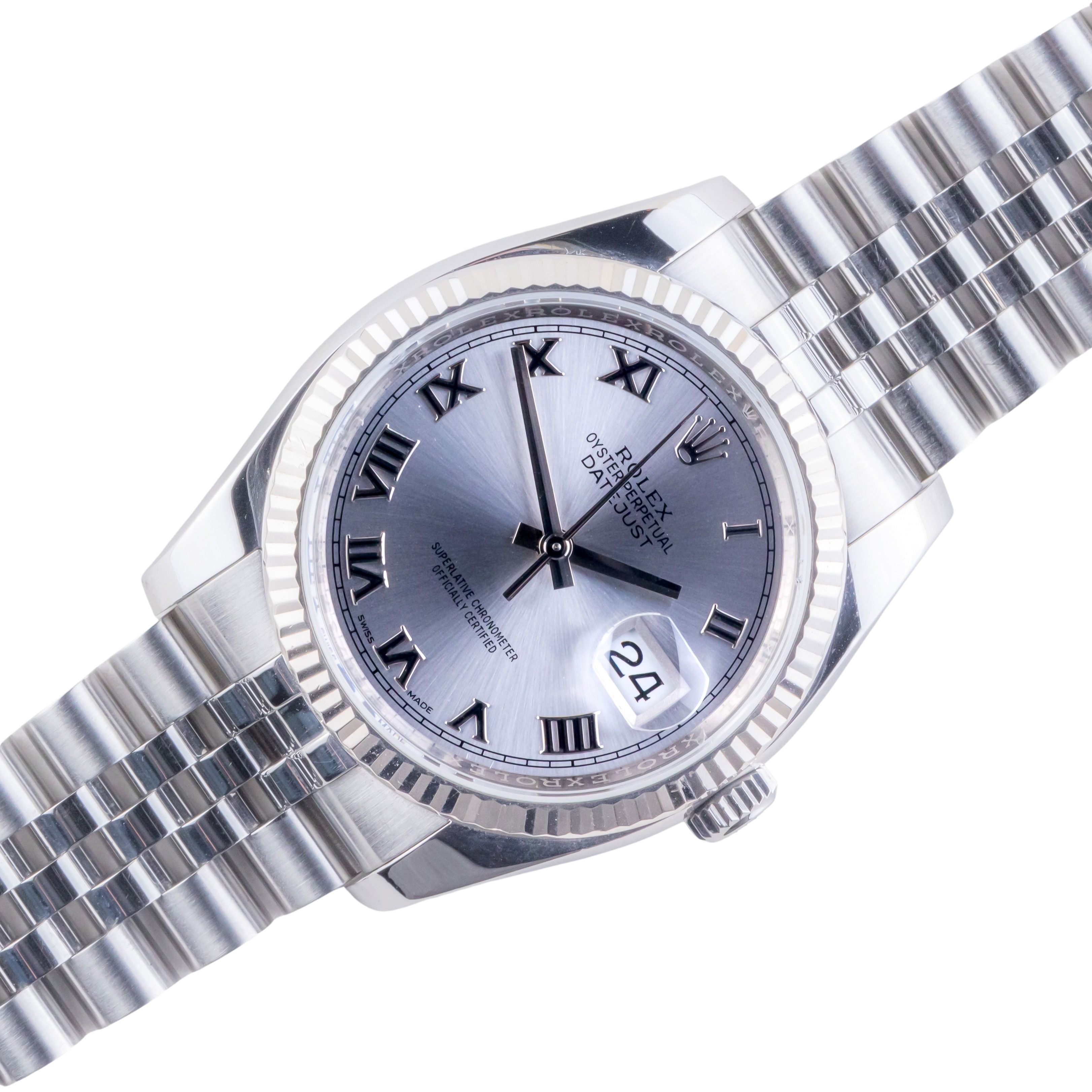 Rolex Oyster Perpetual Datejust reference 116234 from 2017 including full set. The Datejust 116234 measures a 36mm stainless steel case, a stainless steel Jubilee bracelet w/ concealed crownclasp and a fluted 18k white gold bezel. This Datejust 116234 features an automatic movement caliber 3135 with quickset date function, a scratch resistance sapphire crystal and a silver-colored stick dial with Roman markers.Every pre-owned watch we sell, comes with a 12-month warranty from the date of purchase. Every watch sold by Langedyk Vintage Watches is included with a LVW watch box, Authenticity report and free worldwide (insured) shipment.If you have any inquiries or would like to receive additional information about this watch, please feel free to contact us by phone or email. We will respond to your request as soon as possible.Please also have a look at our full collection of Rolex Datejust watches.