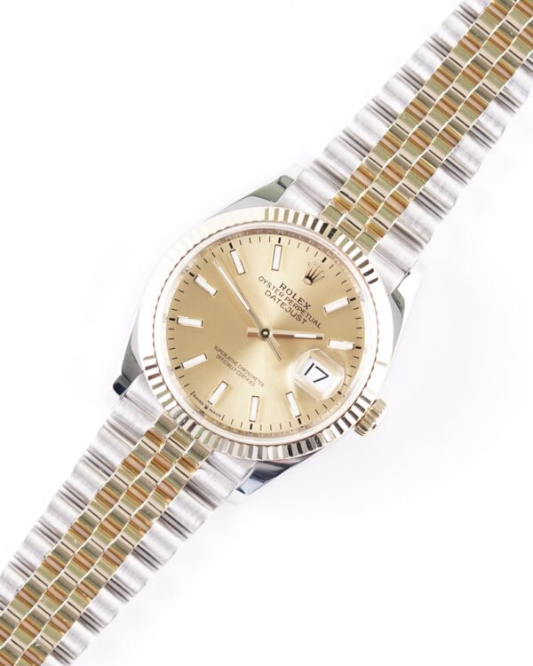 NEW Rolex Oyster Perpetual Datejust reference 126333 from 2022 including full set. The Datejust 126333 measures a 36mm gold and stainless steel case, a two-tone Oyster bracelet with crownclasp and fluted 18k gold bezel. This Datejust 126333 features an automatic movement caliber 3235 with quickset date function, a scratch resistance sapphire crystal and a champagne dial.