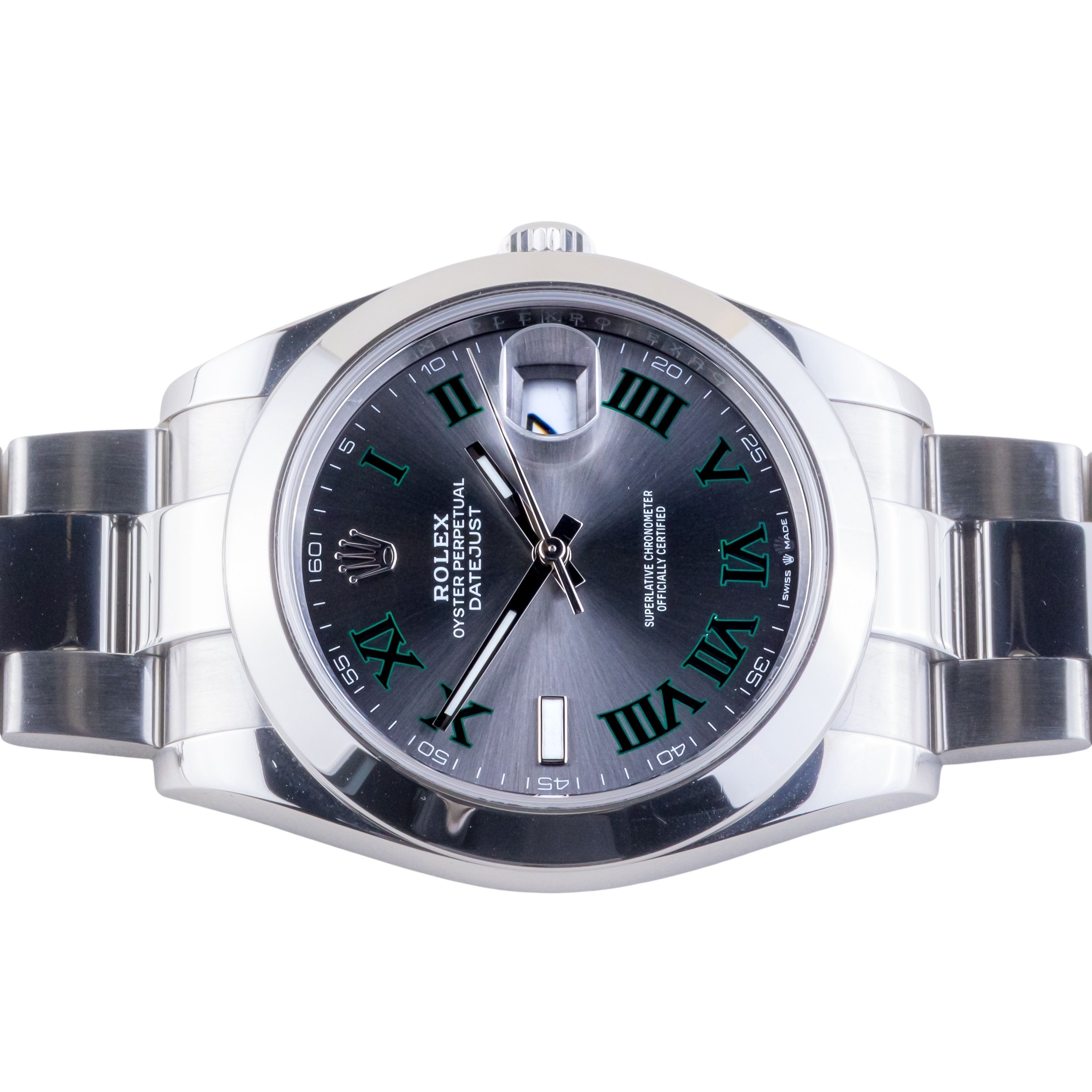 Rolex Oyster Perpetual Datejust reference 126300 from 2023 including full set. The Datejust 126300 measures a 41mm stainless steel case, a stainless steel (904L) Oyster bracelet with Oysterclasp and a smooth stainless steel bezel. This Datejust 126300 features an automatic movement caliber 3235 with a quickset date function, a scratch resistance sapphire crystal and Wimbledon dial with Roman markers.