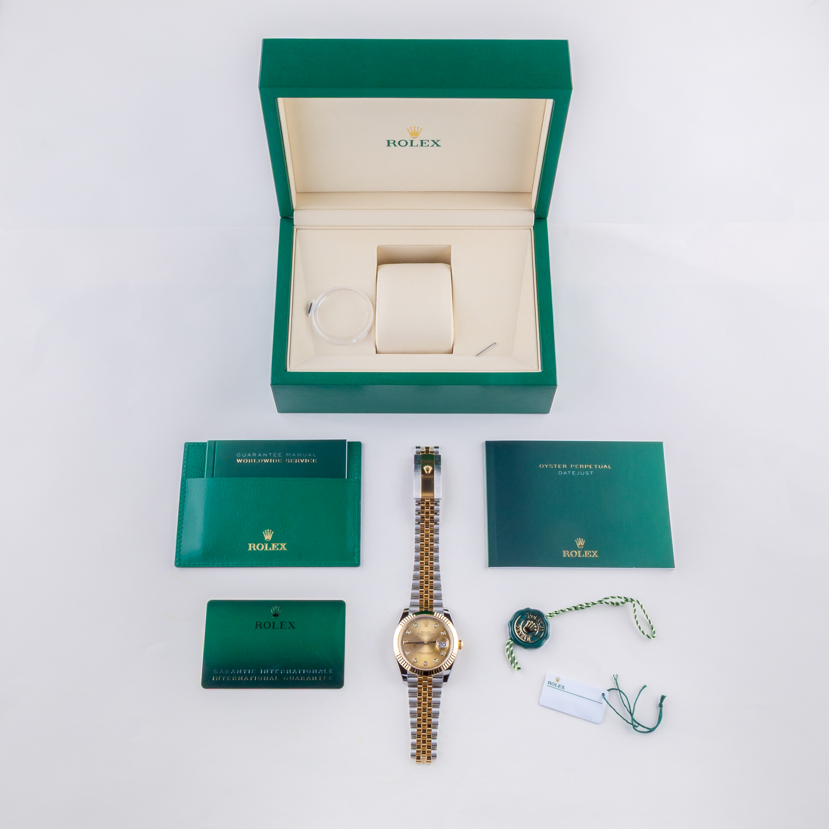 NEW Rolex Oyster Perpetual Datejust reference 126333 from 2025 including full set. The Datejust 126333 measures a 36mm gold and stainless steel case, a two-tone Jubilee bracelet with crownclasp and fluted 18k gold bezel. This Datejust 126333 features an automatic movement caliber 3235 with quickset date function, a scratch resistance sapphire crystal and a champagne dial with diamond markers.