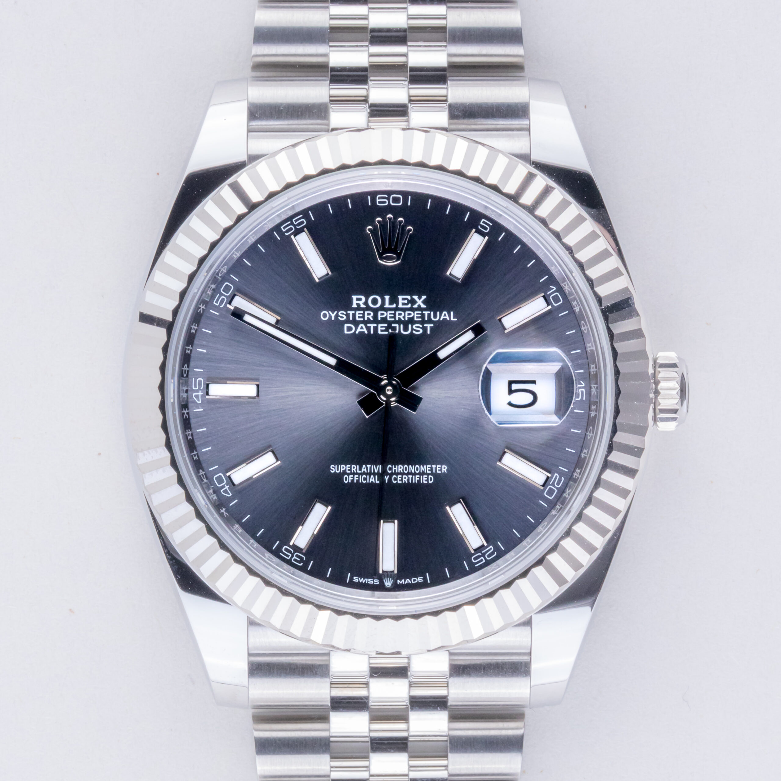 NEW Rolex Oyster Perpetual Datejust reference 126334 from 2025 including full set. The Datejust 126334 measures a 41mm stainless steel case, a stainless steel (904L) Jubilee bracelet with Oysterclasp and a fluted 18K white gold bezel. This Datejust 126334 features an automatic movement caliber 3235 with a quickset date function, a scratch resistance sapphire crystal and a rhodium dial.